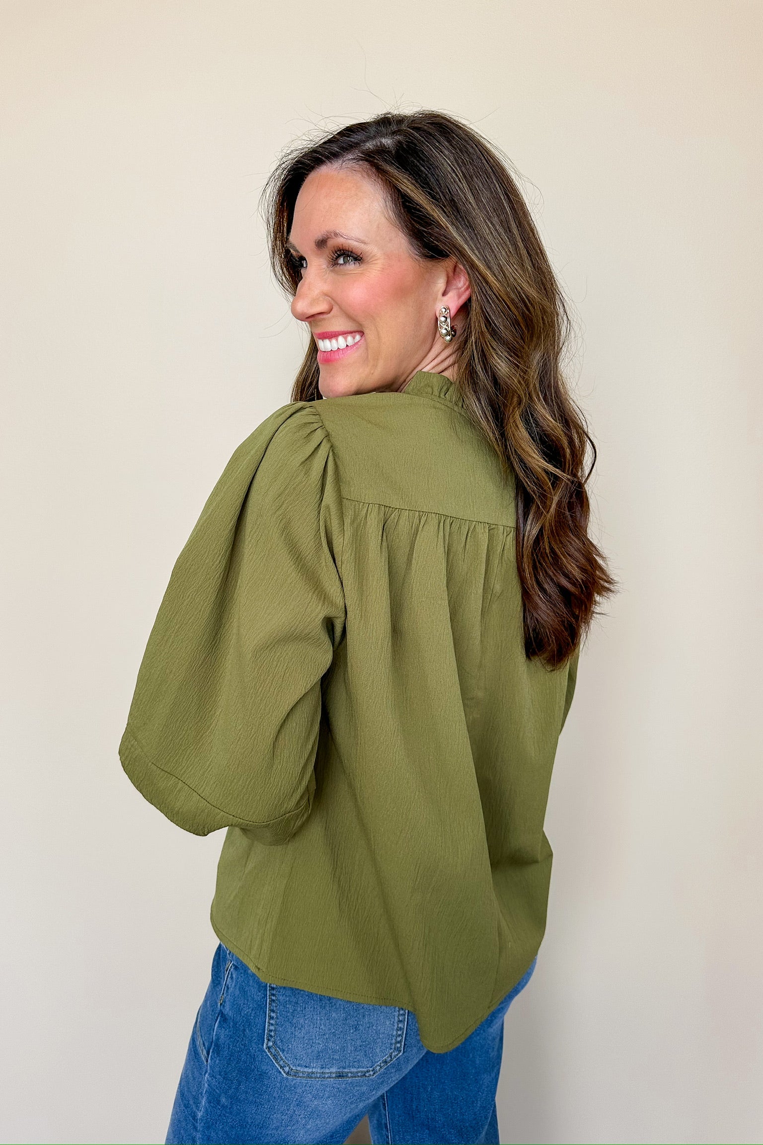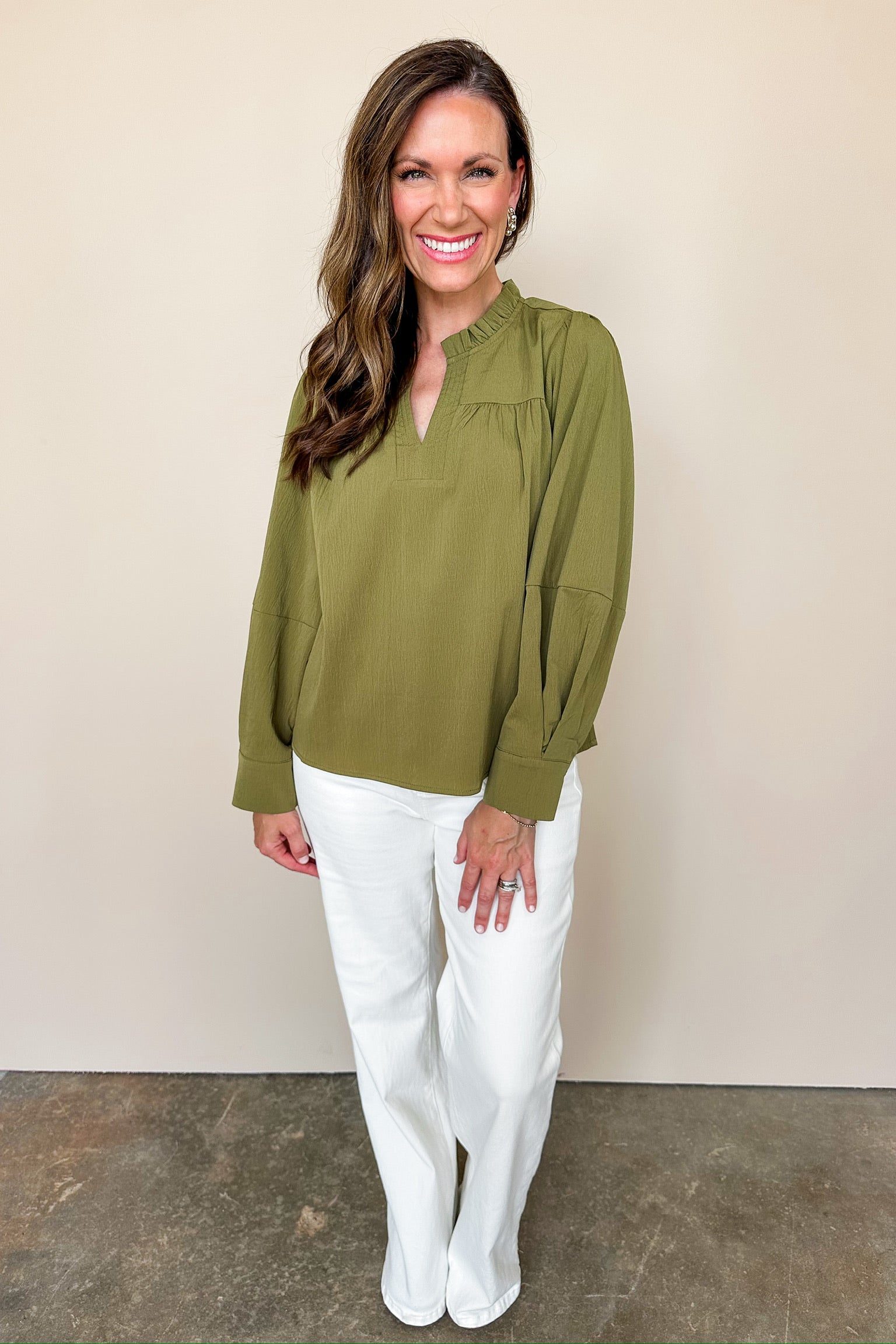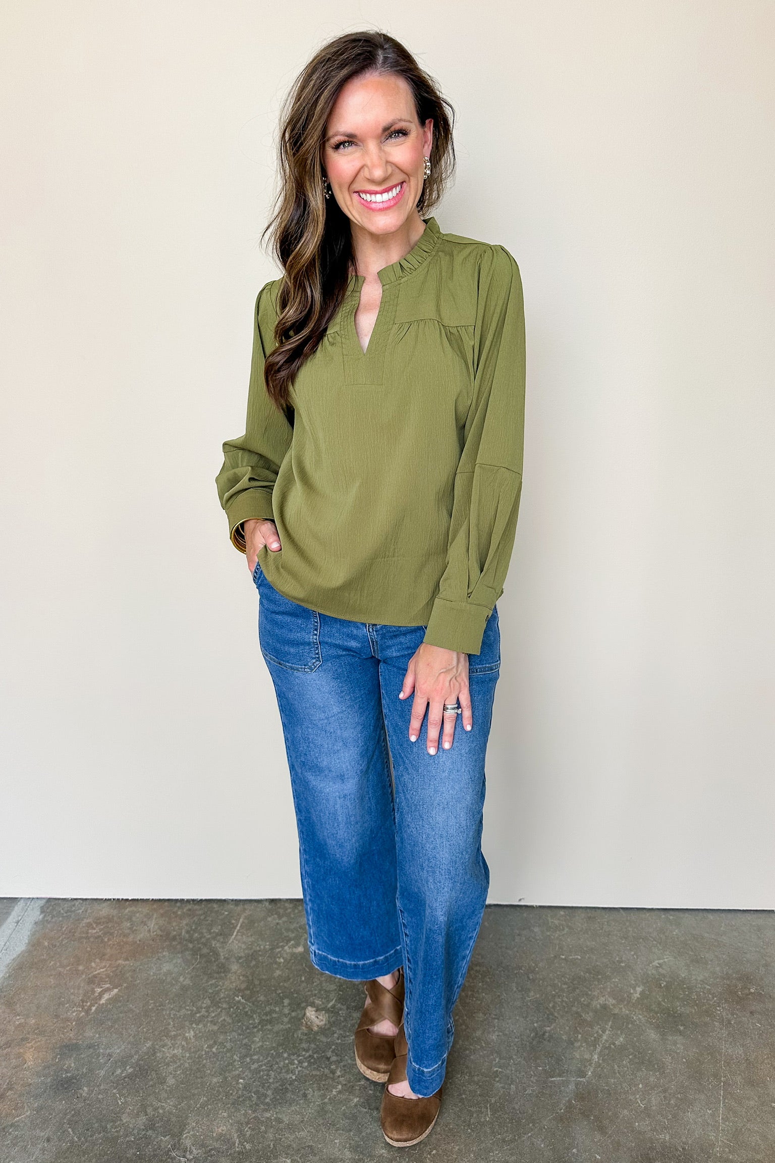 This olive blouse brings a playful twist to your wardrobe with its flattering V-neck and charming ruffle detail. The long sleeves and waist-length cut make it perfect for mixing and matching—dress it up for a night out or keep it casual for daytime fun. A versatile piece that adds a splash of color and style to any outfit!