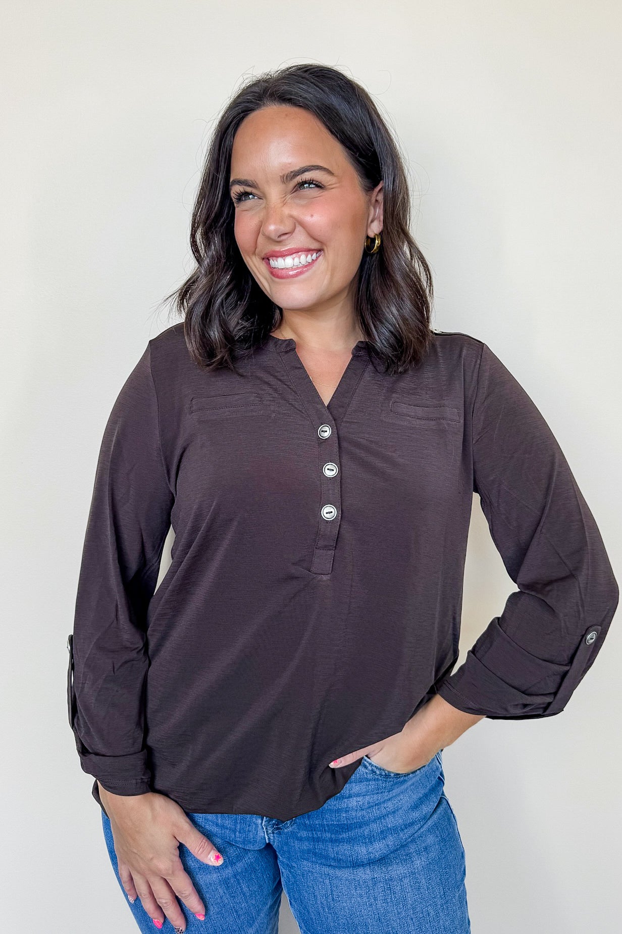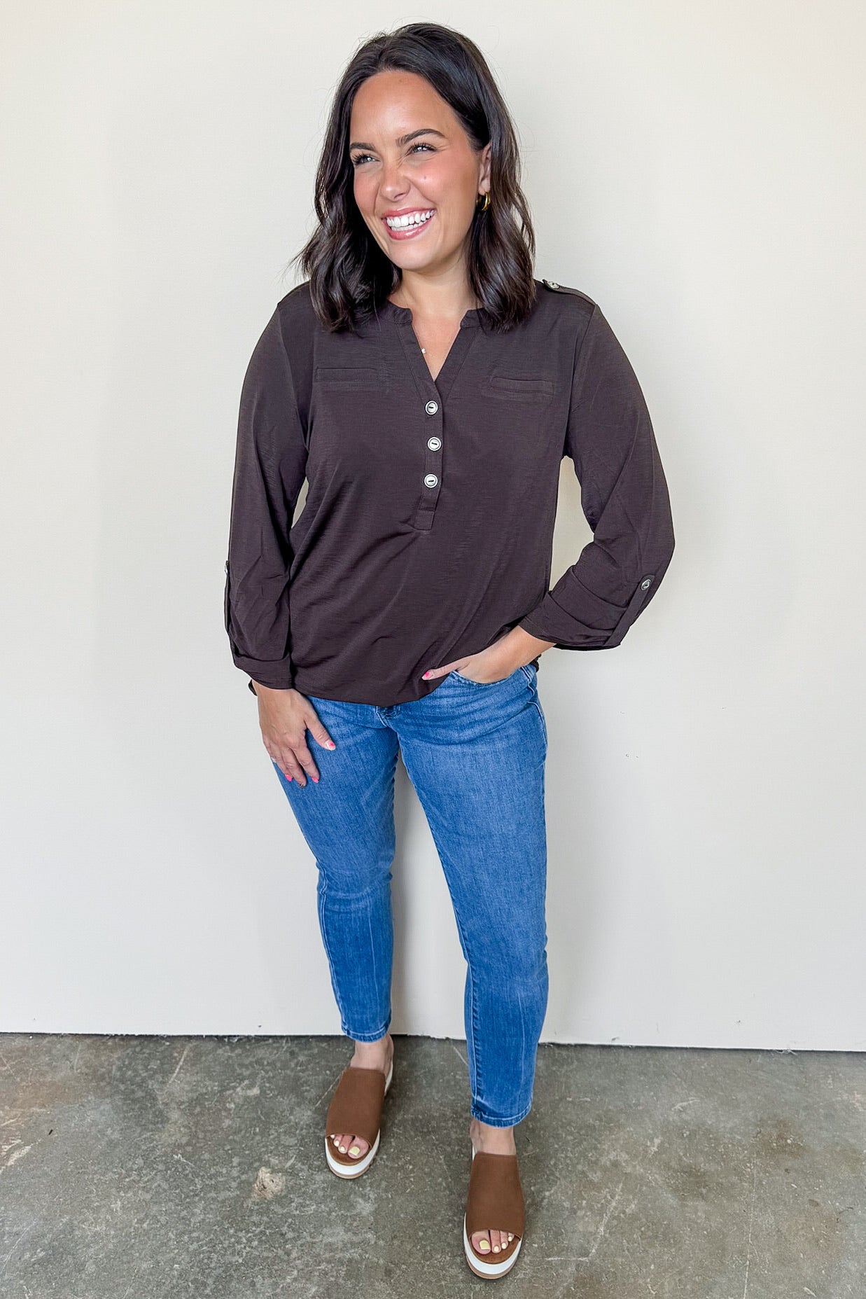 Add a splash of fun to your wardrobe with the Dear Scarlett Liz Luxe Top in Chocolate. Featuring 3/4 length sleeves and a flattering V-neck, this printed top hits just below the waist for a comfortable, stylish fit. Available in a playful range of colors and prints, it’s perfect for mixing and matching your favorite looks with a touch of whimsy.