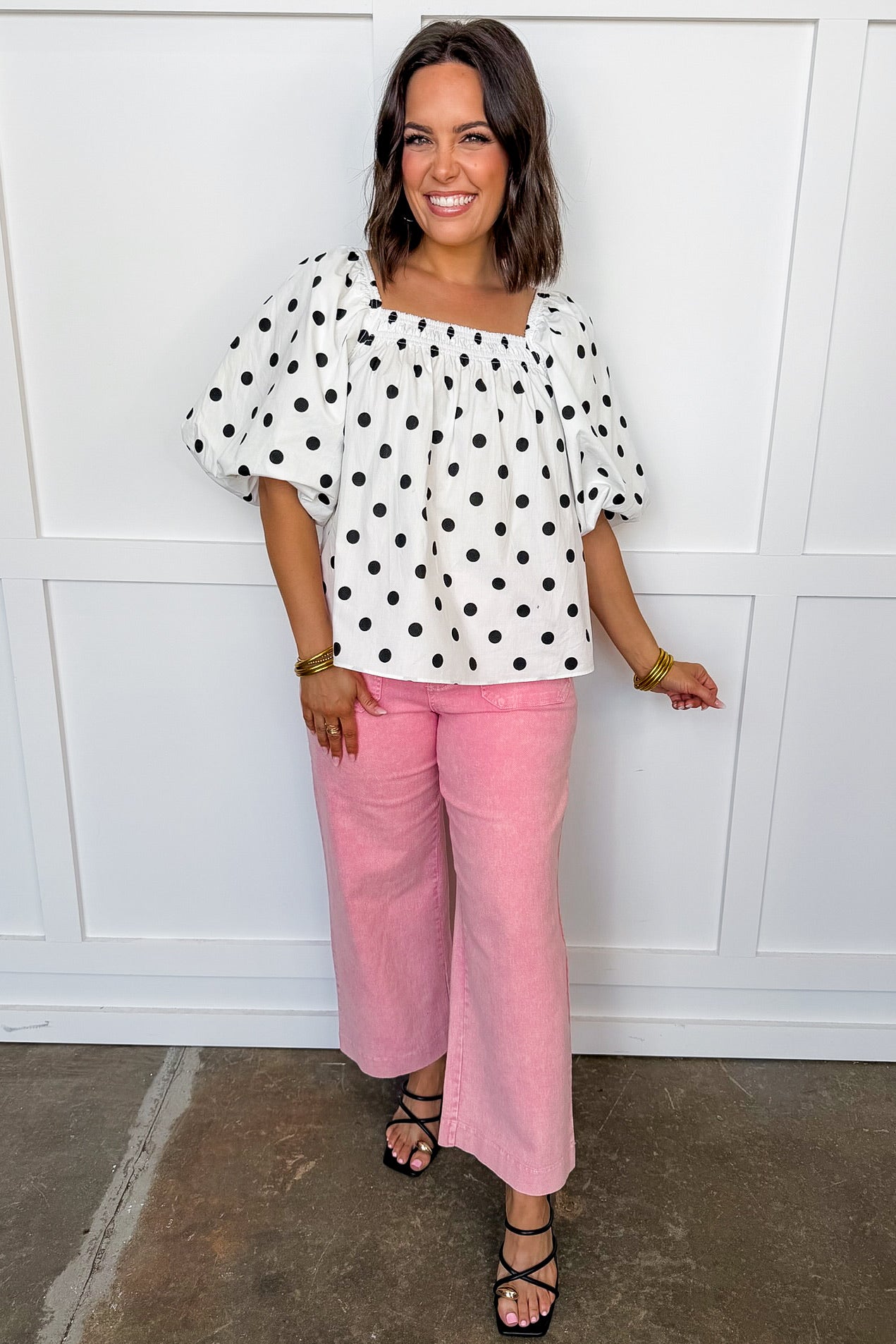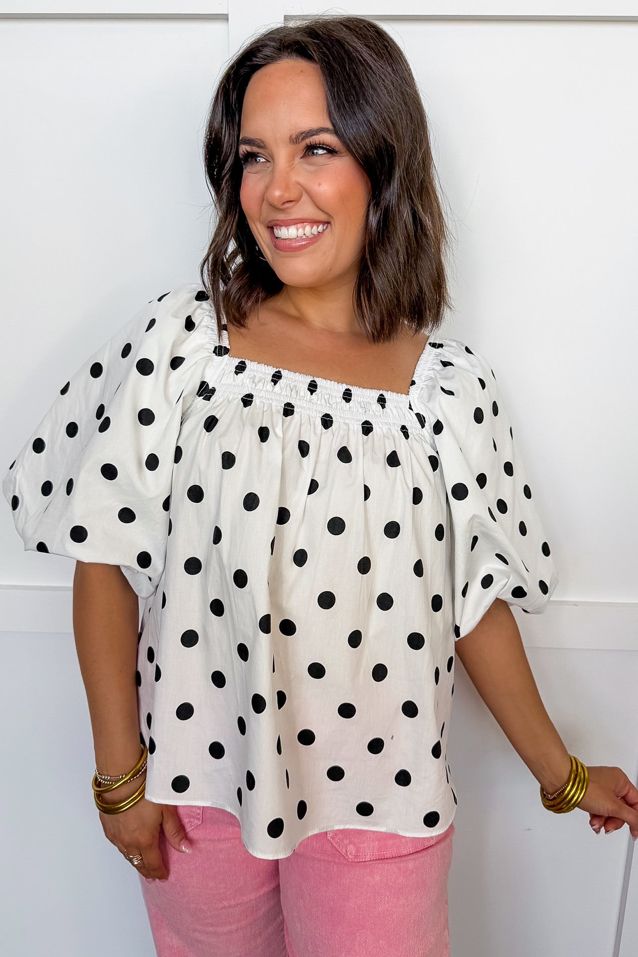 Sweet, timeless, and effortlessly feminine — the Polka Dot Darling Puff Sleeve Top brings a fresh take on a classic print. Designed with soft puff sleeves and a flattering square neckline, this breezy blouse adds the perfect touch of charm to your everyday wardrobe. The lightweight fabric and relaxed silhouette create an easy, airy fit that’s perfect for warm days and casual outings. Pair it with your favorite denim, white shorts, or a flowy skirt for a look that feels polished yet playful.
