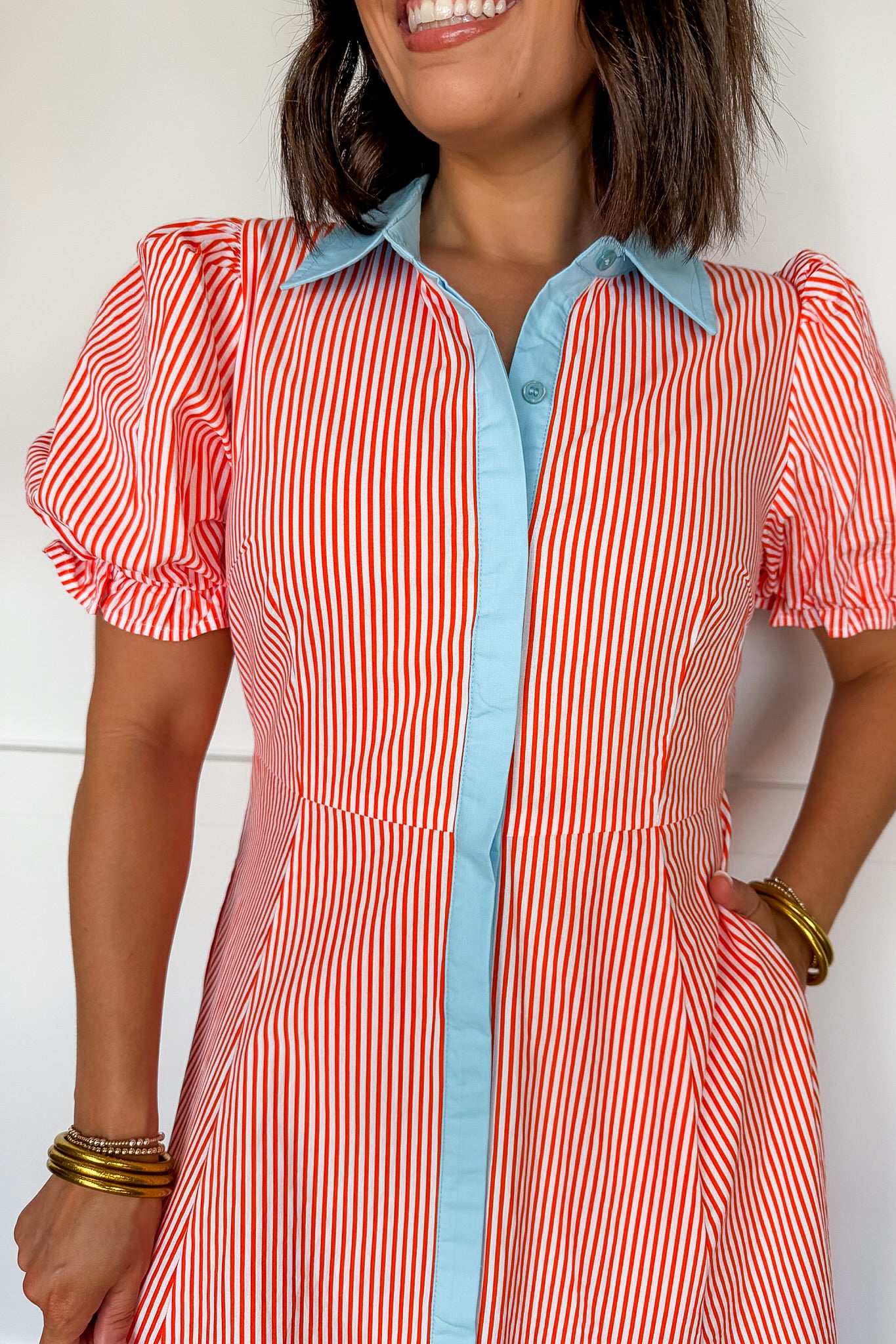 Feminine, polished, and effortlessly charming, the Sweet Caroline Contrast Trim Midi Dress is a timeless piece you’ll reach for again and again. Designed with a flattering fitted bodice and a flowing midi-length skirt, this dress creates a graceful, feminine silhouette that feels both classic and comfortable. The hidden button front detail and crisp collared neckline give it a refined, preppy feel, while the puff sleeves add the perfect touch of Southern charm. Finished with beautiful contrast trim along the collar and button placket, this dress has just the right amount of standout detail to elevate the look. Whether you're headed to brunch, church, showers, or a special event, this dress brings effortless elegance to any occasion.