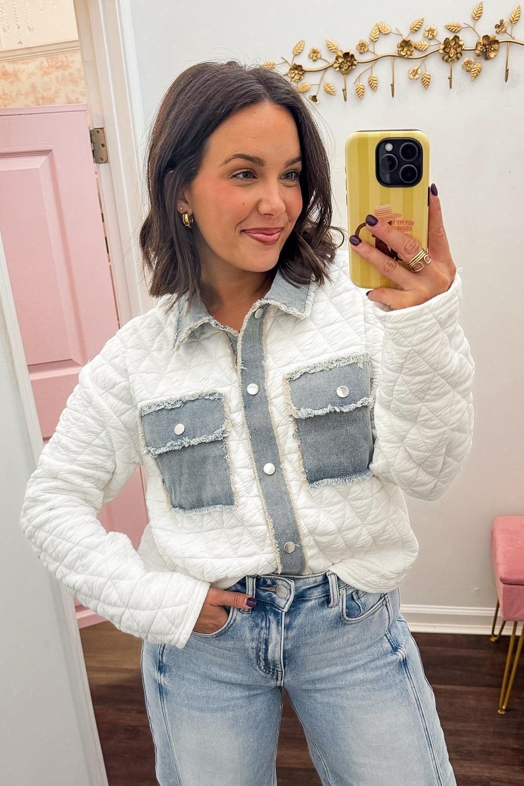 Stay warm and stylish in the Aspen Denim Quilted Top. Featuring a cozy quilted white body with denim trim and pocket detailing, this jacket blends casual comfort with polished charm. Perfect for layering through chilly fall mornings or adding a pop of texture to your winter wardrobe.