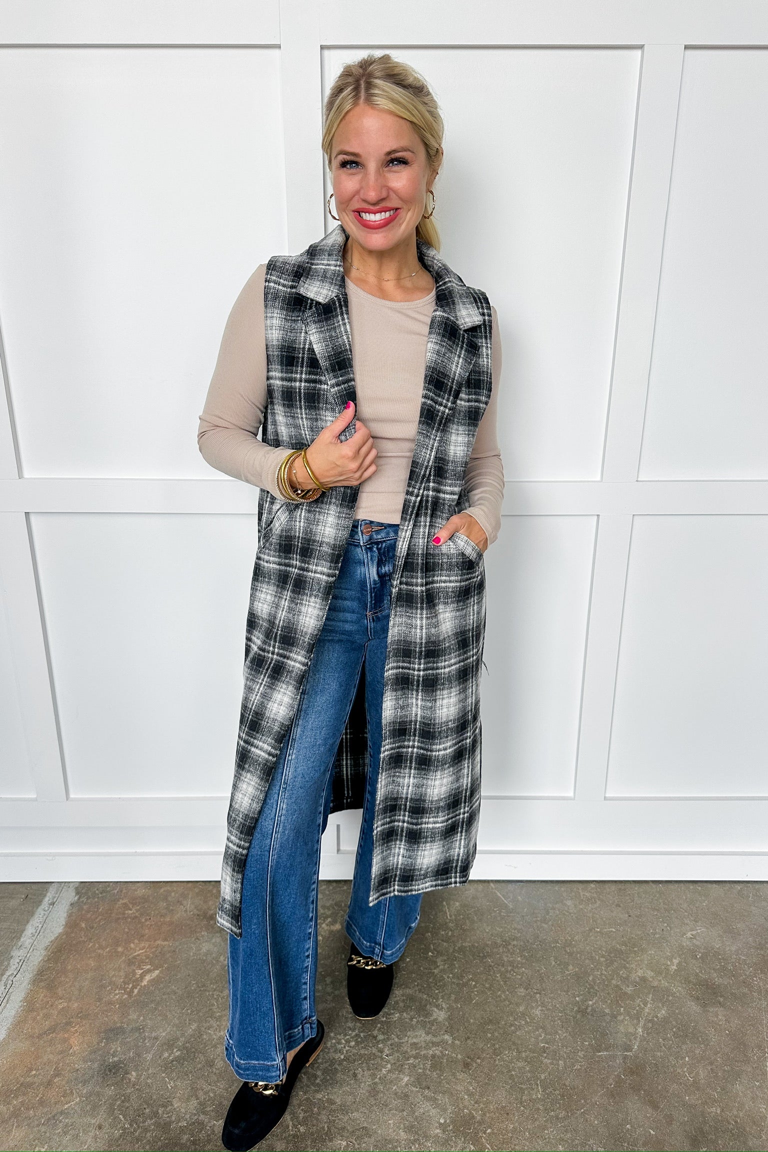 Stay cozy and stylish with the Sweater Weather Long Plaid Vest. This sleeveless piece features a chic charcoal and black plaid pattern, crafted from a thicker material perfect for layering on chilly days. Practical pockets add a handy touch, making it your go-to vest for cooler adventures and casual outings. Embrace warmth with a wink of playful charm!