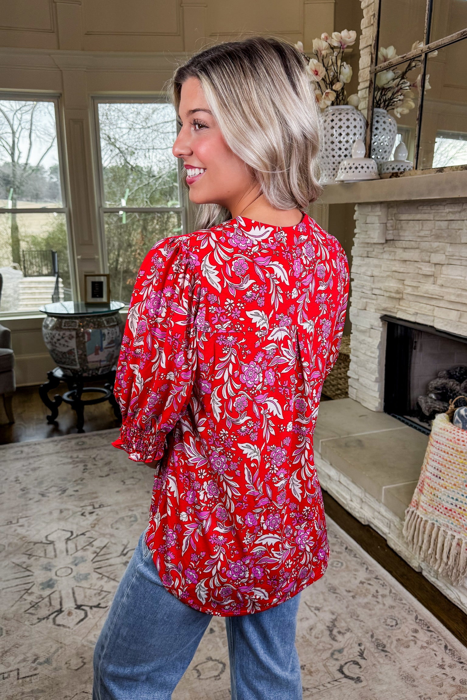 The Lizzy Smocked Short Sleeve Top in Red Floral