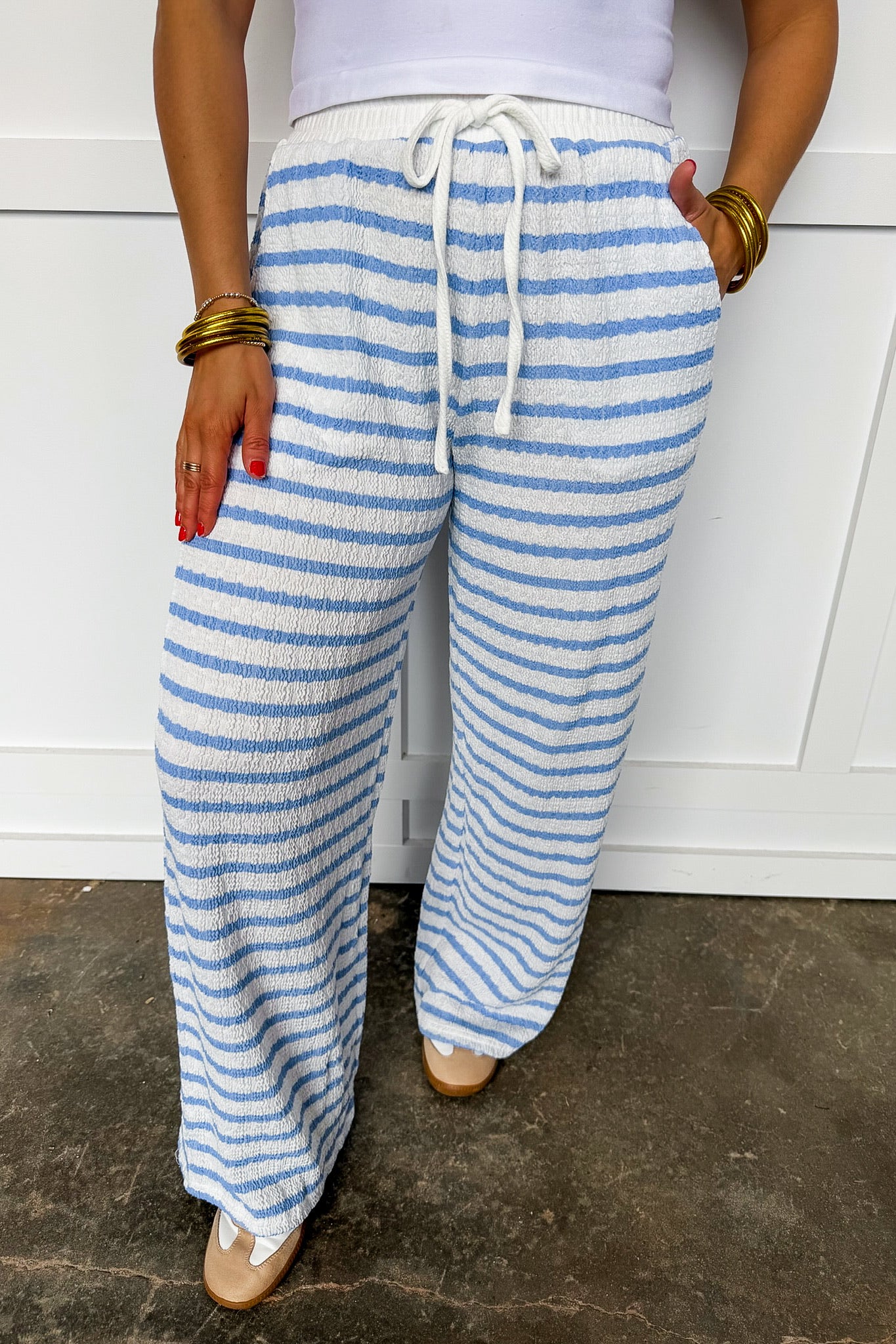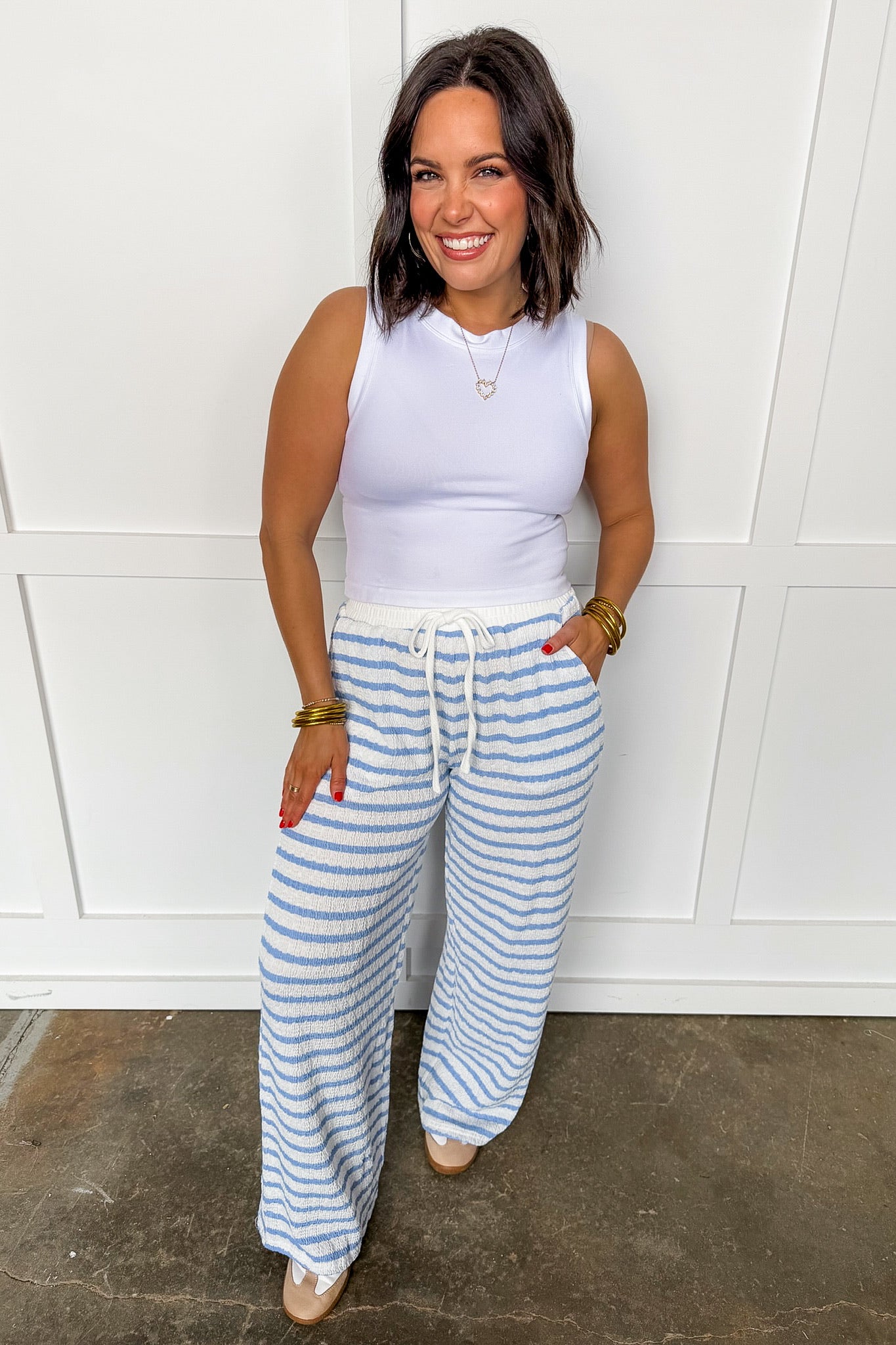 The Off Duty Striped Pants were made for laid-back days and effortless lounging. With a relaxed wide-leg silhouette, soft breathable feel, and an adjustable drawstring waistband, they deliver comfort without sacrificing style. Perfect for slow mornings, travel days, or casual outings — and even better when paired with the matching Off Duty Striped Tee or Shorts for a complete mix-and-match set. Whether you’re cozying up at home or styling them with a tank and sneakers for errands, these pants keep it easy, breezy, and cute.