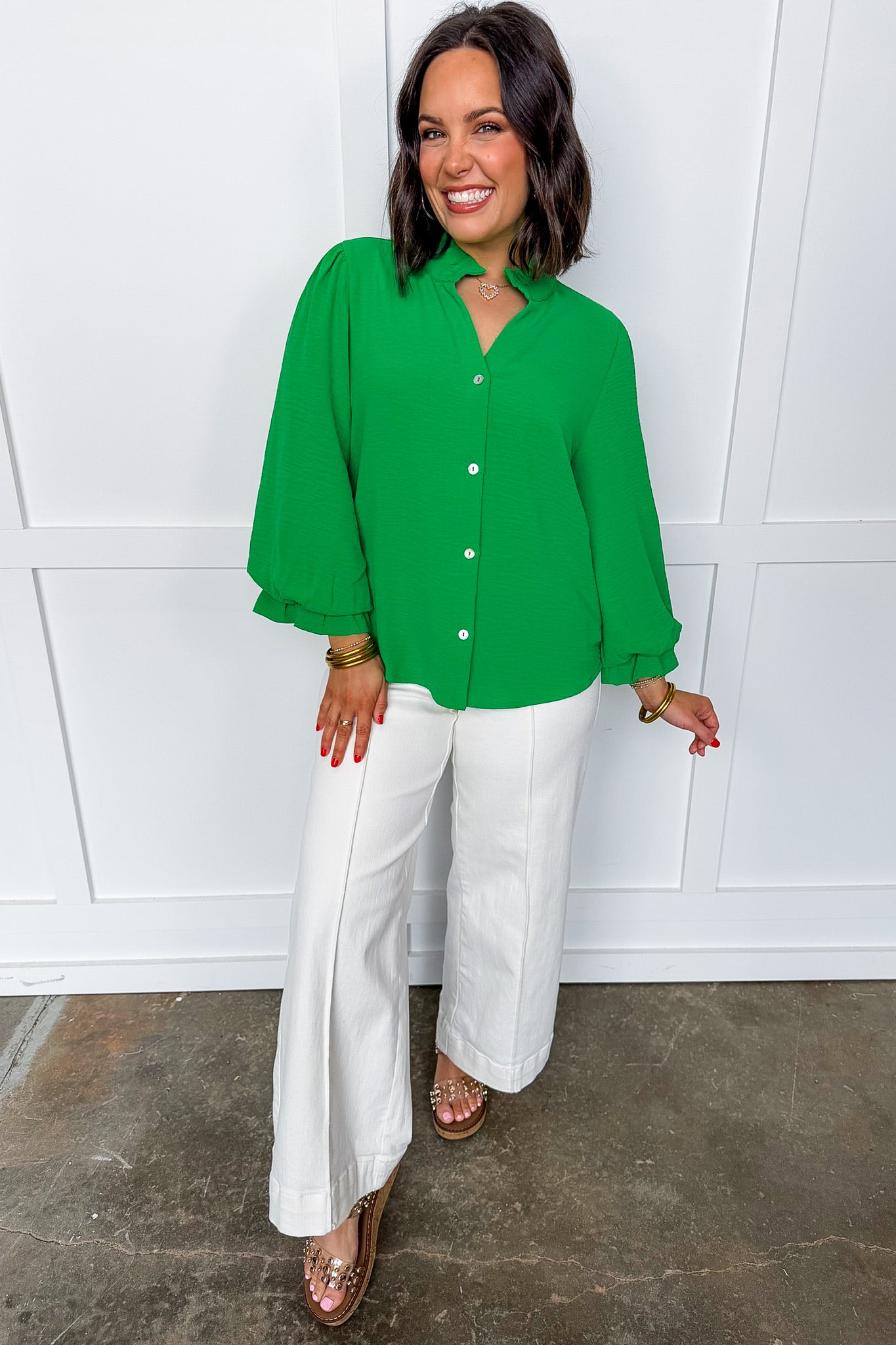 Bring a pop of color and effortless charm to your everyday wardrobe with The On the Bright Side Top. Featuring a soft ruffled neckline, flowy sleeves, and a relaxed button-front fit, this top is designed to feel just as good as it looks. Available in multiple vibrant and classic color options, it’s the kind of feel-good piece that instantly lifts any outfit—whether you’re headed to work, brunch, or out for the day.