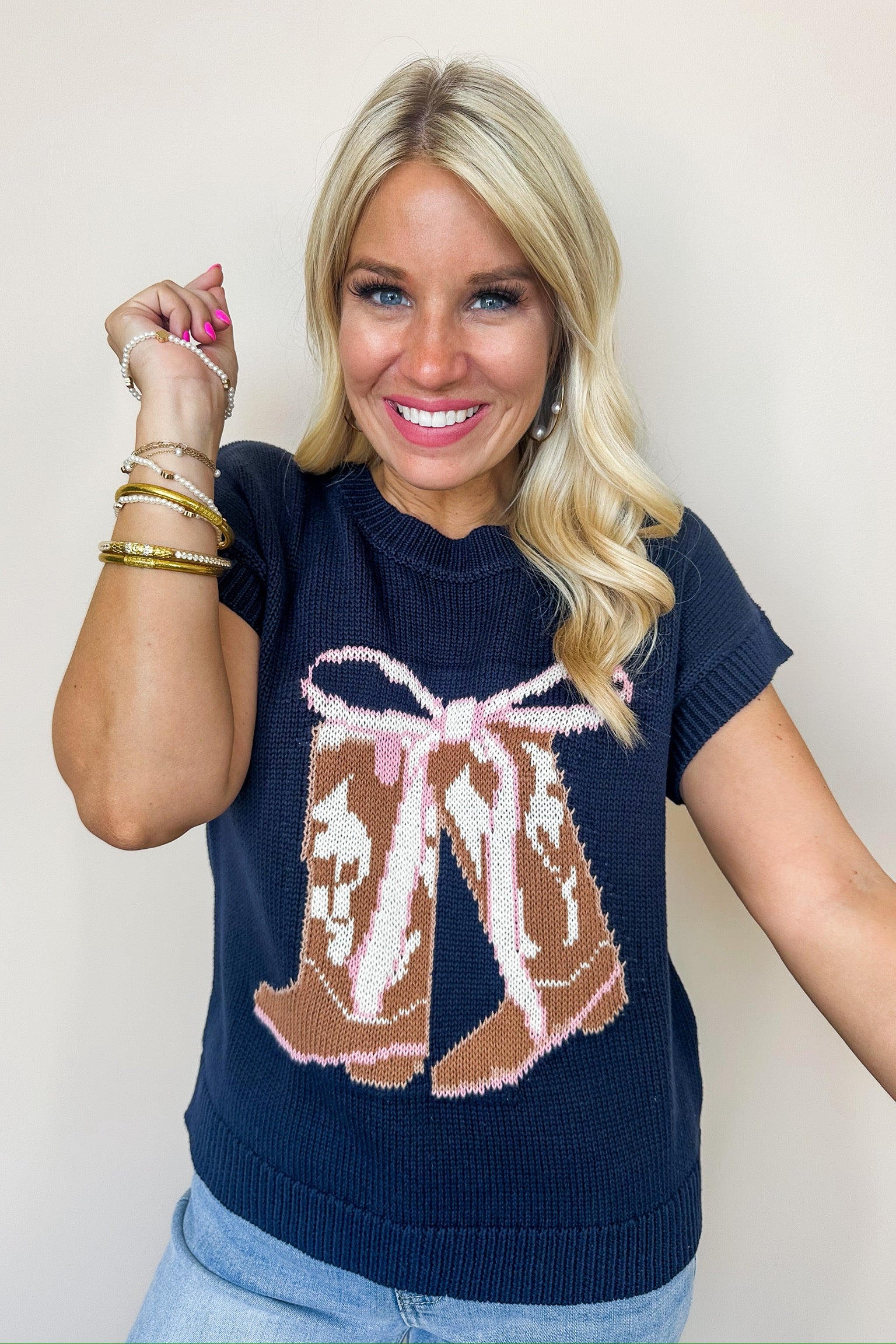 Show off your southern style with this adorable navy sweater top featuring a playful cowboy boot and bow design. Soft and lightweight, it’s perfect for adding a touch of Western charm to your everyday look. Pair it with denim and boots for a casual outfit that’s effortlessly cute and comfy.