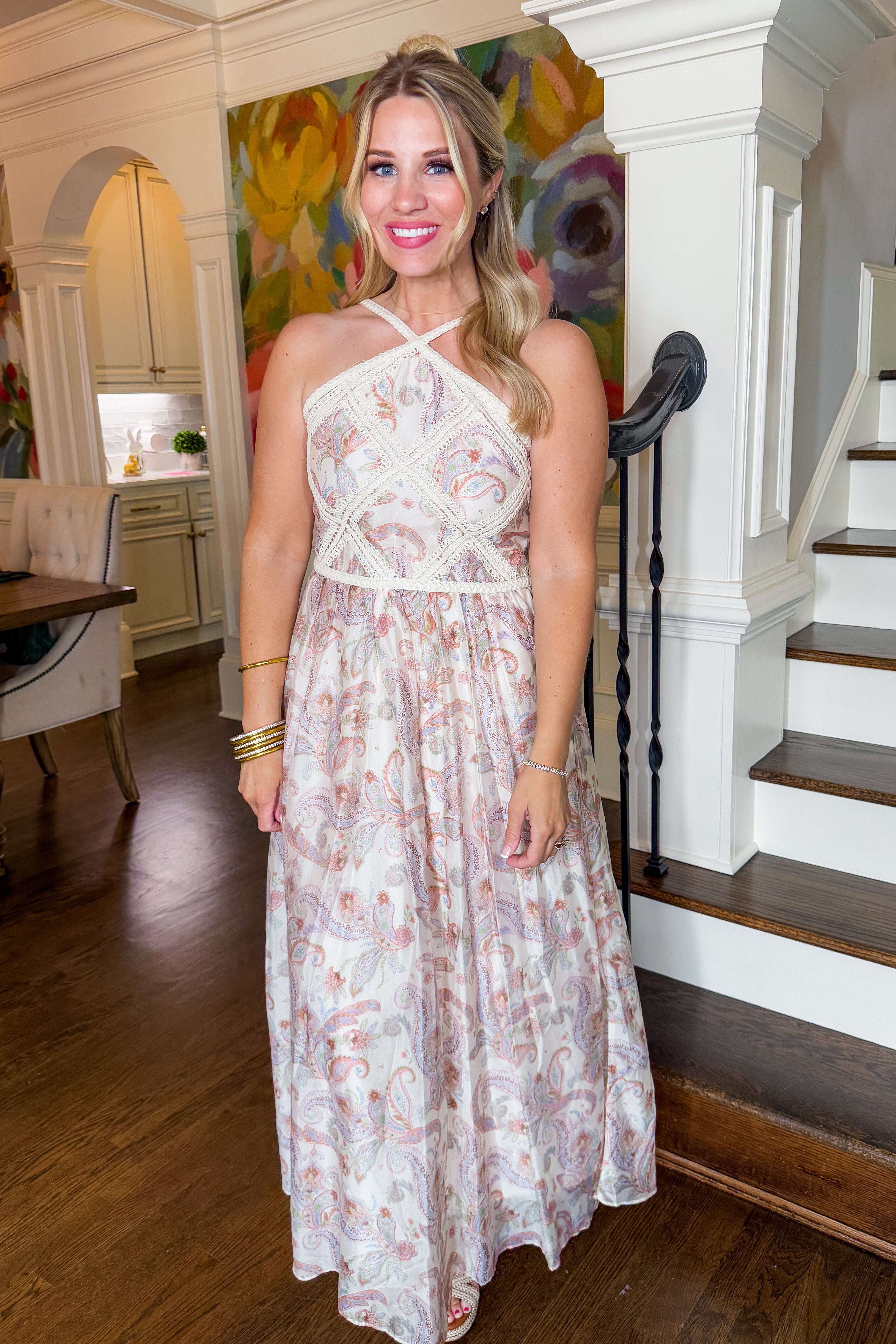 Exude boho vibes with our Cream Multi Color Paisley Braided Halter Neck Midi Dress! Featuring a lined design, crochet/embroidered trim, and adjustable straps, this dress is perfect for any occasion. Style it with a denim jacket for a casual look or dress it up with raffia heels and a purse for a night out. Embrace the versatility and beauty of this dress and make a statement wherever you go!