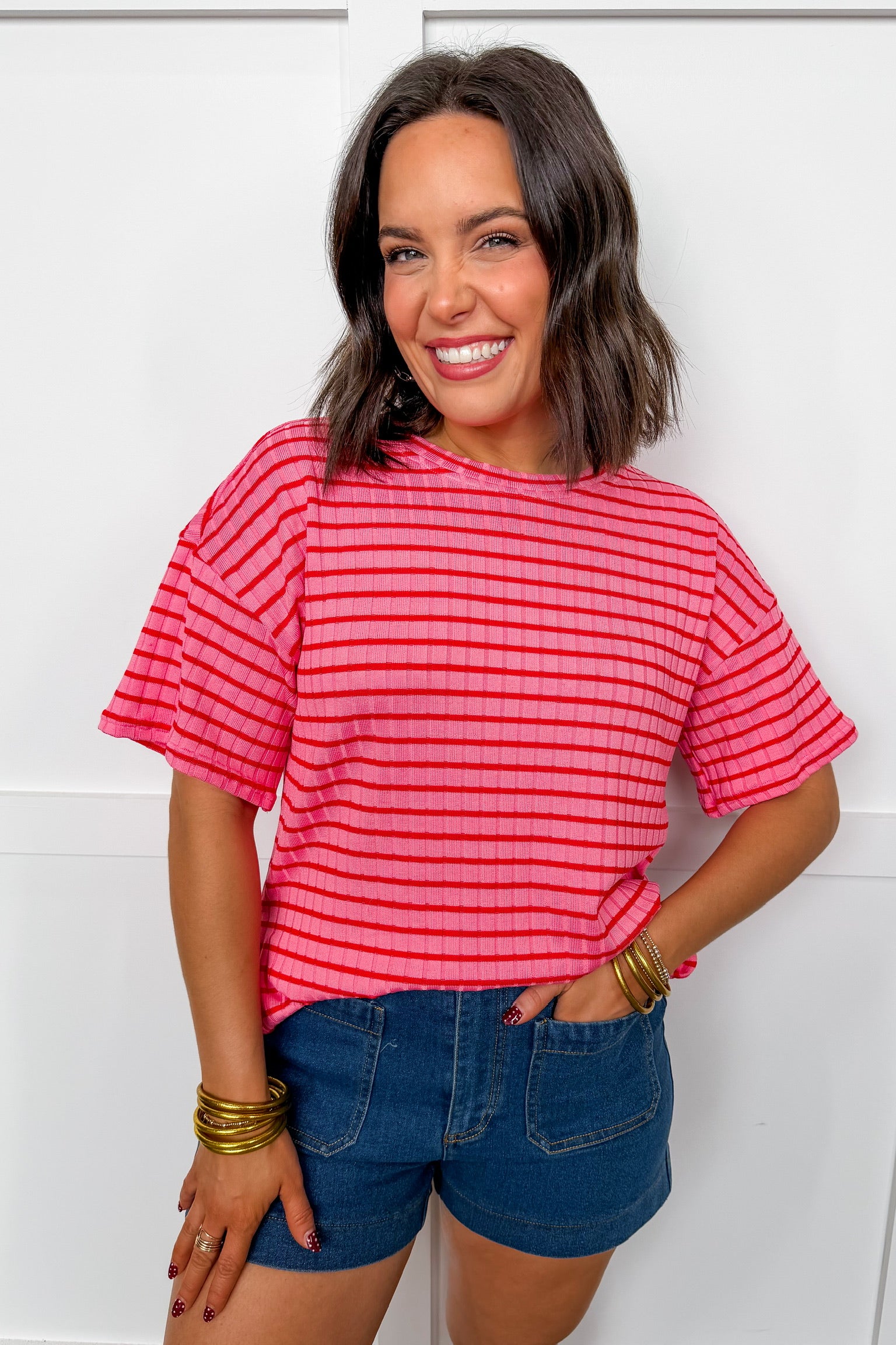 Easy, comfy, and effortlessly cool, the Red & Pink Ribbed Stripe Boyfriend Tee is your go-to throw-on-and-go essential. Designed with a relaxed boyfriend fit and soft ribbed texture, this tee features playful red stripes layered over a pretty pink base for a fun pop of color. Lightweight and ultra-wearable, it’s perfect for casual days when you still want your outfit to feel put together.