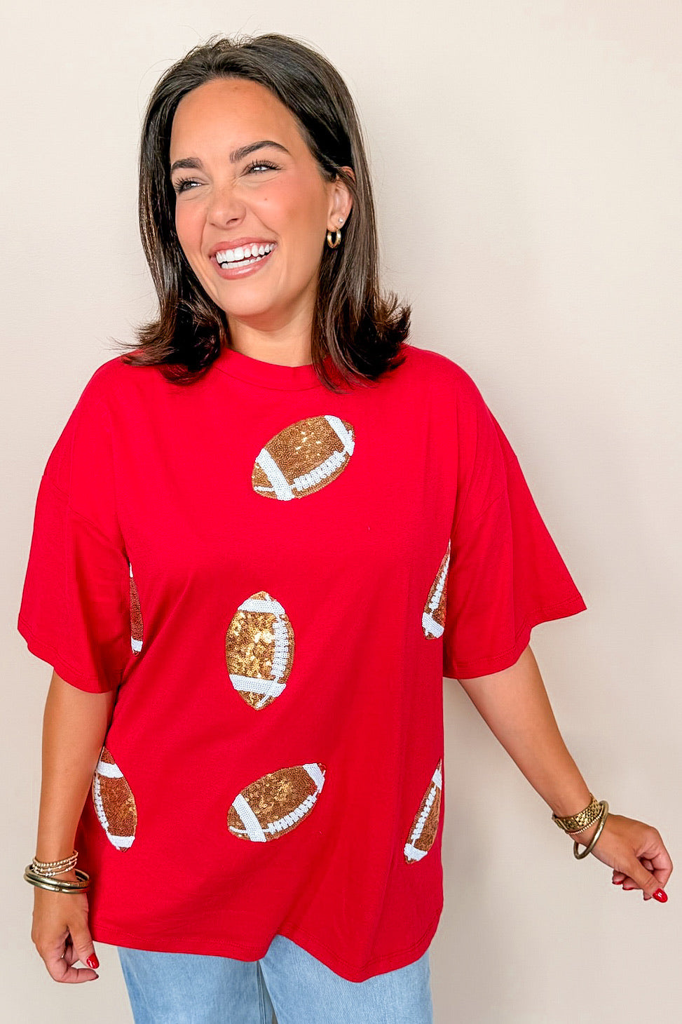 Elevate your game day wardrobe with this Burgundy Oversized Football T-shirt, featuring a refined crew neck design for effortless style. The standout sequin football detail adds a subtle yet striking touch of glamour, merging sporty appeal with a sophisticated finish. Its relaxed fit ensures comfort while making a confident statement at every event.