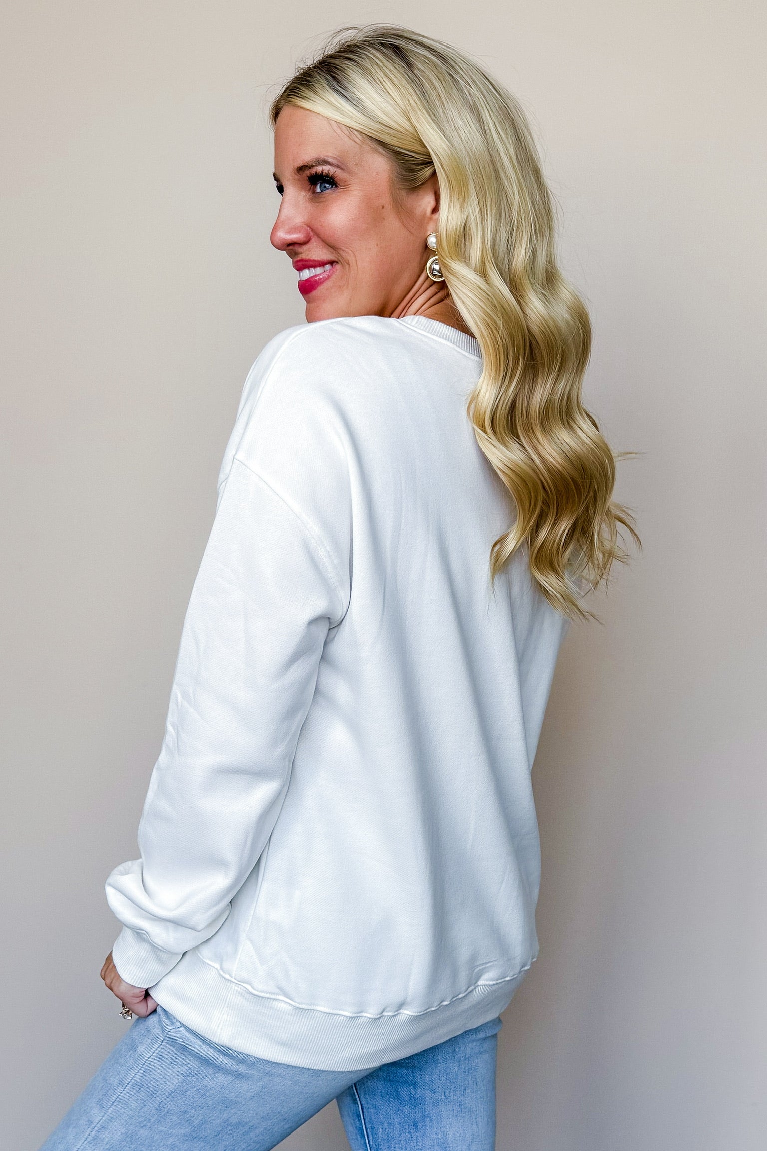 Bring a little sparkle to your casual look with this playful white pullover featuring shimmering sequin horse details. The soft crew neck and long sleeves keep you cozy, while the white and brown accents add a touch of rustic charm. Perfect for horseback riding fans or anyone who loves a dash of whimsy in their wardrobe!