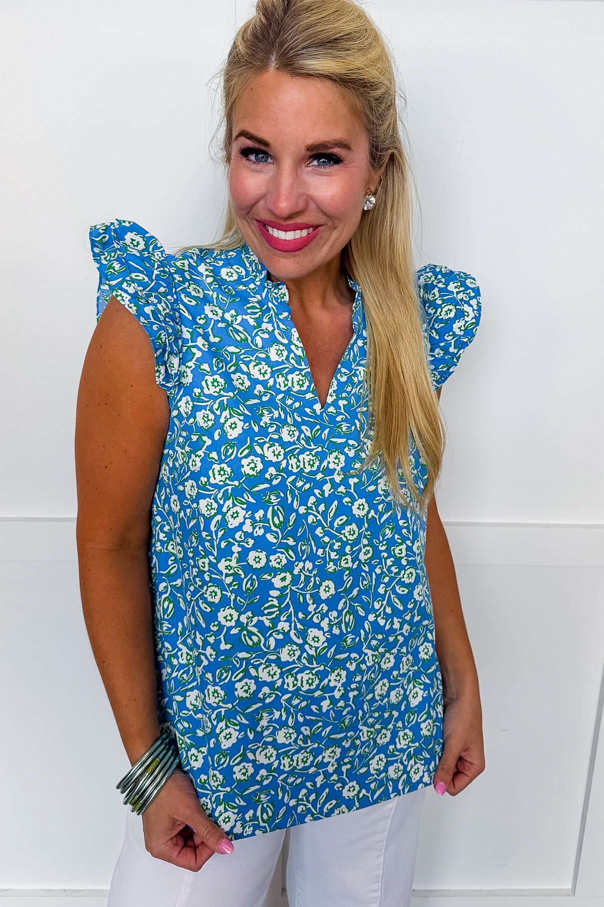 Feminine, fresh, and effortlessly pretty — the kind of piece you’ll reach for all season long. Featuring a soft blue base with delicate green and white florals, this top brings the perfect pop of spring charm.
