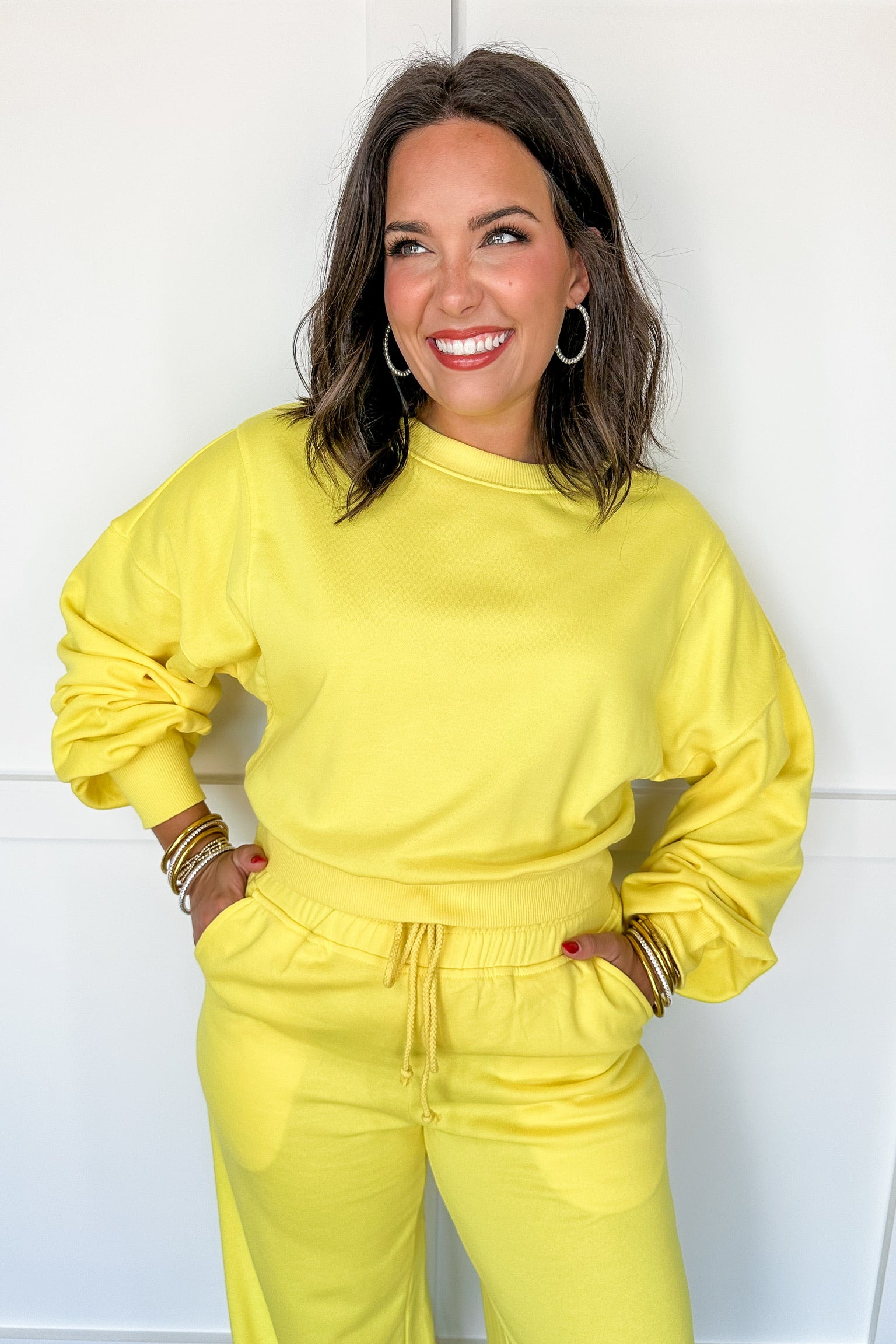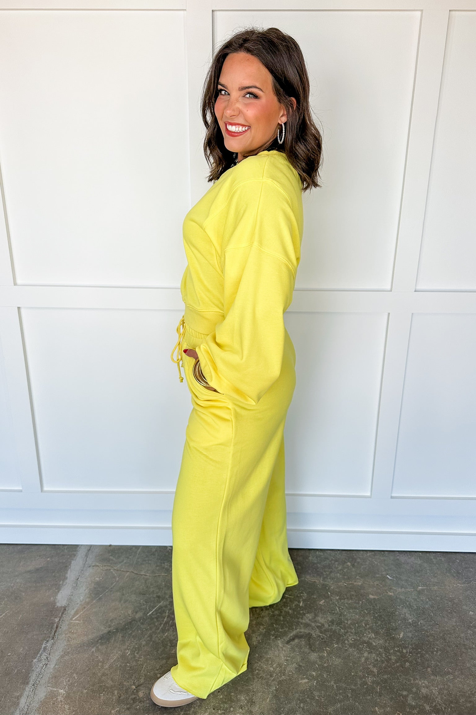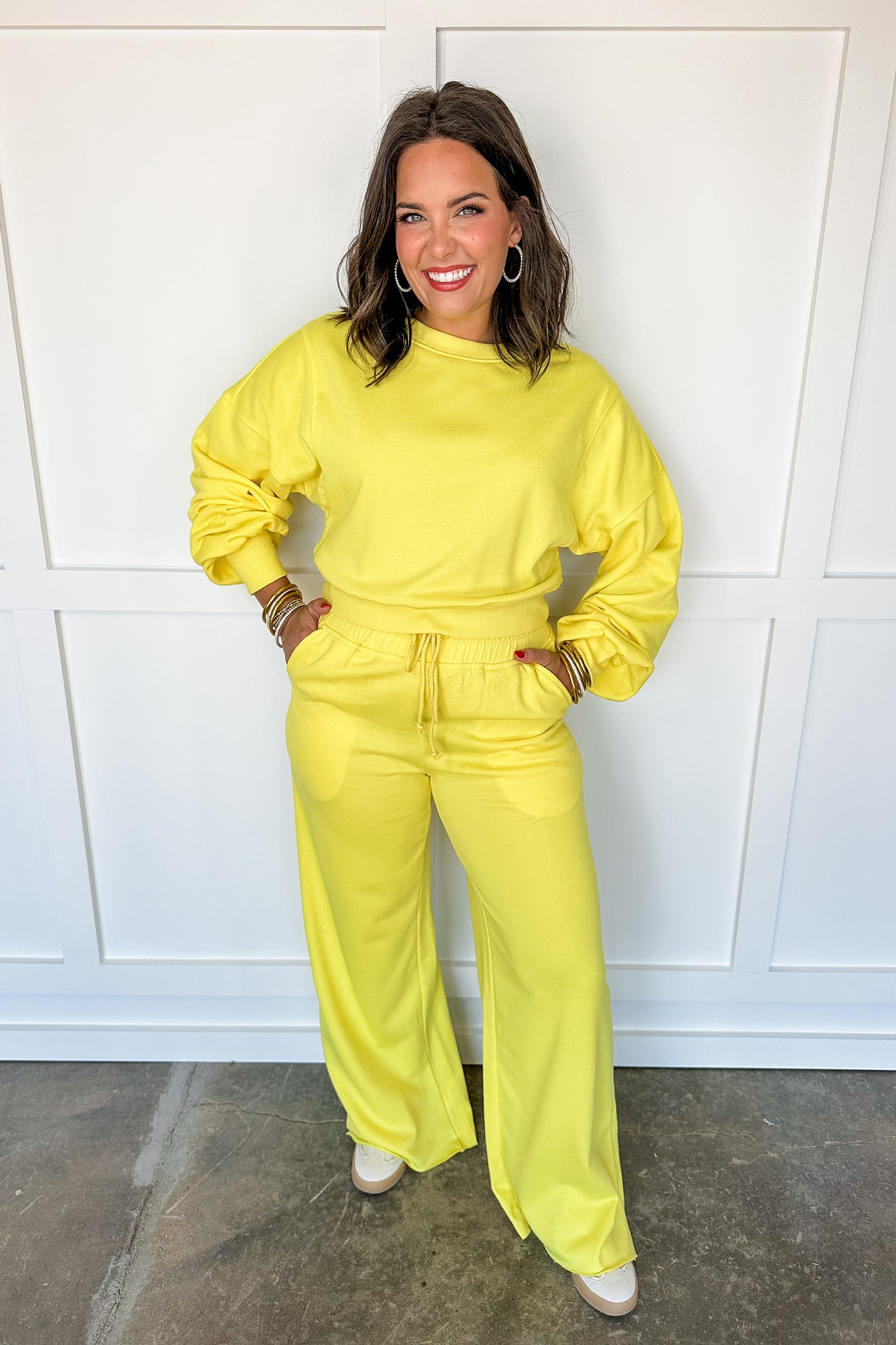 Get cozy and chic with the Yellow Cream Matching Lounge Set. Featuring a playful boxy long sleeve top paired with high-waisted, wide-leg bottoms that tie at the waist for a perfect fit. This set blends comfort and style effortlessly, making it your new go-to for lounging or casual outings.