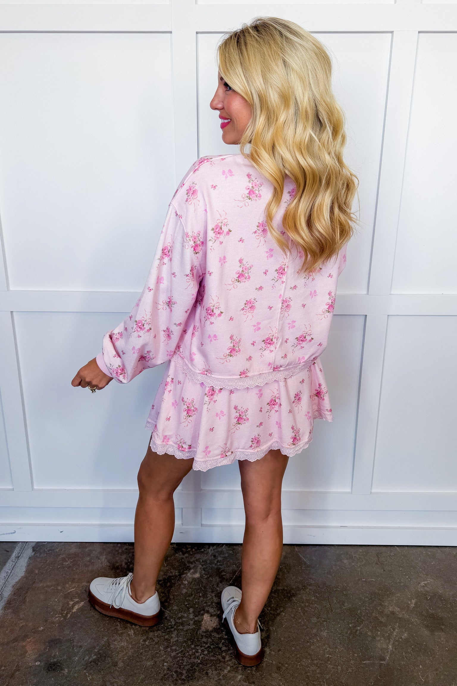 Meet your new cozy-cute obsession! The Blush Blossom Lounge Set brings all the soft-girl vibes with buttery plush fabric, dainty floral details, and the sweetest scalloped hems. The top and skorts are perfectly slouchy, giving you that relaxed, effortless look while still feeling adorable and put-together. Whether you're lounging at home, grabbing coffee, or having a girls' night in — this set is comfort and charm wrapped into one.