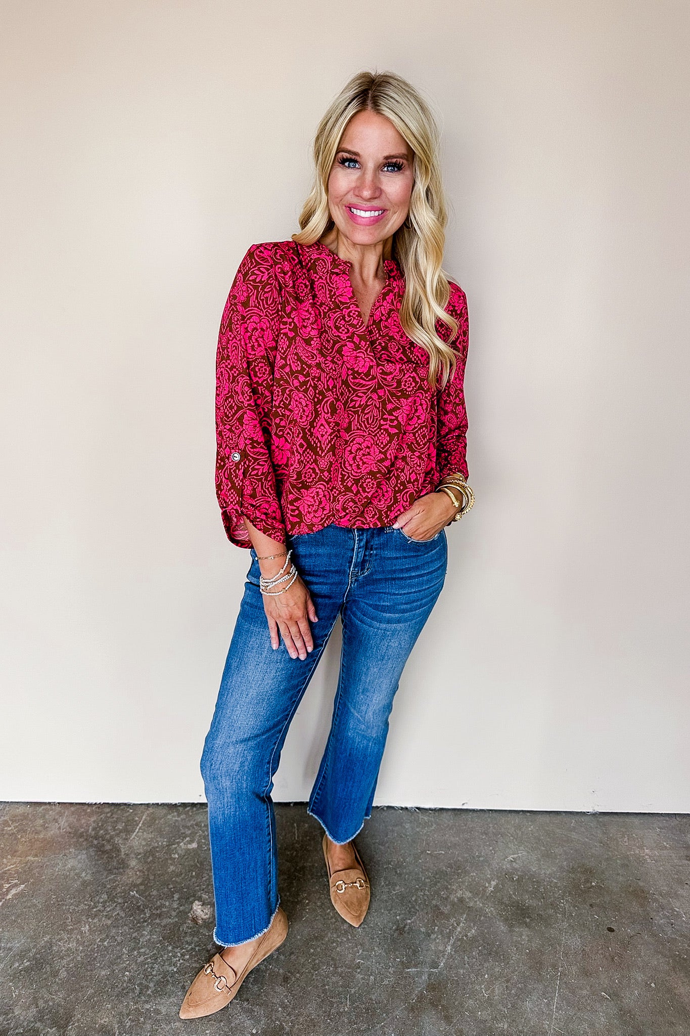 Brighten your wardrobe with the Dear Scarlett Lizzy Printed Top in Mocha Pink. This best-selling floral print features a flattering V-neck and breezy 3/4 length sleeves, perfect for effortless style with a playful twist. Its vibrant design and comfortable fit make it an easy go-to for any casual outing or lively gathering.