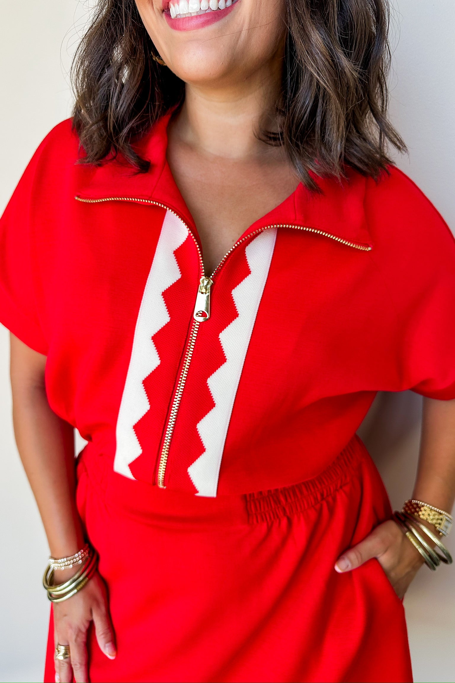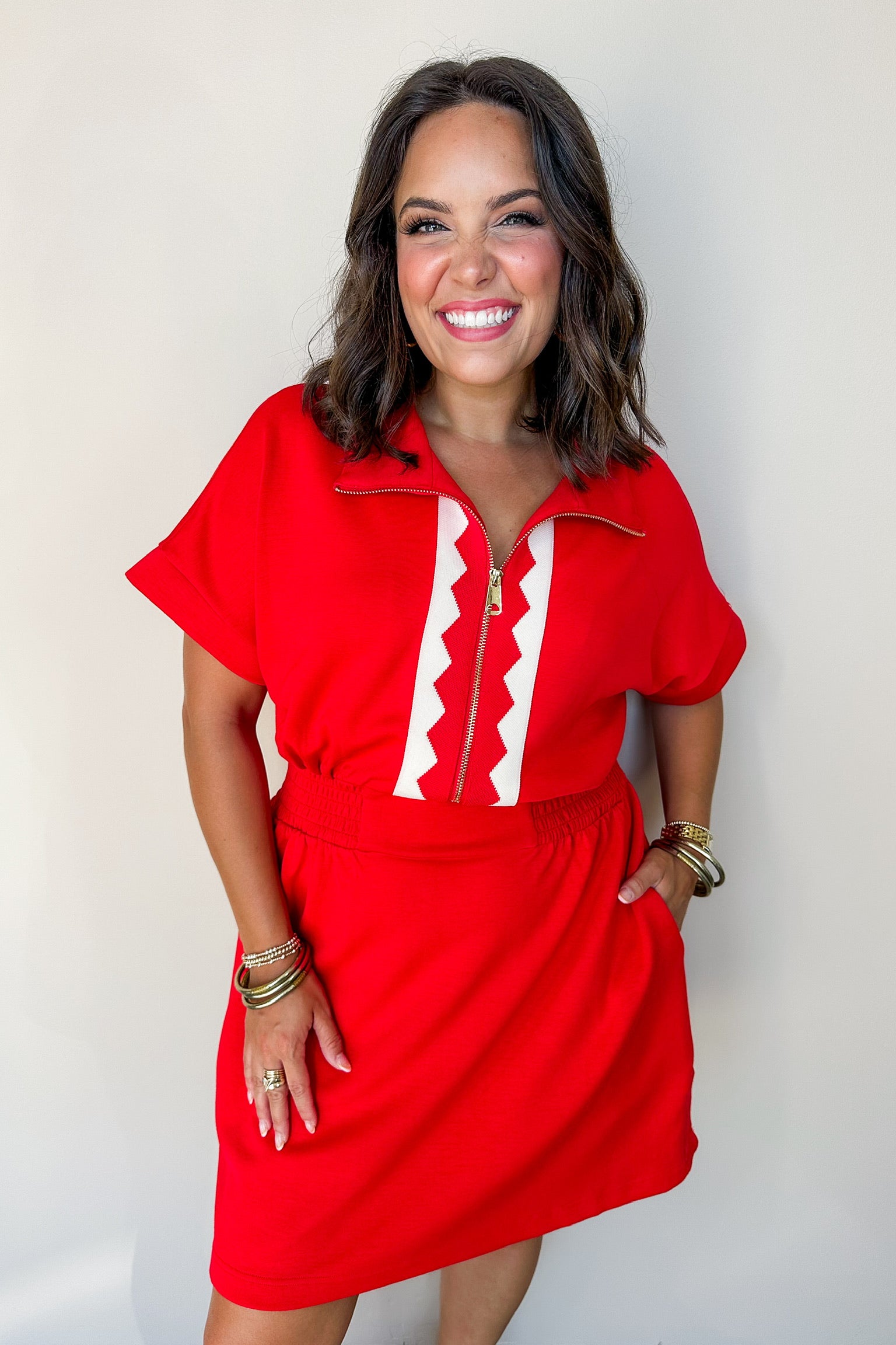 The Huddle & Hustle Zip Up Dress in Red features a smocked elastic waist and a gold zipper for easy wear. Perfect for game day, this dress pairs effortlessly with sneakers, letting you move from tailgate to celebration in comfort and style!