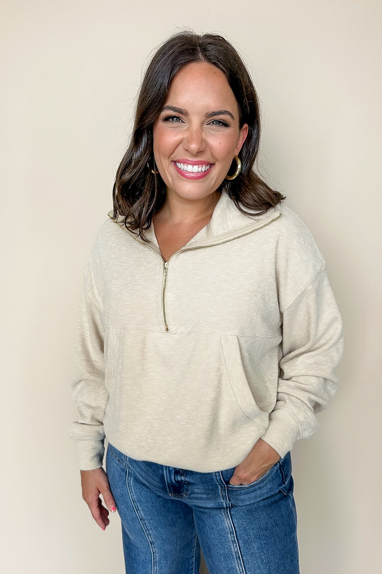Experience ultimate comfort and sleek style with our Gold Half Zip Collared Soft Knit Beige Pullover. Made with a lightweight material, this pullover is perfect to throw on and go, while the kangaroo pocket adds a functional touch. Style with leggings or denim for a versatile and trendy look. Elevate your wardrobe with this must-have piece!