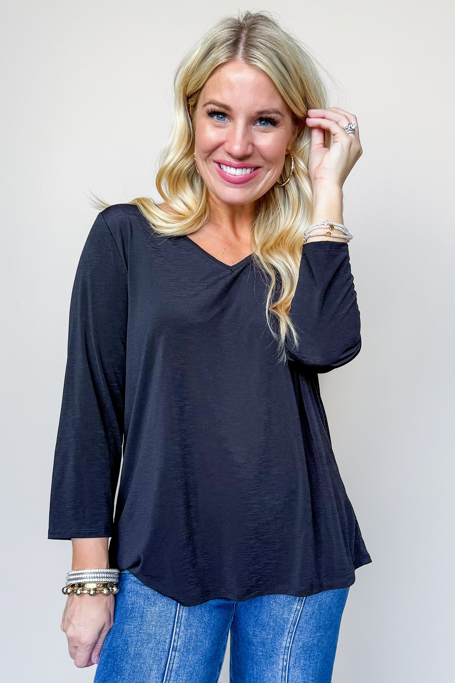 Elevate your wardrobe with the Sadie top! Made of lightweight, non-wrinkle material, you can effortlessly dress it up with dress pants or pair it with our Magic Set for a chic work look. For a more casual fit, throw it on with denim. Versatile and stylish!