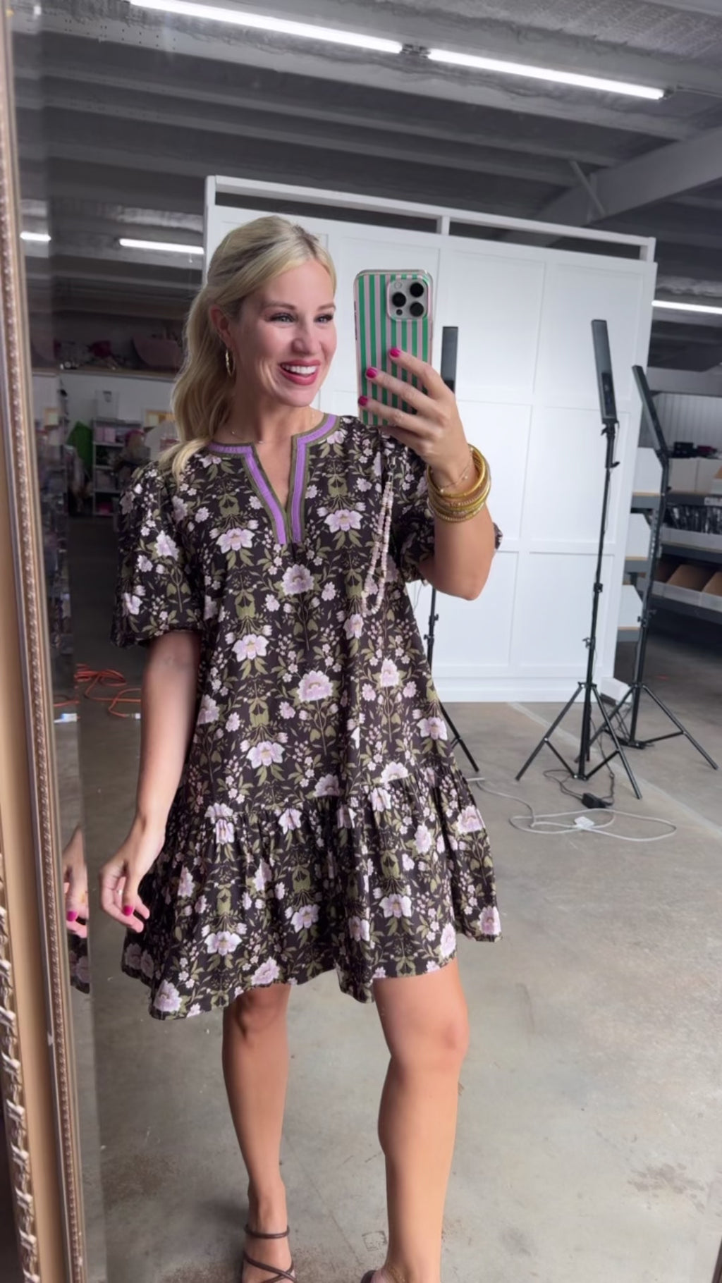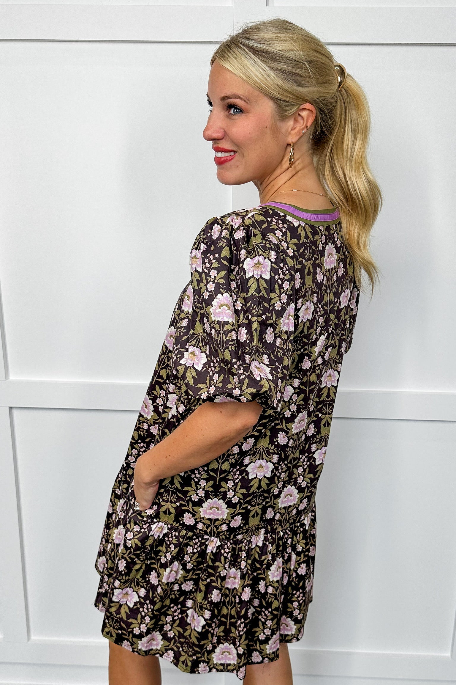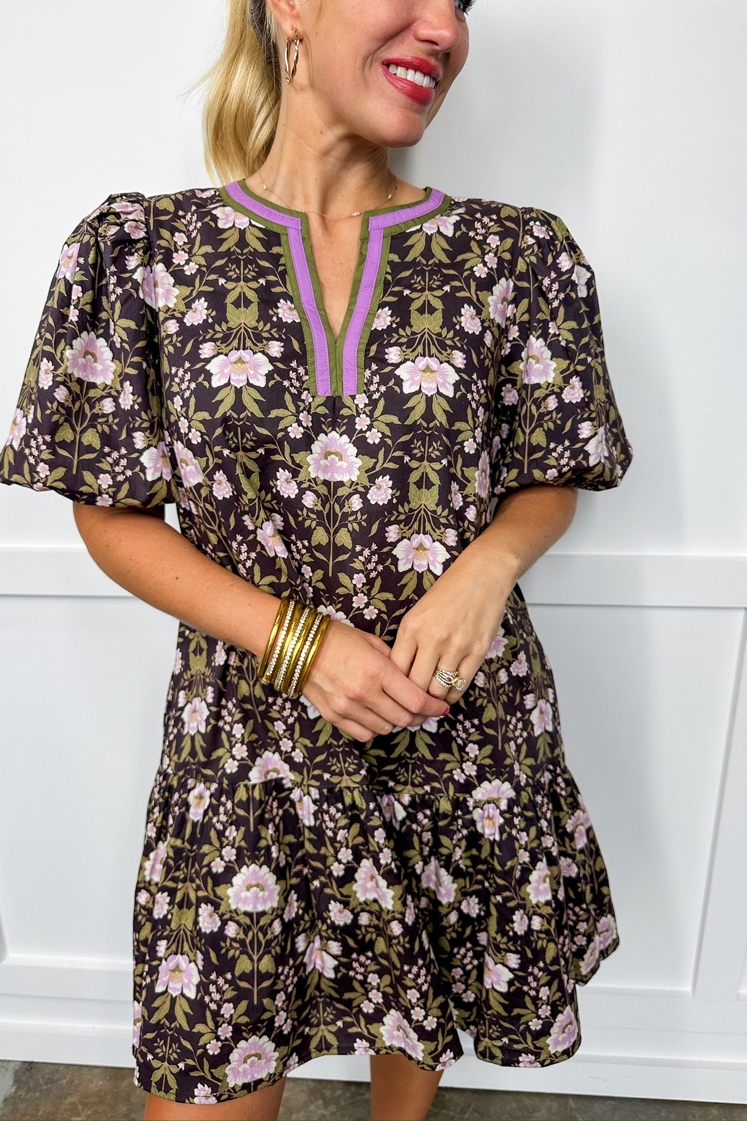 Step into sunshine with this flirty brown dress adorned with lavender and green floral details. The playful puff sleeves and V-neck add charming flair, while the short hemline keeps it fun and fresh—perfect for dancing through the day or twirling into the night.