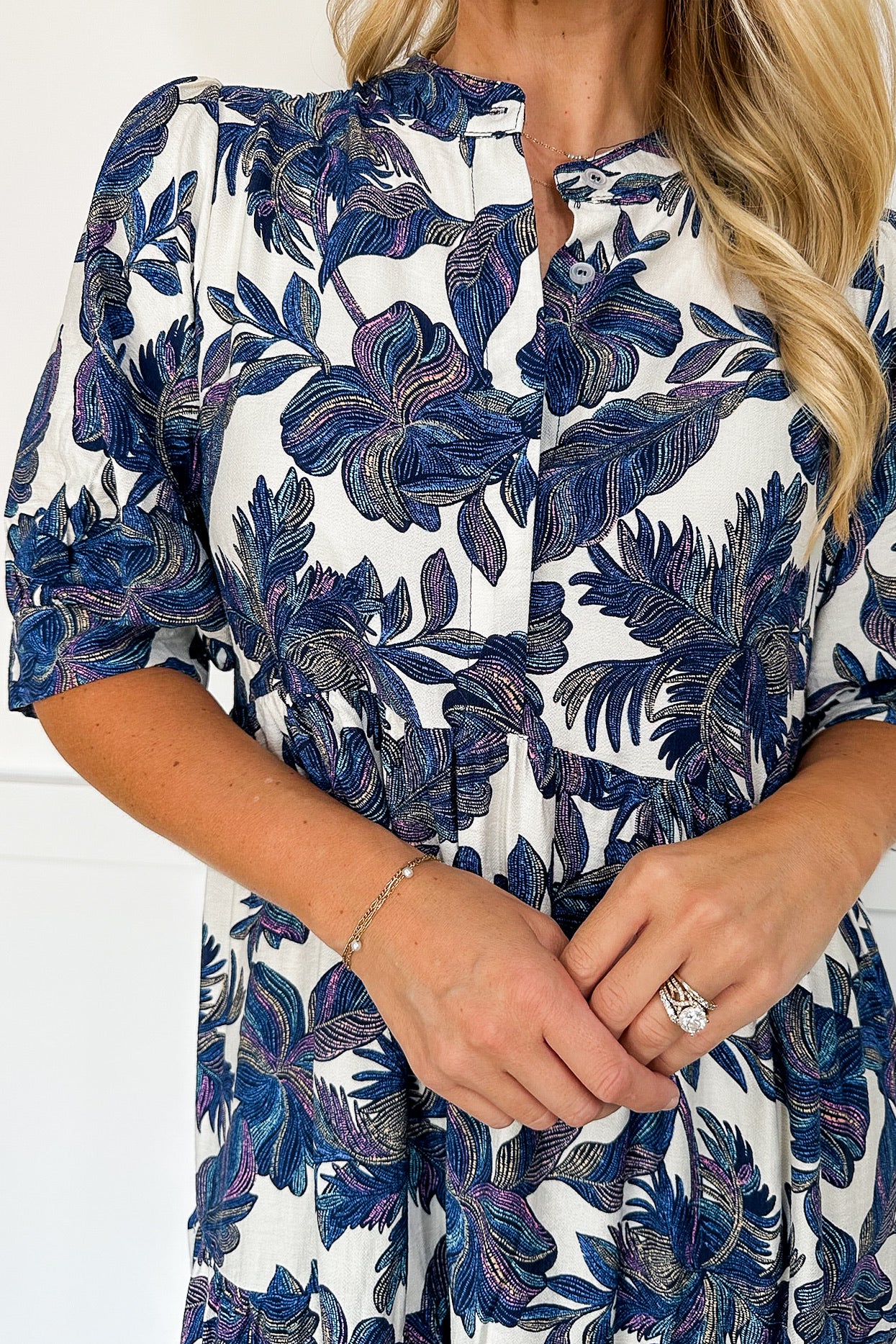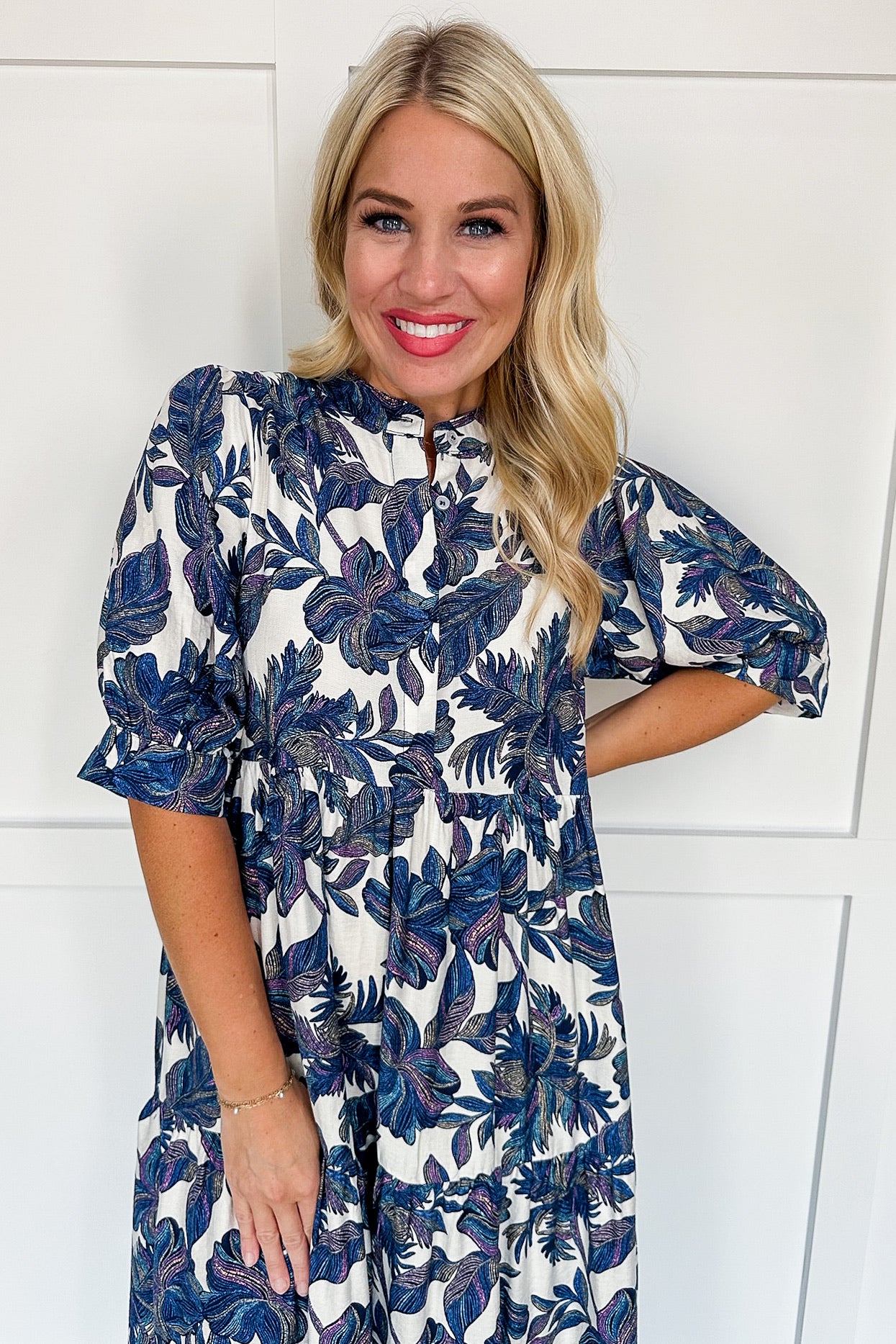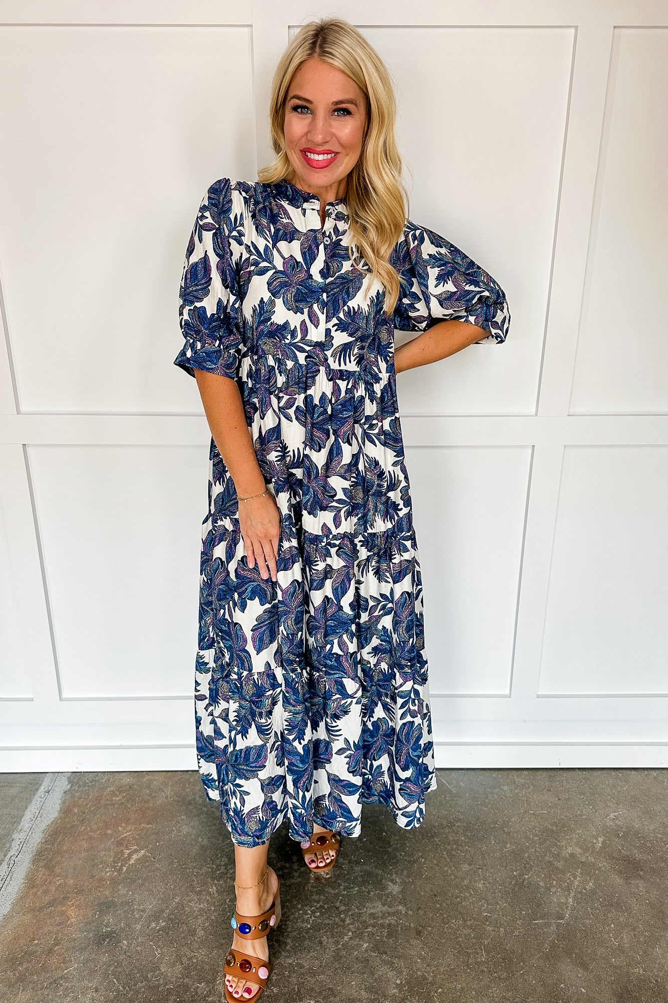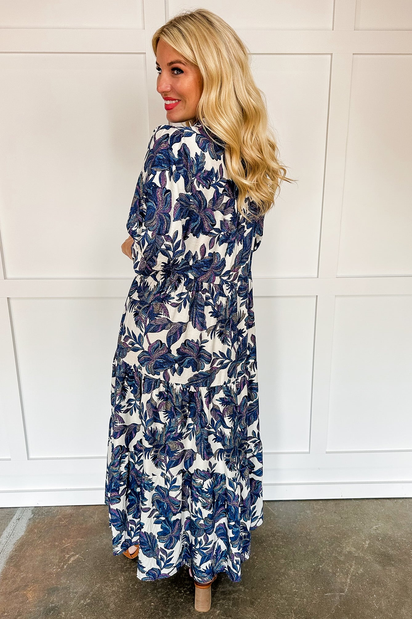 Step into effortless elegance with the Rustic Charm Blue Floral Maxi Dress. This playful white maxi dazzles with delicate blue florals and features 3/4 length sleeves that add a breezy touch. The flattering V-neck with button-down detail invites a hint of flirtiness, perfect for sunny days or evening strolls. Embrace comfort and style in one stunning flowy silhouette.