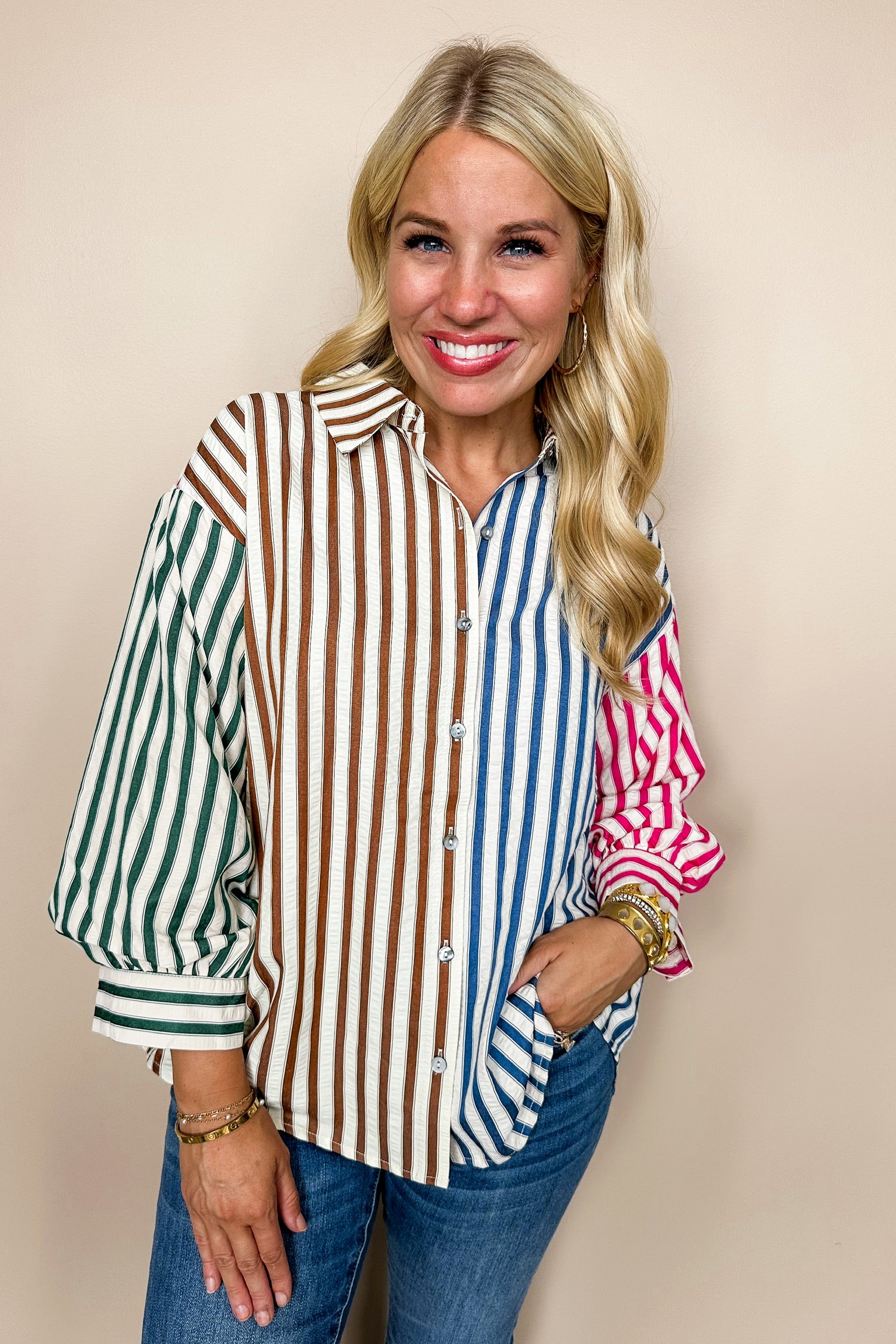 Bring vibrant fun to your wardrobe with this Color Block Striped Button Down Shirt. Featuring a classic collar and colorful blocks, it adds a playful twist to any outfit. Designed with inclusive sizing, it ensures a comfortable and flattering fit for everyone ready to brighten their day.