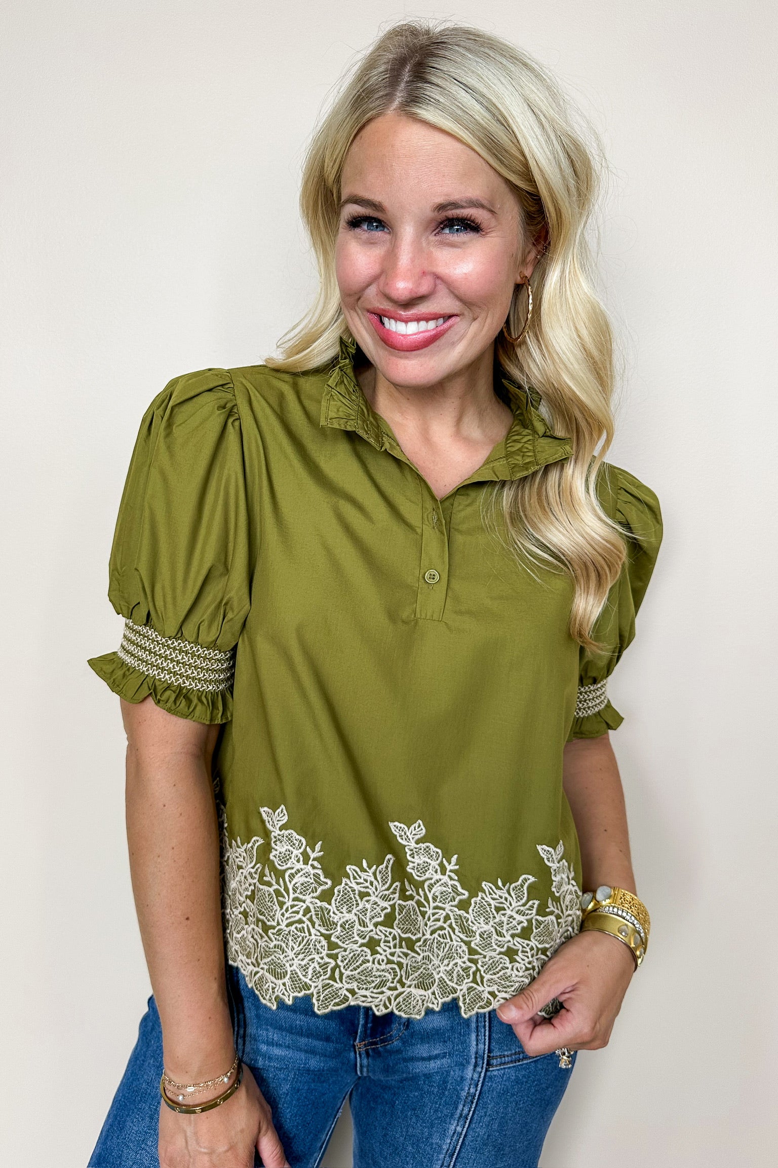 Elevate your look with the Hold You Close Green Puff Sleeve Top. Featuring a playful V-neck and charming puff sleeves, this olive-hued blouse stands out with its striped and embroidered details. The quartered button-down front adds a touch of whimsy, making it perfect for days when you want to feel effortlessly stylish and a little bit mischievous.