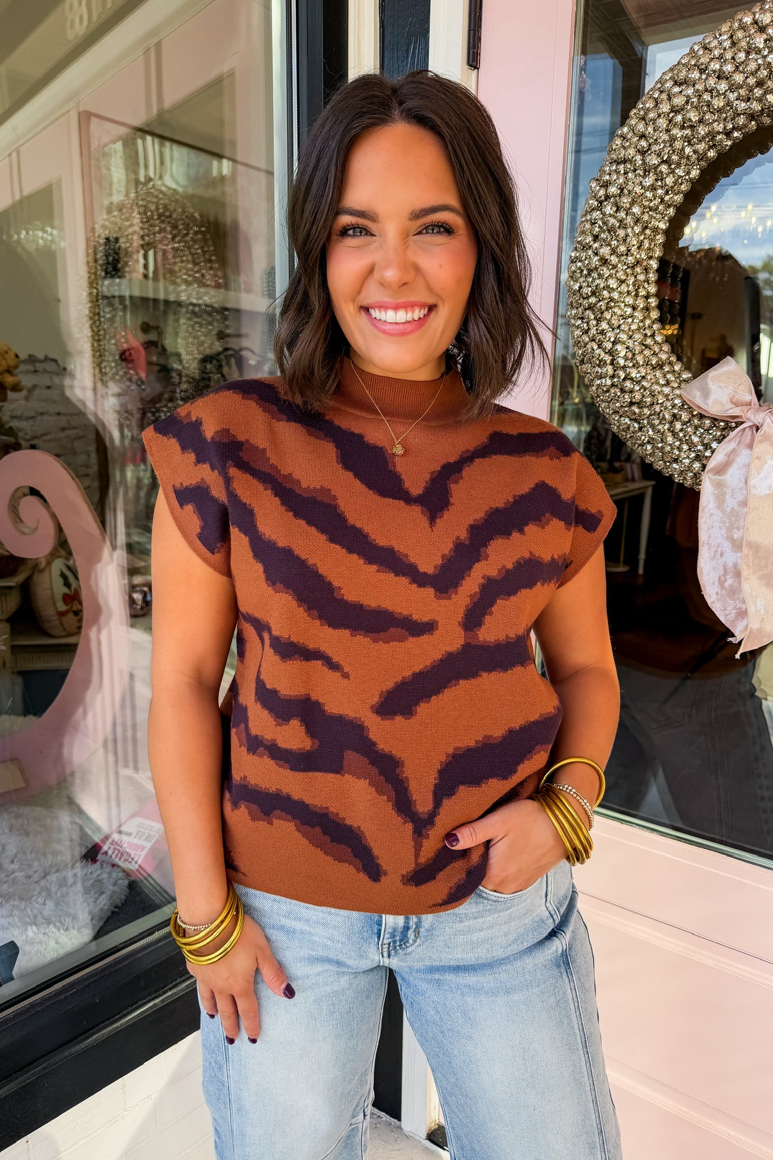 Make a statement this season in The Wild Luxe Sweater Vest. Featuring a bold tiger-inspired print in warm caramel and deep espresso tones, this knit vest blends cozy comfort with high-end edge. Perfect for layering over a crisp button-down or wearing solo for a modern, elevated look — it’s the piece your fall wardrobe’s been waiting for.