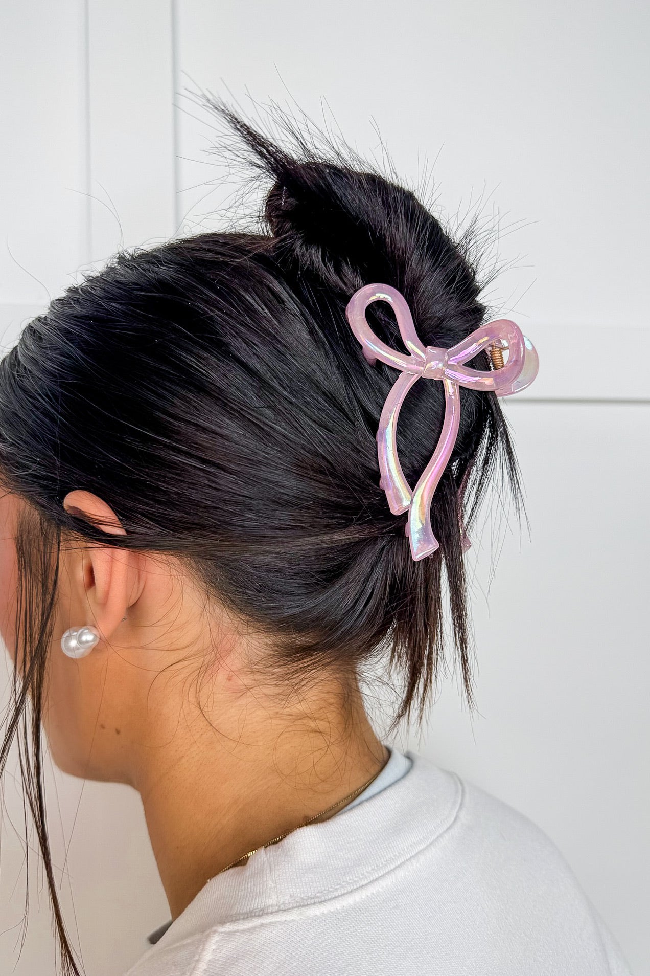 Sweet and feminine, the Blushing Bow Claw Clip adds the perfect touch of charm to your hair. With its soft pink acrylic finish and delicate bow design, this clip is perfect for effortless half-up styles or securing your hair with a stylish twist.