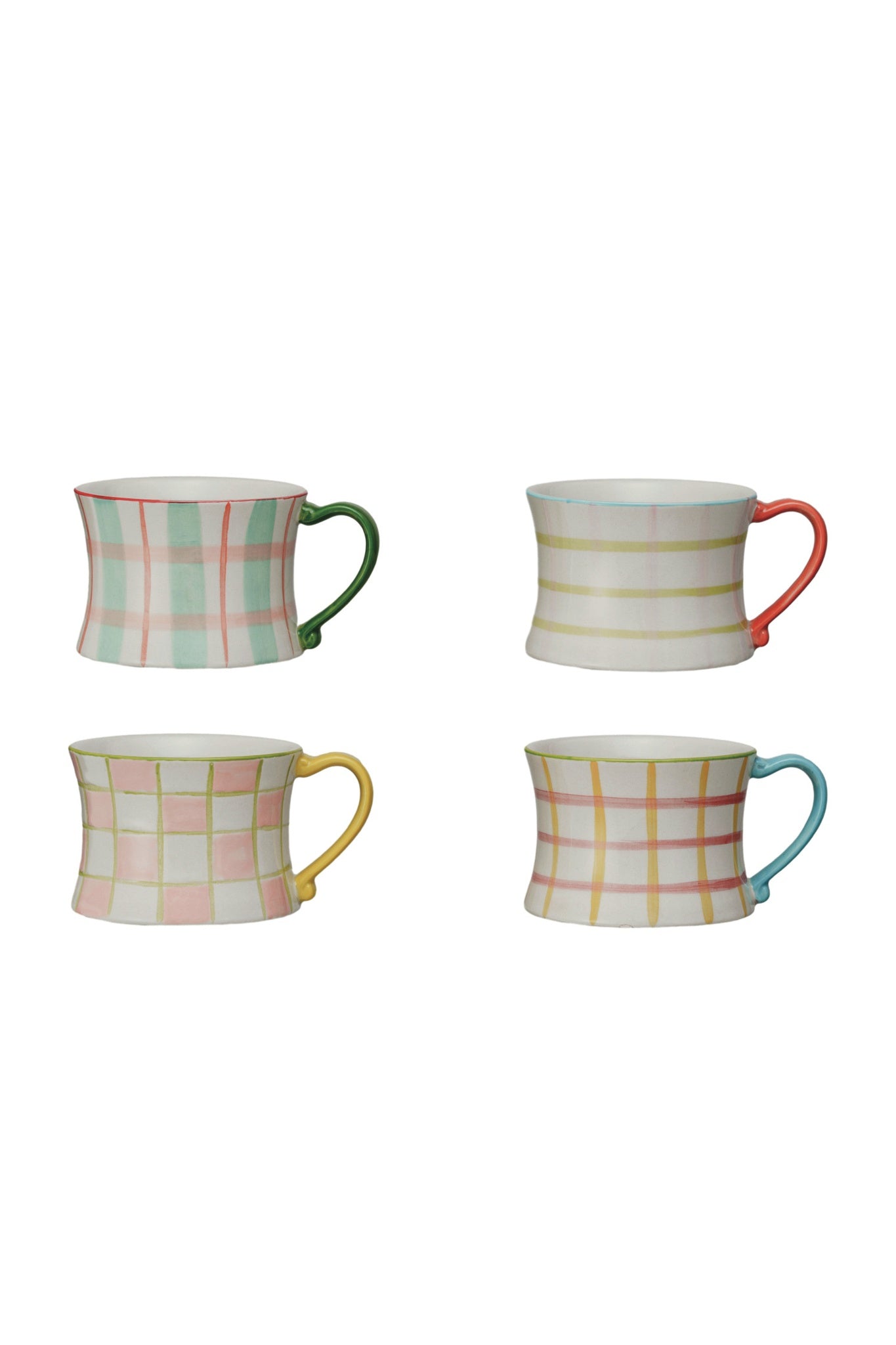 Brighten your morning routine with the Pastel Garden Hand-Painted Stoneware Mug Collection. Each mug features a charming hand-painted plaid or stripe pattern in soft pastel tones paired with a colorful handle for a playful, artisanal look. Crafted from durable stoneware, these 8 oz. mugs are perfect for coffee, tea, or your favorite warm beverage. Their cheerful colors and handcrafted details bring a cozy cottage-inspired charm to your kitchen or coffee bar. Mix and match the four unique styles to create a vibrant and inviting table setting.