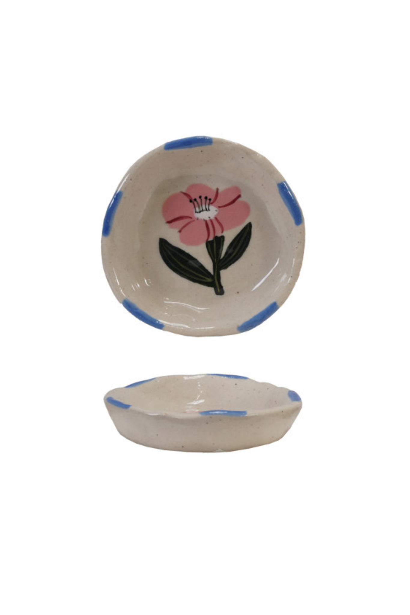 Add a charming botanical touch to your tabletop or vanity with the Petite Garden Hand-Painted Stoneware Mini Dish. Each small organic-shaped dish features a delicate hand-painted flower illustration at the center and colorful rim accents for a playful artisan feel.