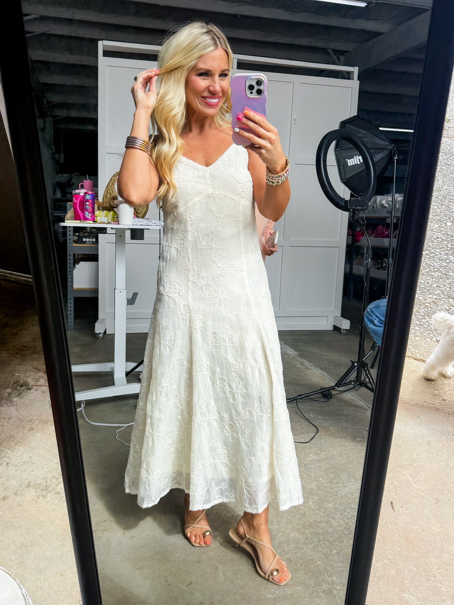 The dainty straps and subtle texture add a feminine touch, while the lightweight fabric moves beautifully with you. Whether you're heading to a bridal shower, beach dinner, or summer event, this dress is the perfect blend of grace and simplicity.