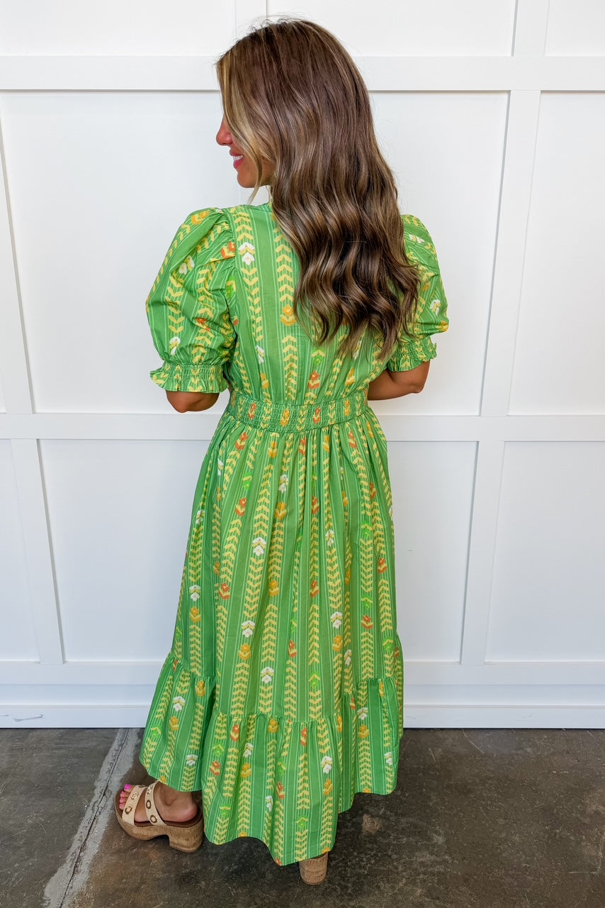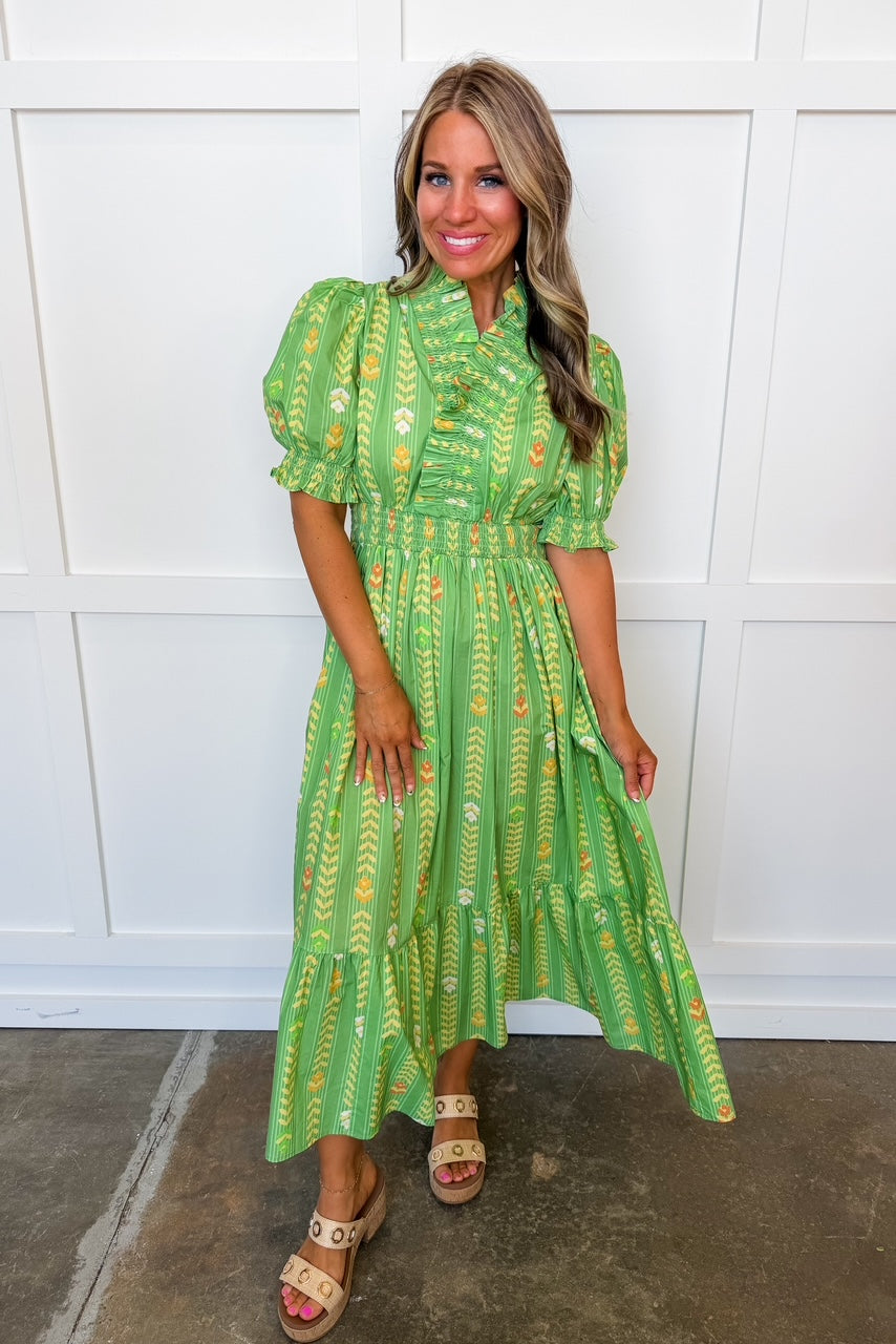 Meet one of our most-loved silhouettes—easy, flattering, and endlessly wearable. This dress features a best-selling smocked waist that defines your shape while offering all-day comfort, paired with a breezy ruffle hem skirt for effortless movement. The block-print–inspired chevron floral adds a playful yet polished touch, making it perfect for everything from daytime events to weekend outings. Lightweight and feminine, this is the kind of dress you’ll reach for again and again.