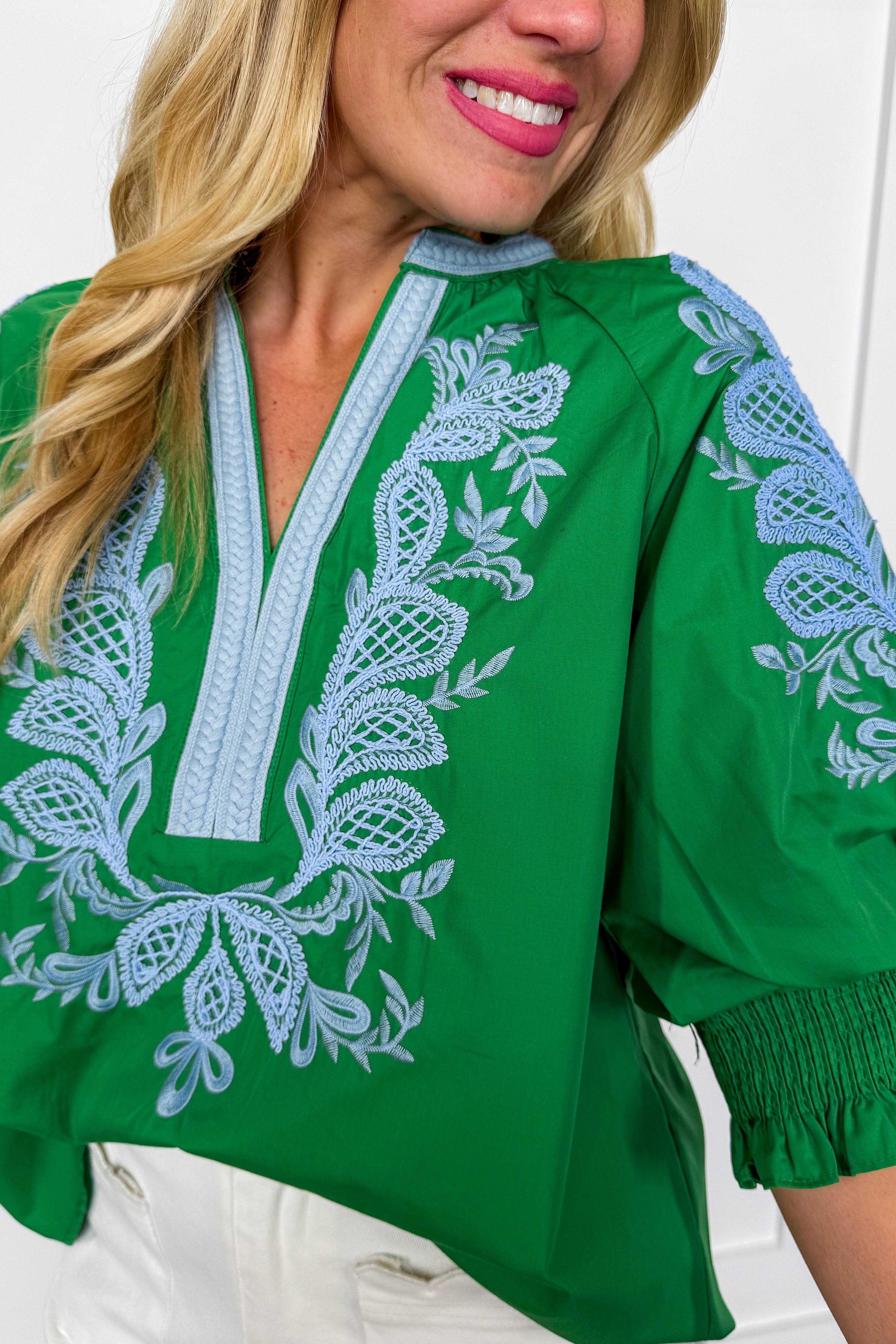Timeless with a touch of refined detail, The Laurel Green & Light Blue Embroidered Top is a beautifully crafted piece that elevates everyday dressing. Designed in a rich green hue, this top features intricate light blue embroidery that adds contrast and elegance without overwhelming the look. The split neckline and smocked puffed sleeves create a flattering silhouette that feels polished yet easy to wear. Perfect for pairing with denim, tailored pants, or skirts, this top brings classic charm to any wardrobe.