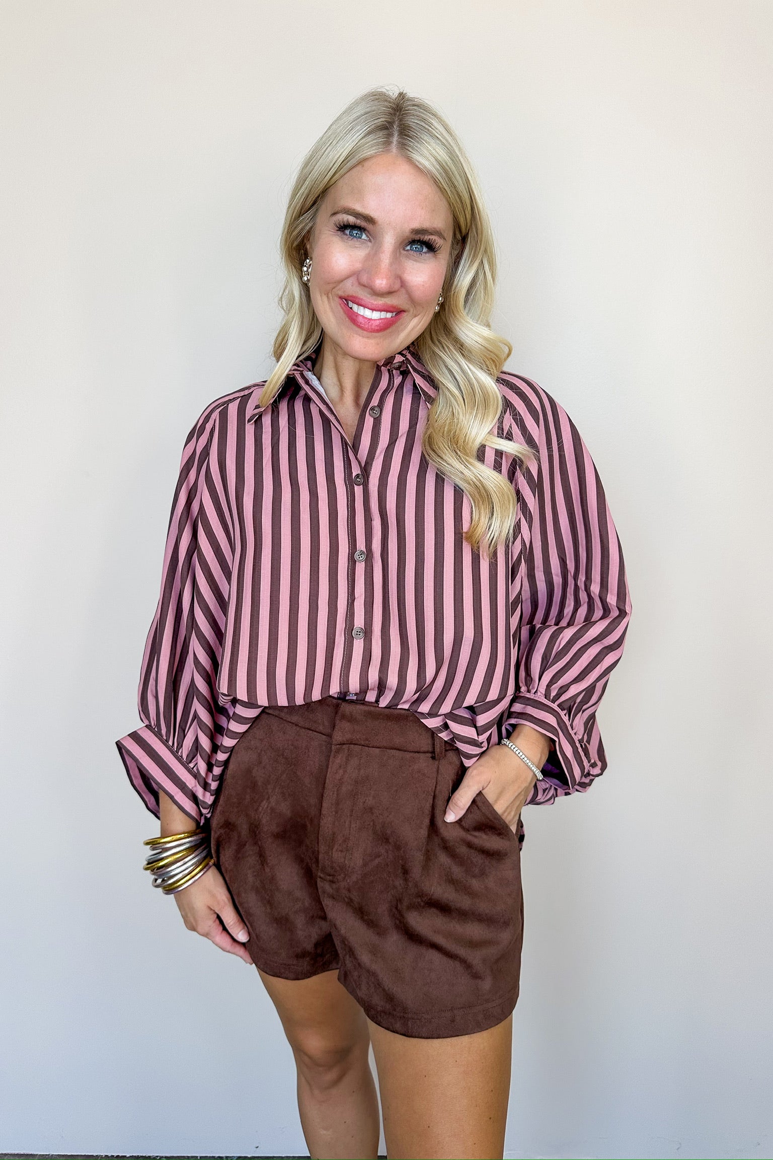 Elevate your wardrobe with these sophisticated Chocolate Brown Suede 3in Seam Shorts featuring a stylish button-up detail and practical belt loops. Designed with pockets for convenience, they offer versatile elegance that can effortlessly transition from casual daywear to a polished evening look.