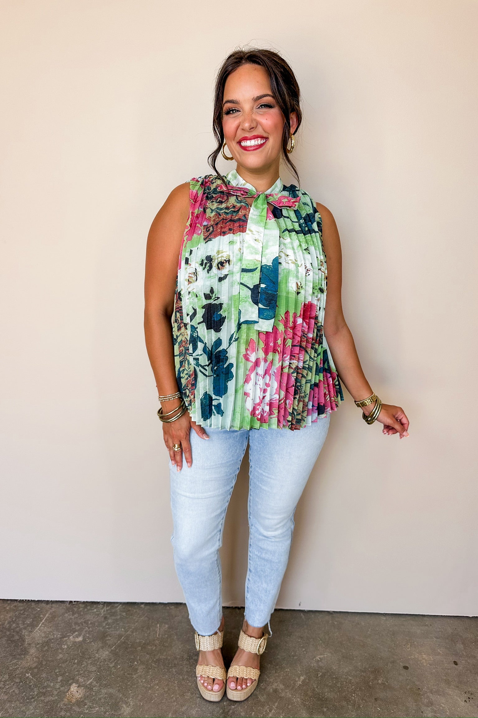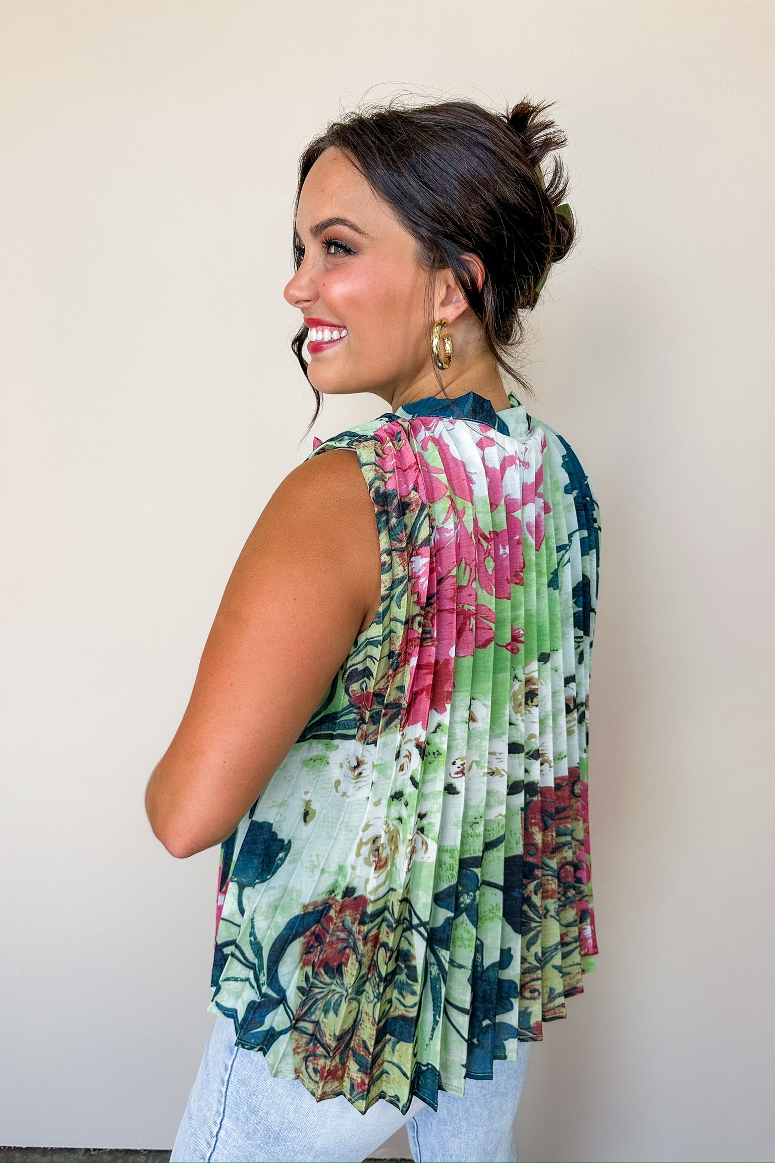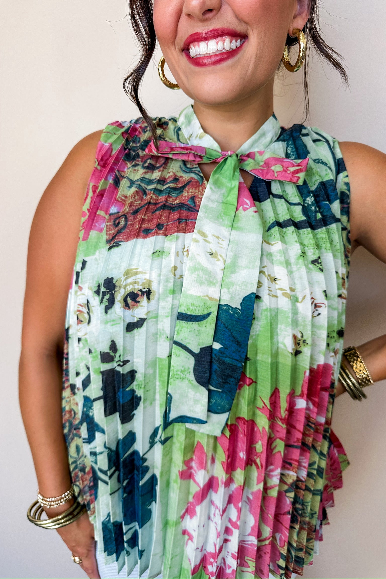 Add a burst of color to your day with our Bright Blooms Pleated Blouse. This high-neck, sleeveless top features a gorgeous floral print in green, pink, and vibrant hues that instantly uplift your look. Designed with delicate pleats for an elegant touch, it’s perfect for pairing with tailored pants for work or white denim for a fresh, chic weekend outfit.