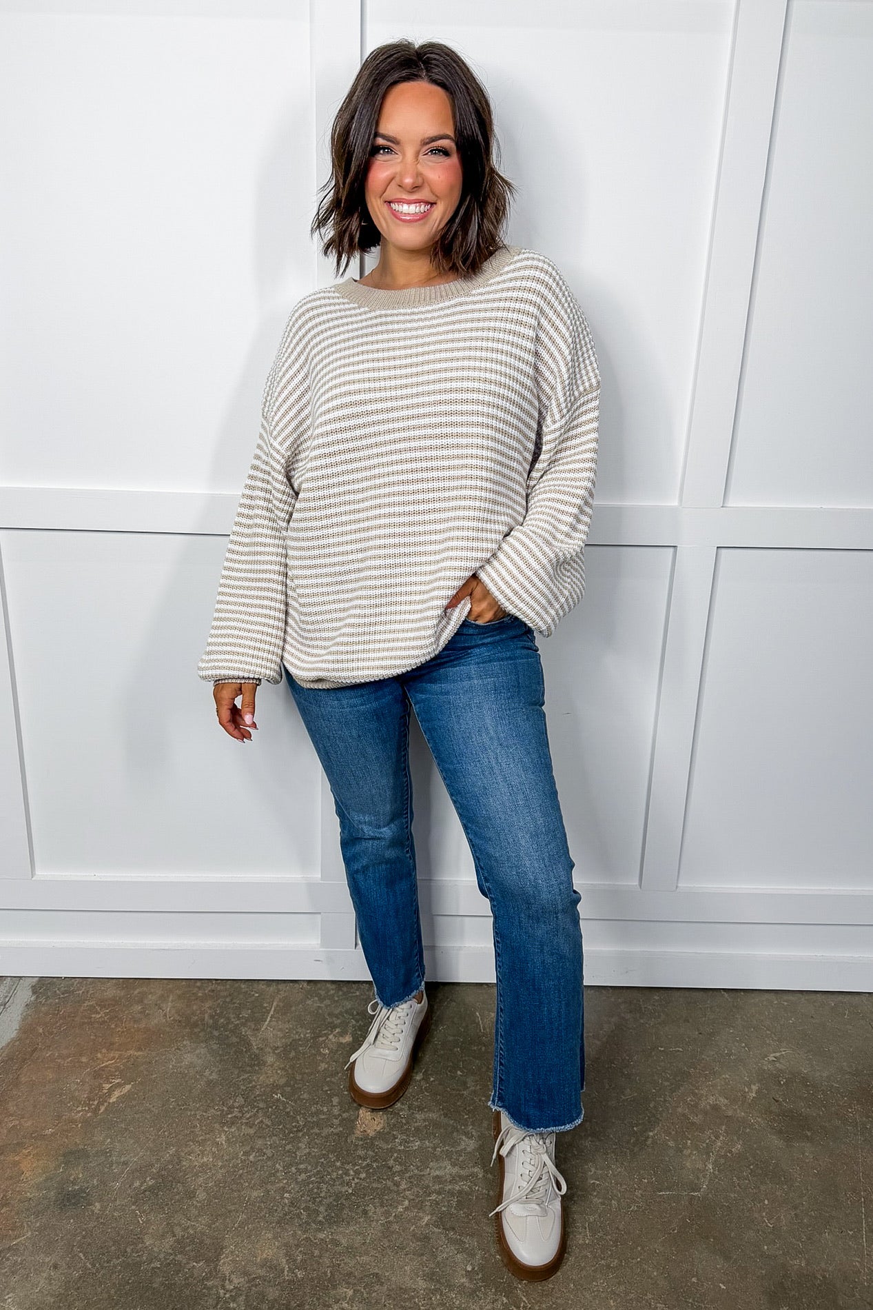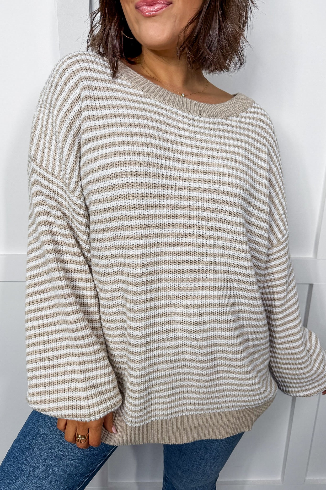 Meet the Natural Drift Striped Knit Sweater — a relaxed, neutral staple made for effortless style and everyday comfort. With its soft knit feel and classic stripe design, this sweater strikes the perfect balance between cozy and polished. The slouchy fit drapes beautifully, while ribbed cuffs and hem give it a clean, finished look. Easy to pair with denim or leggings. It’s the kind of sweater that instantly pulls an outfit together with minimal effort. Simple, versatile, and endlessly wearable — this piece belongs in your regular rotation.