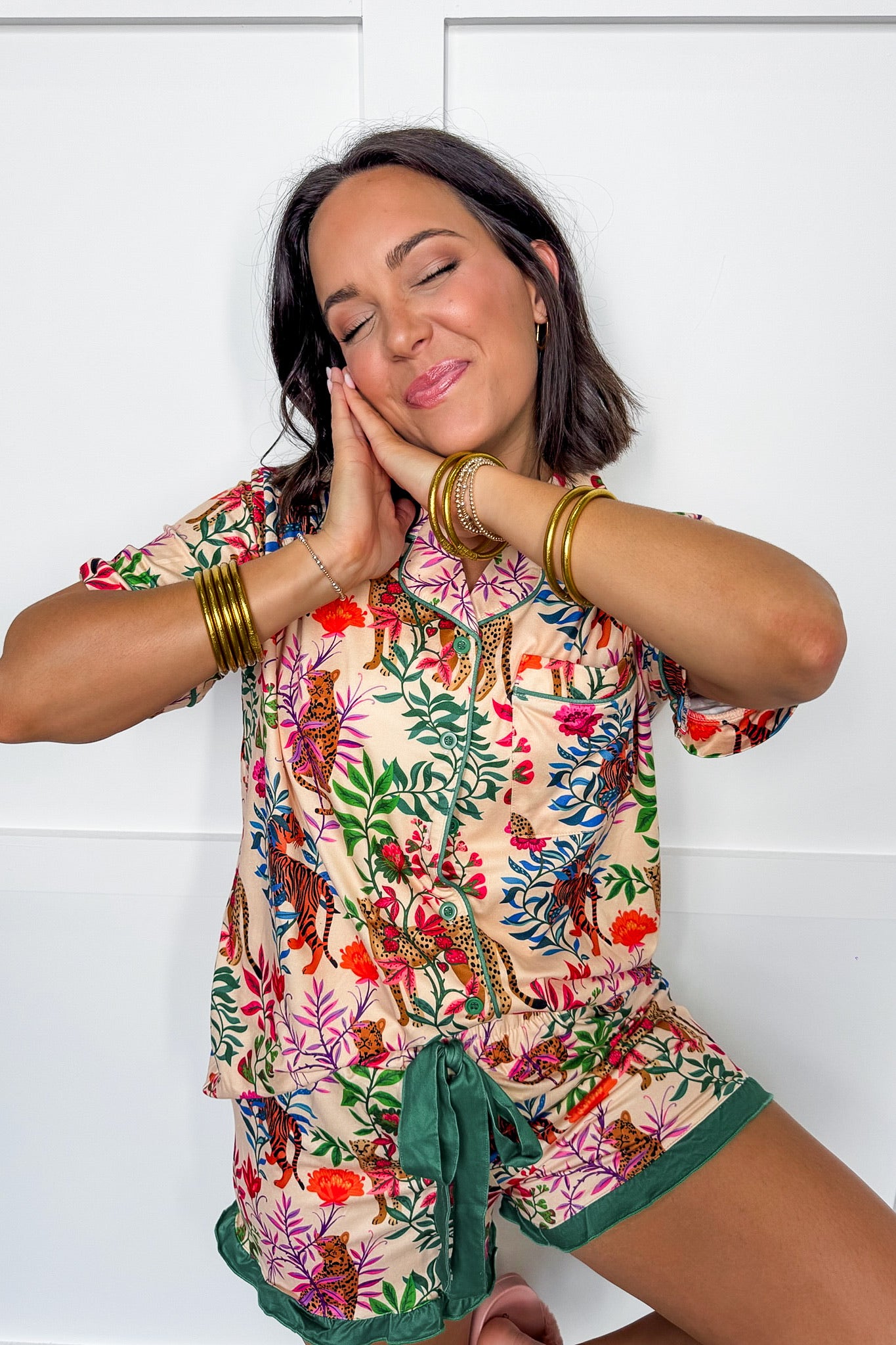 Drift into the sweetest dreams in this vibrant pajama set. Covered in colorful florals, playful animals, and trimmed with the cutest ruffled hem, this set brings all the fun and coziness to your nighttime routine. Lightweight, buttery soft, and perfect for warm sleepers or lounging around the house — you’ll never want to take them off!