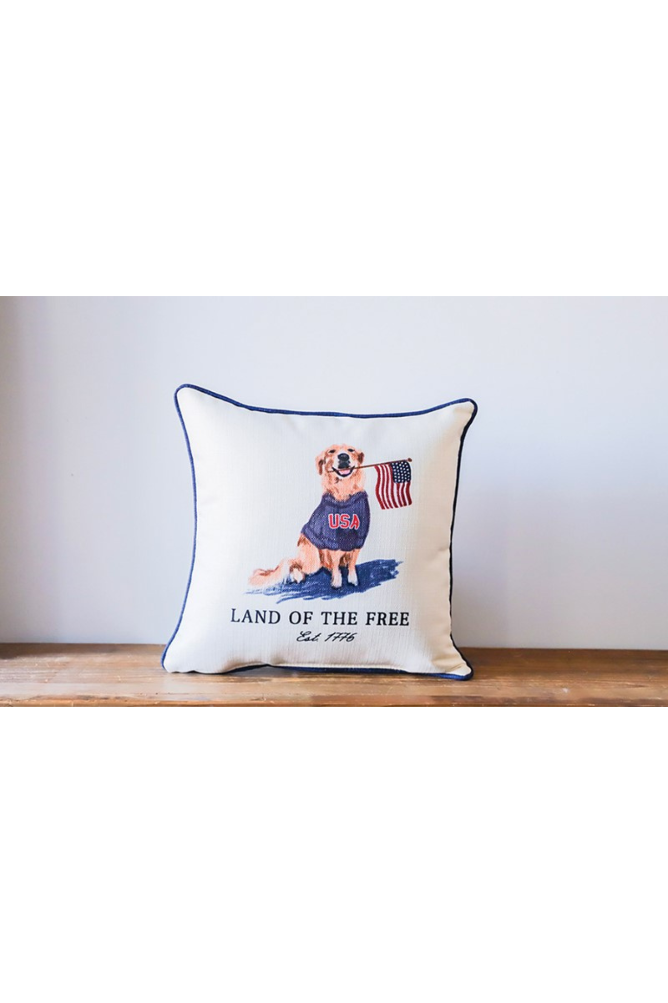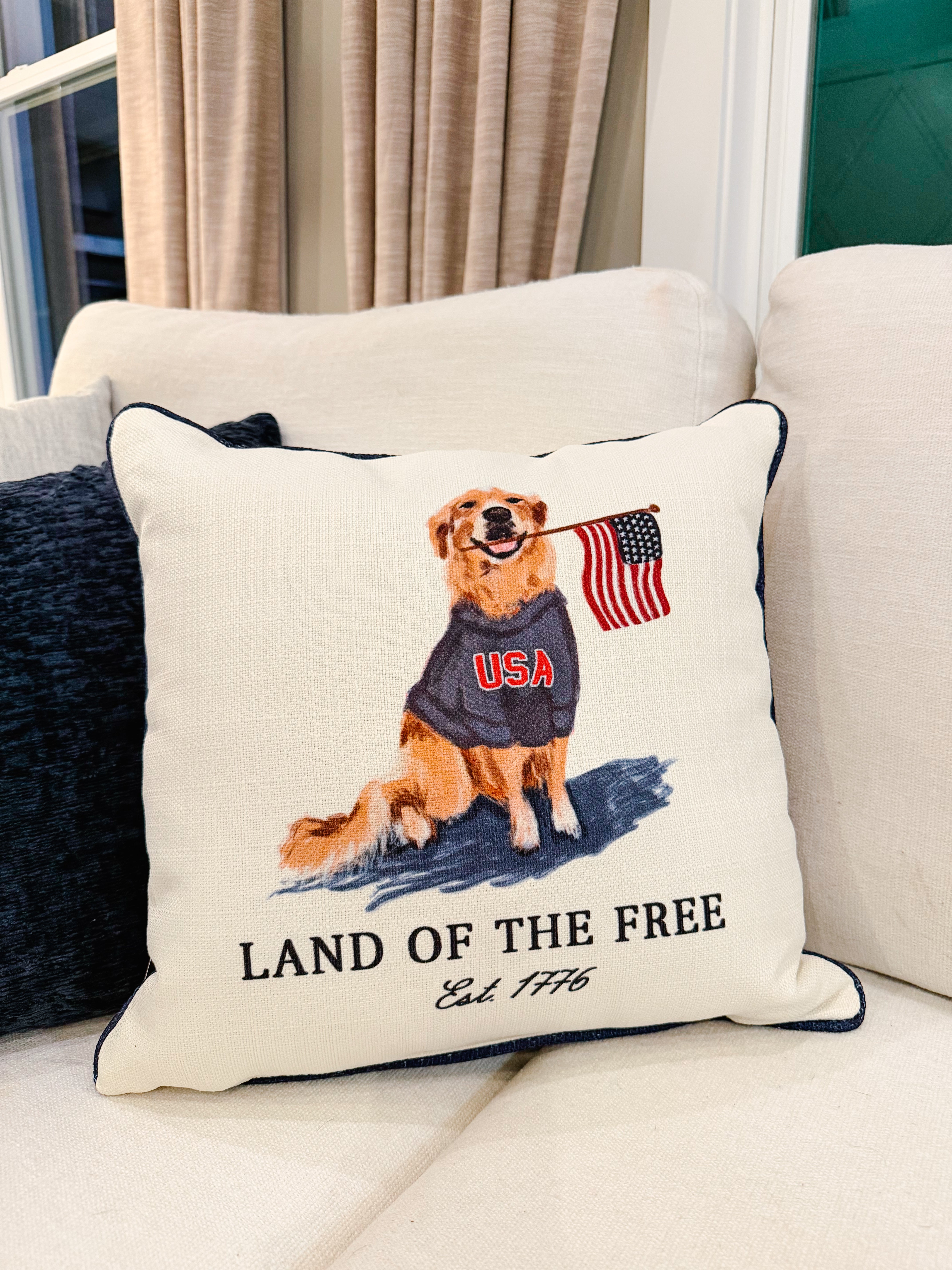 Add a touch of Americana charm to your home with the Land of the Free Golden Retriever Pillow. Featuring an adorable Golden Retriever holding an American flag and classic “Land of the Free” lettering, this piece brings warmth, personality, and patriotic spirit to any space.