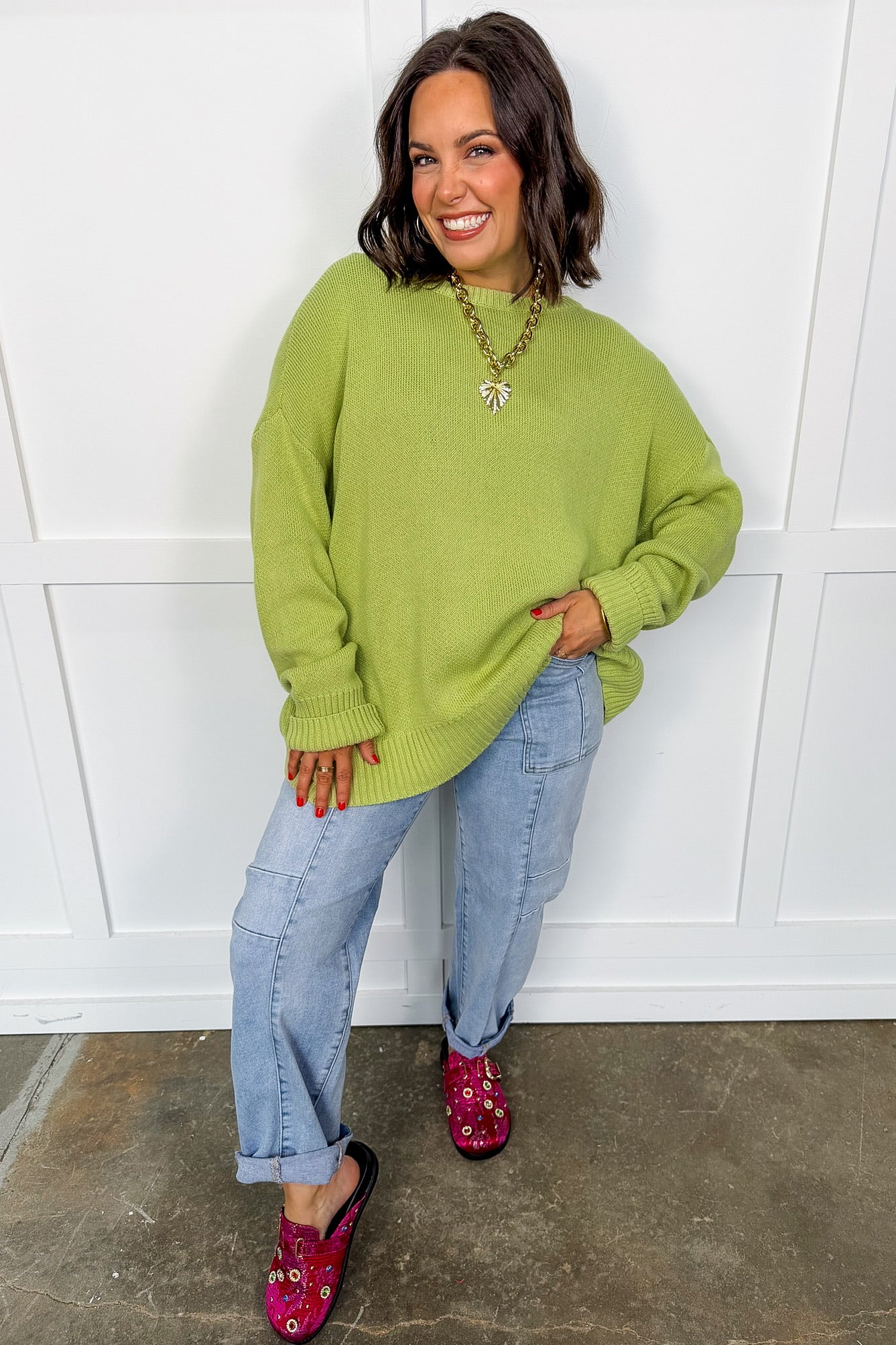 Meet your new everyday essential — The Fresh Start Oversized Sweater. This dreamy light-green knit brings the perfect blend of comfort and chic. Designed with an ultra-relaxed silhouette, dropped shoulders, and a flattering high-low hem, it drapes effortlessly for that cozy-yet-polished look. Soft, lightweight, and easy to style with denim, leggings, or layered over dresses — this is the grab-and-go sweater you’ll wear nonstop.