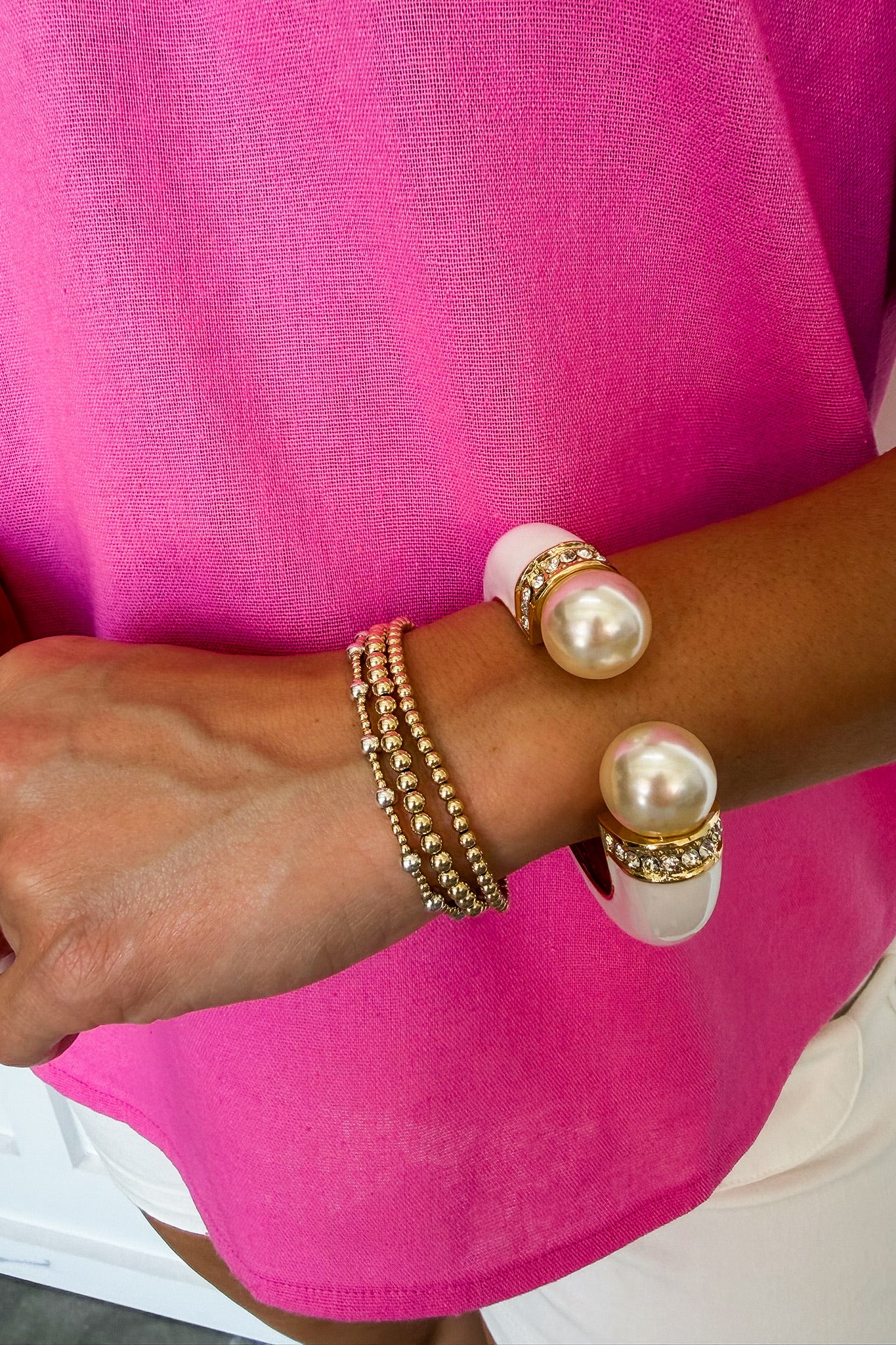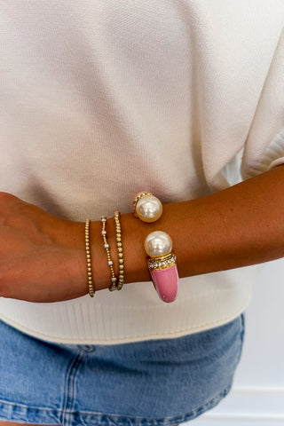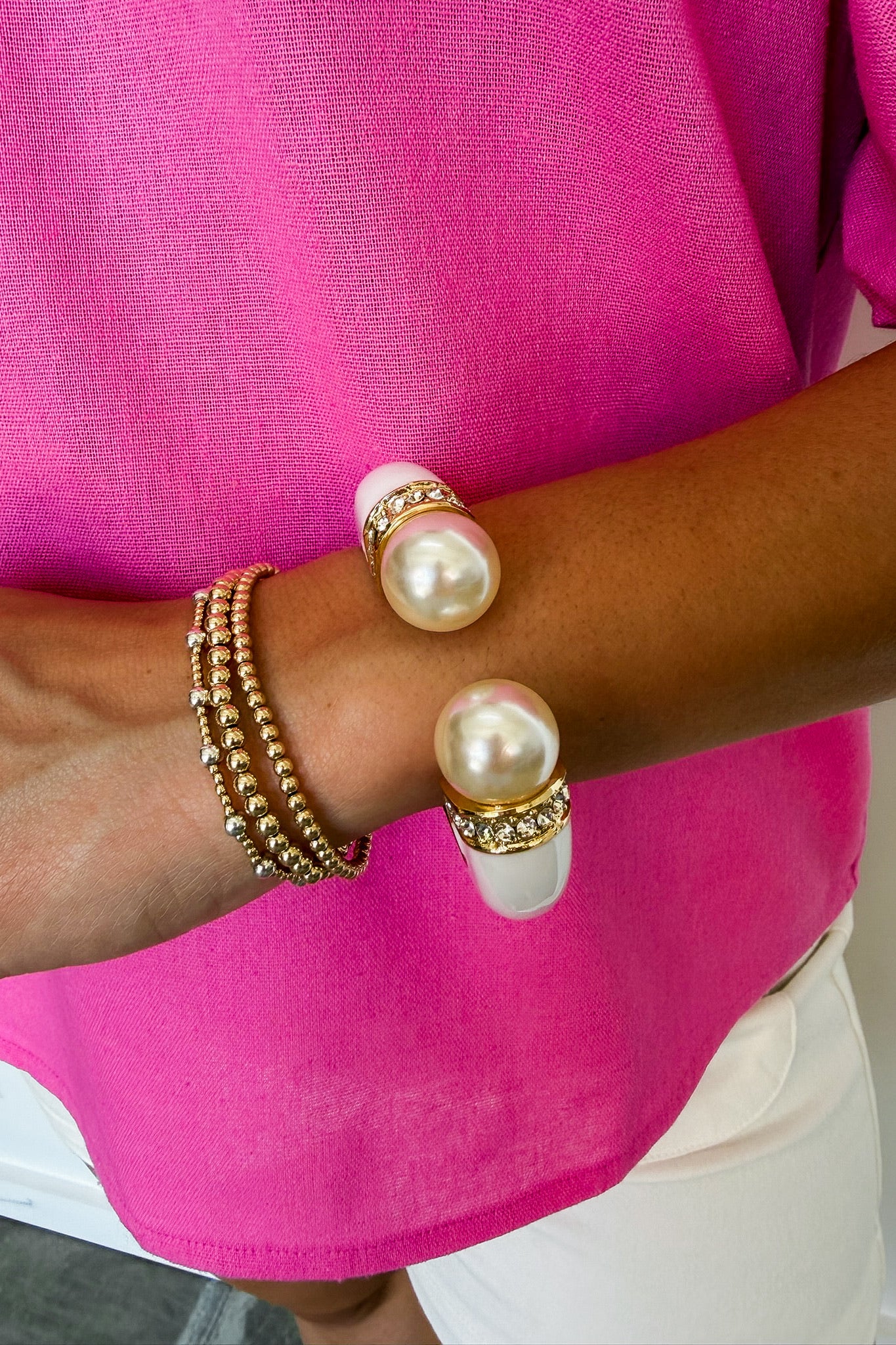 The Pearl Pop Hinge Bracelet is the perfect mix of classic elegance and playful color. Featuring a glossy enamel finish paired with chic pearl accents and subtle rhinestone detailing, this statement piece instantly elevates any look. The hinged design makes it easy to slip on and go, while the bold yet feminine style adds the perfect pop to your everyday stack or stands beautifully on its own.