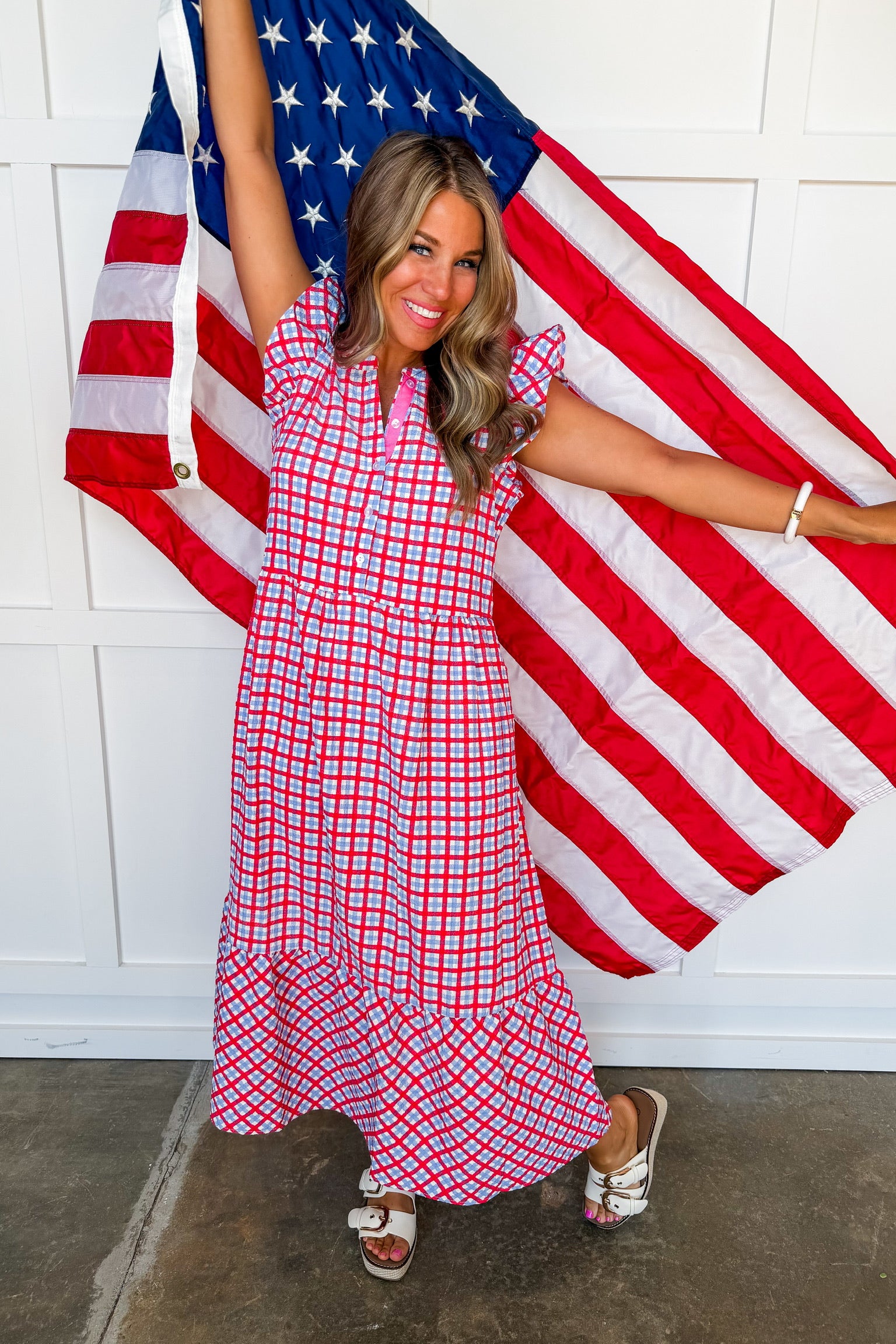 The Riley Midi Dress in Red/Blue Gingham by Mary Square is the perfect mix of classic charm and playful detail. Featuring a timeless gingham print, this dress is designed with feminine flutter sleeves and a flattering midi silhouette for an easy, effortless fit. The lightweight fabric keeps it comfortable for all-day wear, while the classic pattern makes it ideal for USA-inspired and patriotic looks. With functional pockets and a breezy feel, it’s a go-to for everything from holiday weekends to everyday outings.