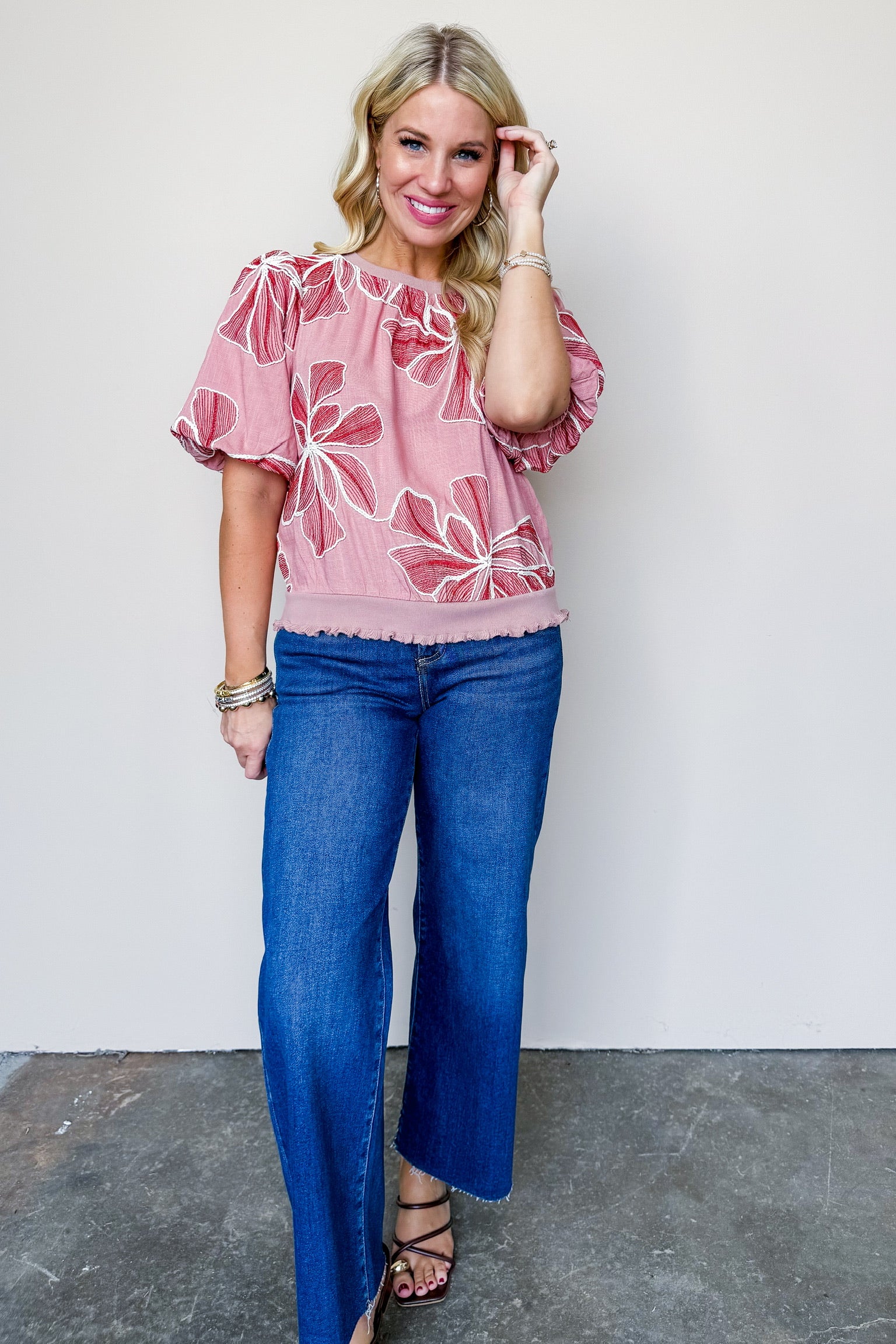 Elevate your wardrobe with The Wildflower Whimsy Pink Top, a sophisticated floral blouse featuring delicate short puff sleeves and a classic crew neck. Its tailored fit hits gracefully at the waist, offering a refined silhouette that combines timeless charm with subtle whimsy—perfect for both daytime elegance and evening gatherings.