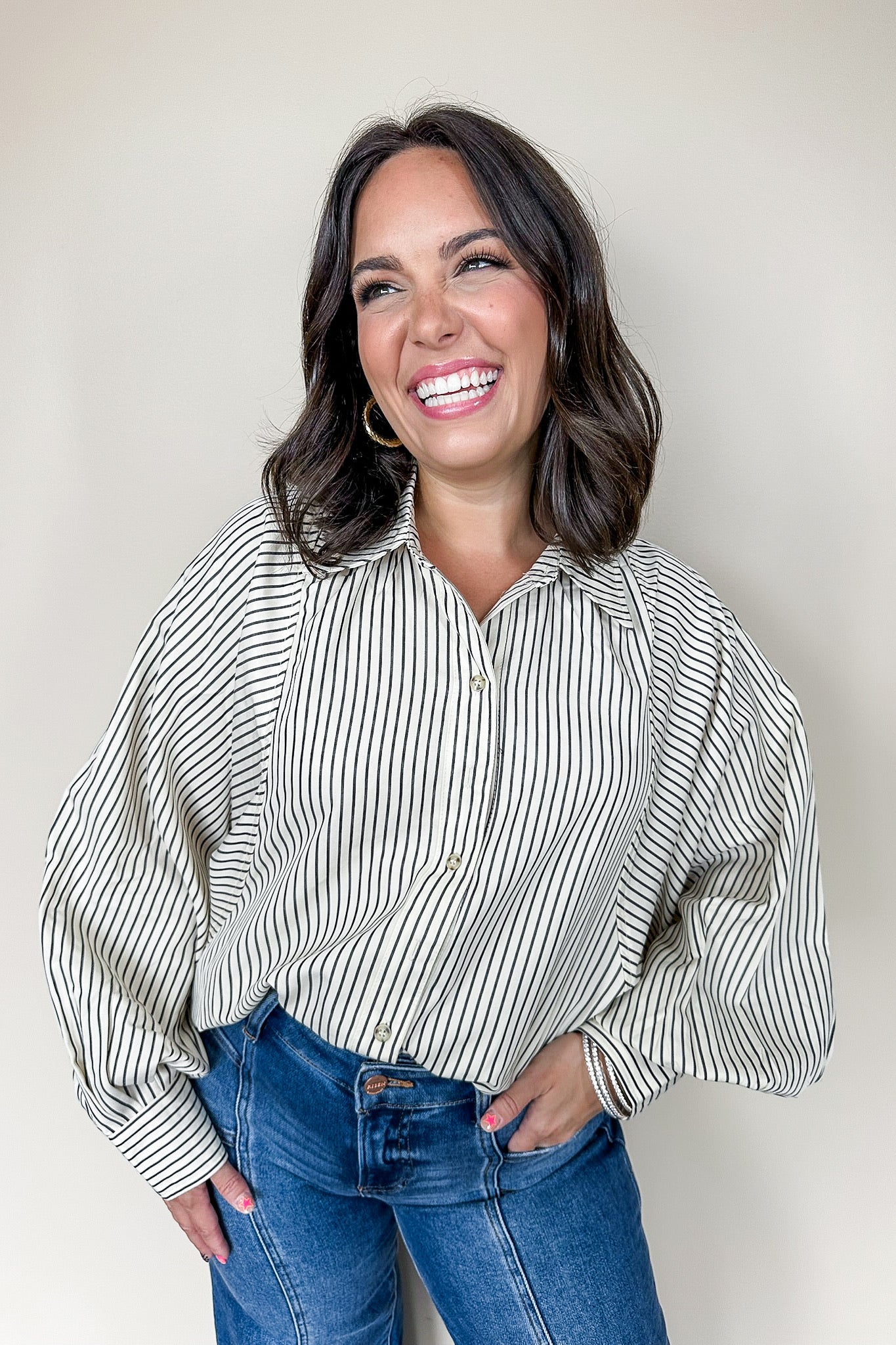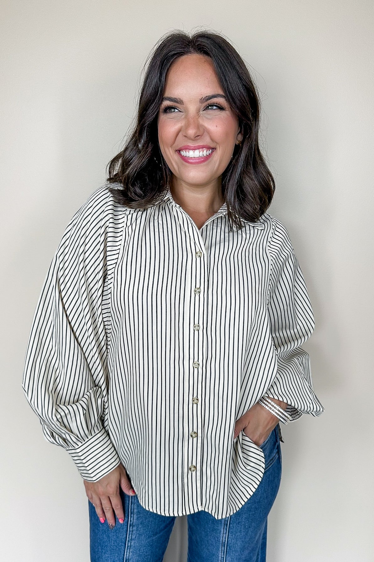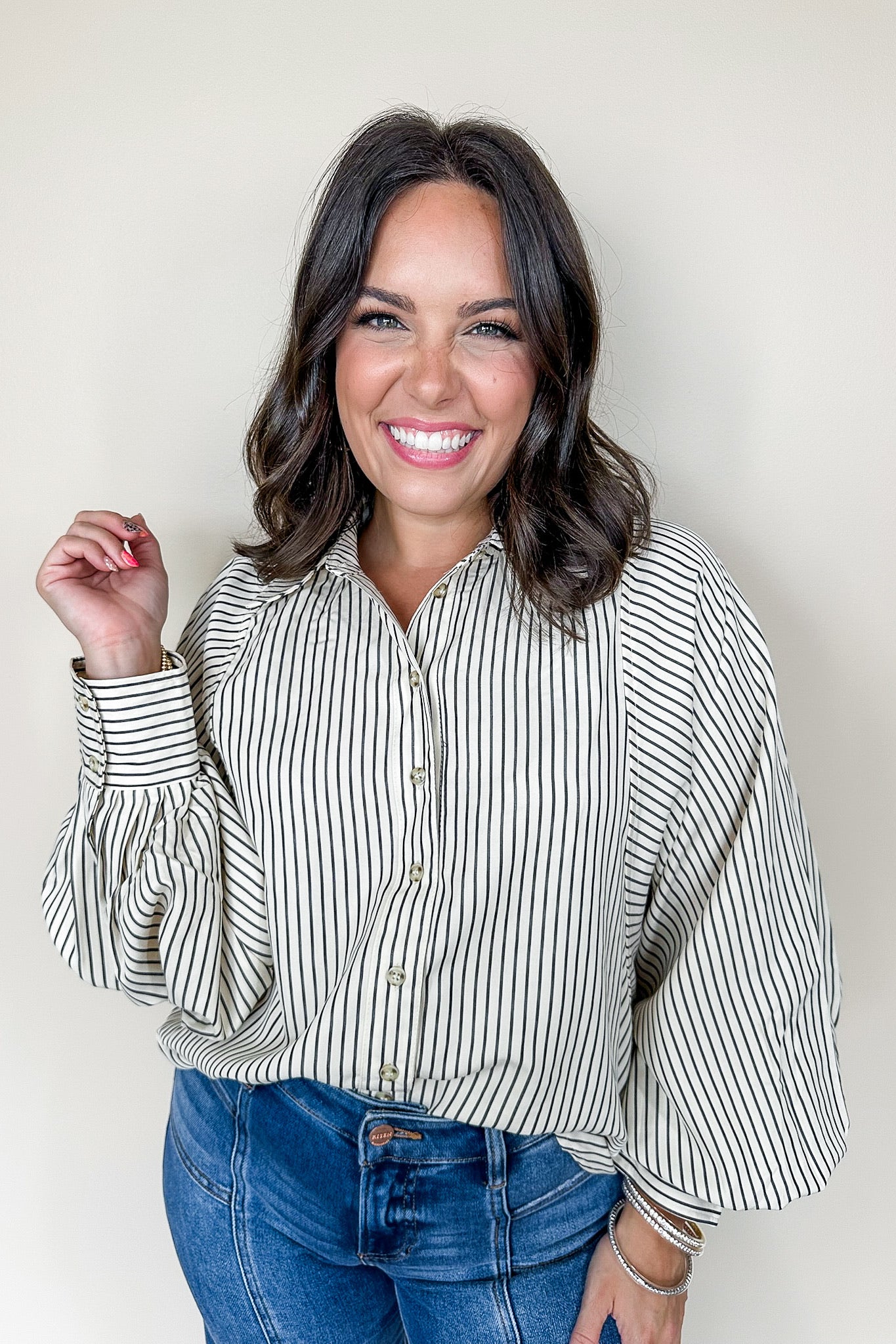 Embrace breezy style with this Black & Cream Billowy Striped Button Down Top. Featuring playful balloon sleeves and a chic cream and black stripe pattern, this top adds fun flair to any outfit. The flattering V-neck and high-low hemline give it a trendy twist, while the button-down front lets you adjust your look with ease. Perfect for days when you want comfort and style to dance together!