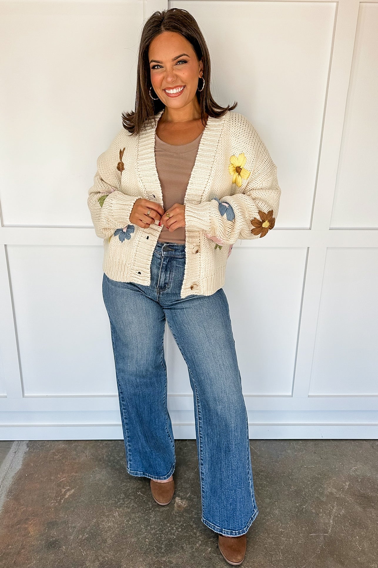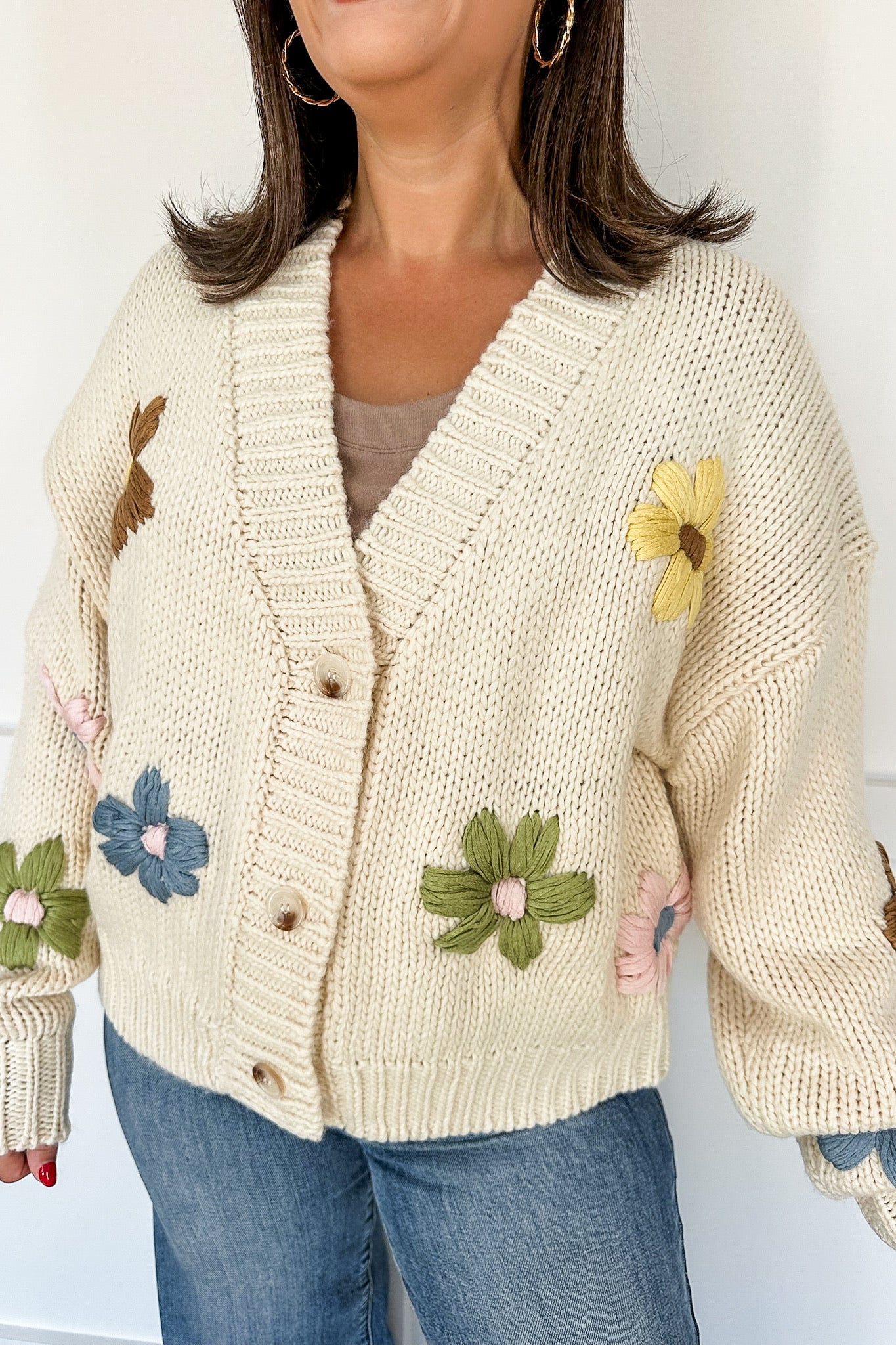Wrap yourself in charm with the Cozy Bloom Cream Cardigan. Featuring delicate stitched florals, this open-front cardigan adds a fresh and playful touch to any outfit. With no closure and a true-to-size fit, it’s perfect for layering comfort and style all day long.