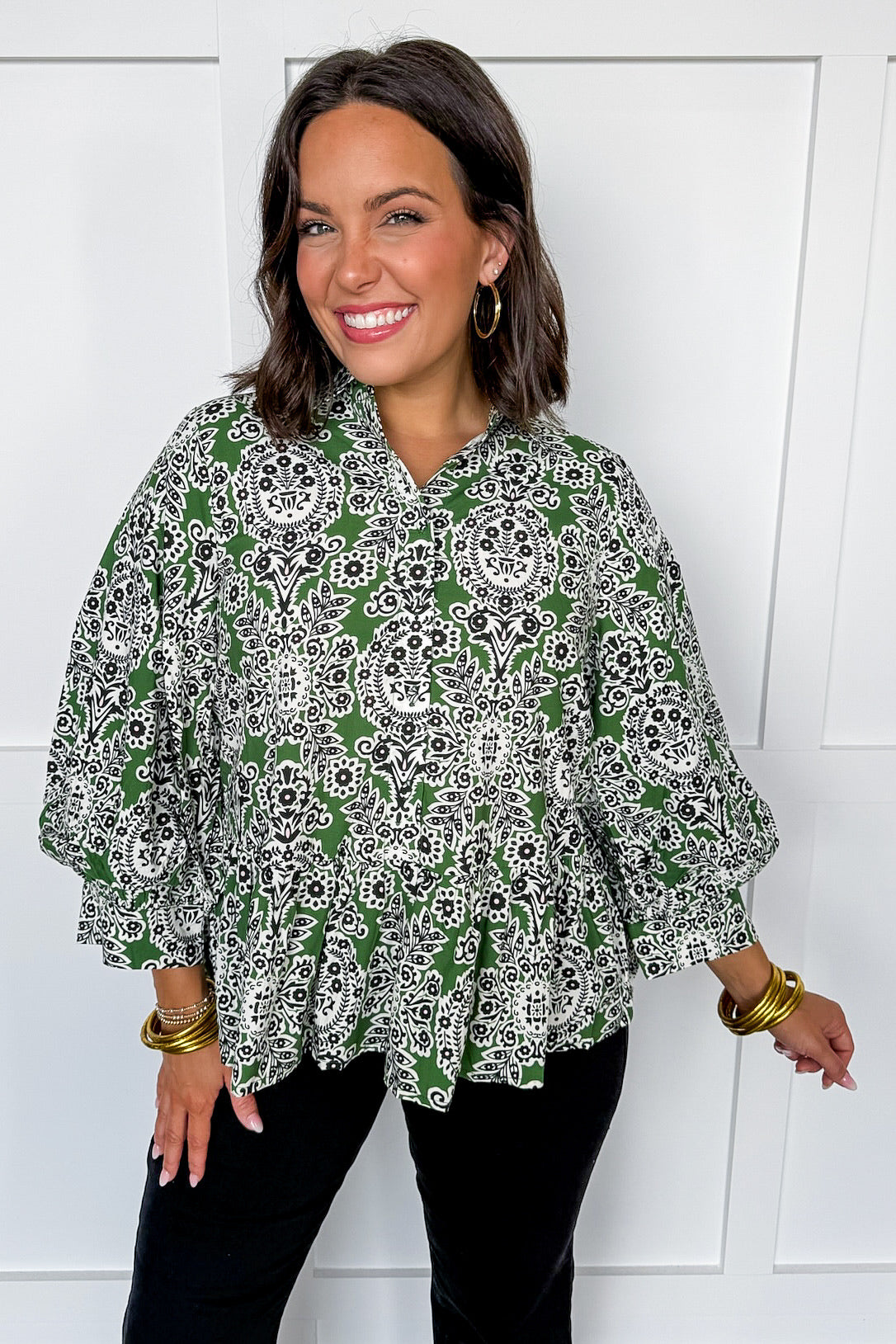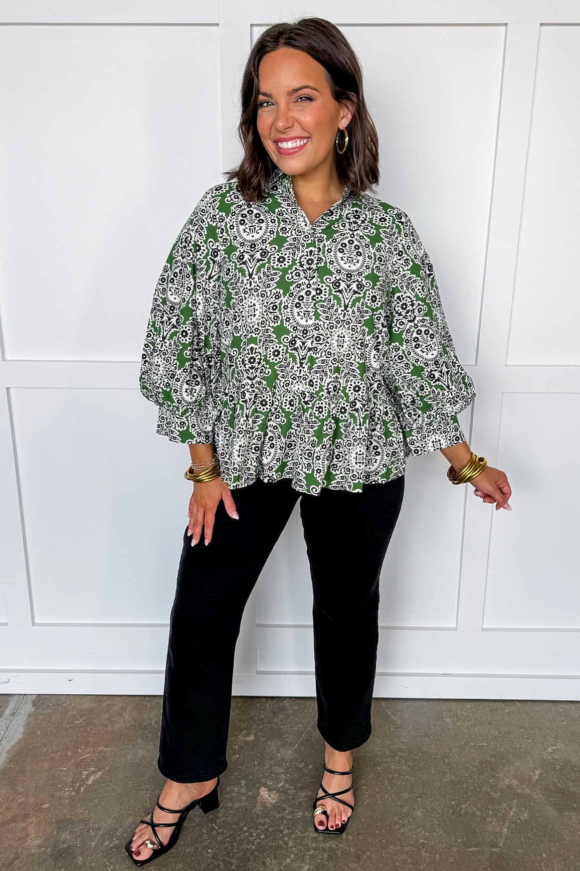 Fresh, feminine, and a little bit boho — the Emerald Peplum Top is a standout statement blouse for any season. With its rich green background, intricate white medallion print, soft peplum hem, and collared neckline, it blends polished style with easy everyday wear. Pair it with denim, white jeans, or black trousers for a look that’s effortlessly pretty and put-together.