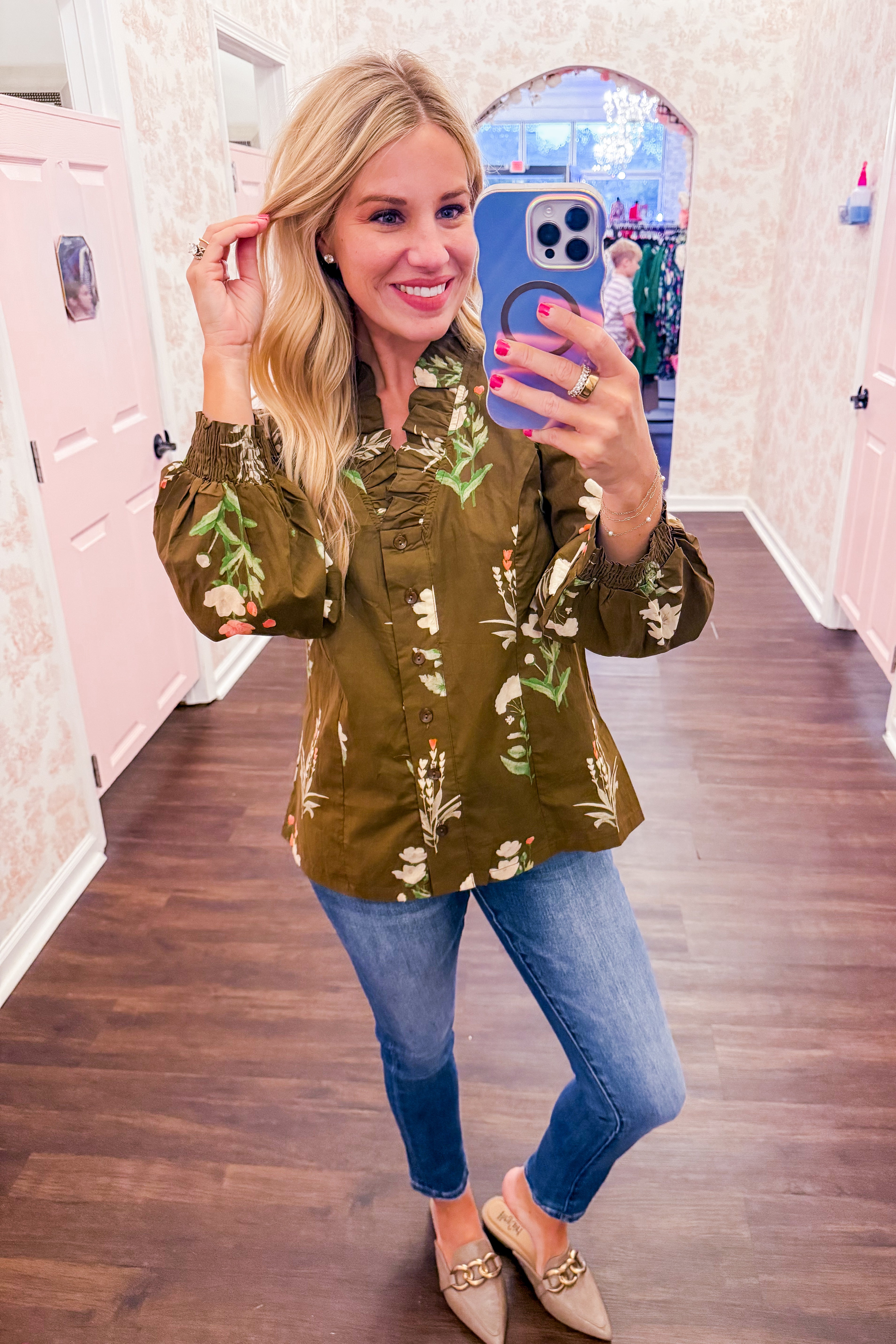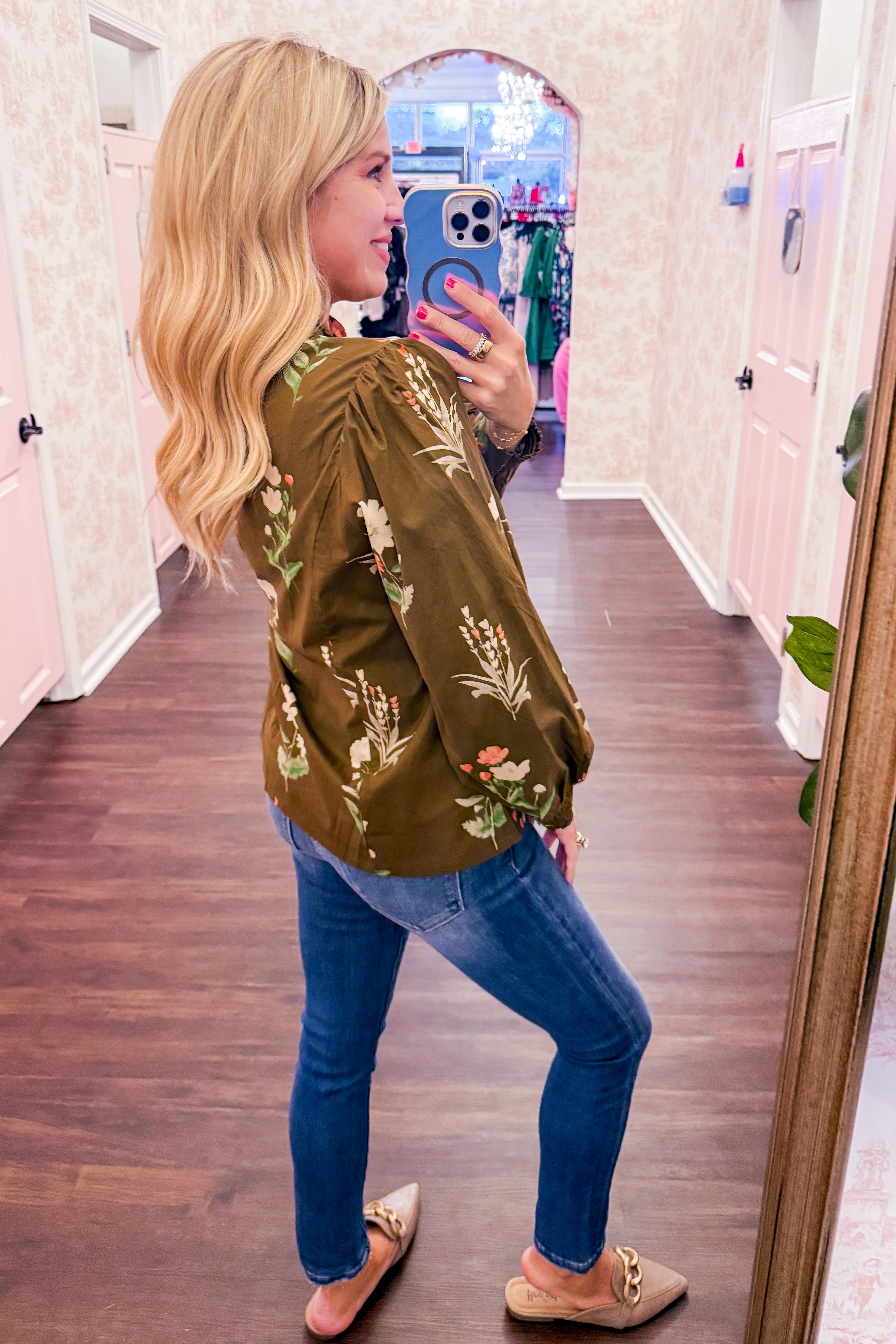 Romantic florals meet effortless charm in the Juliette Top . Designed in a soft olive-brown tone with cream and blush blooms, this Umgee favorite features a ruffled v-neckline, delicate button-front detail, and an easy relaxed fit. Perfect for pairing with denim or skirts for a feminine, fall-forward look.
