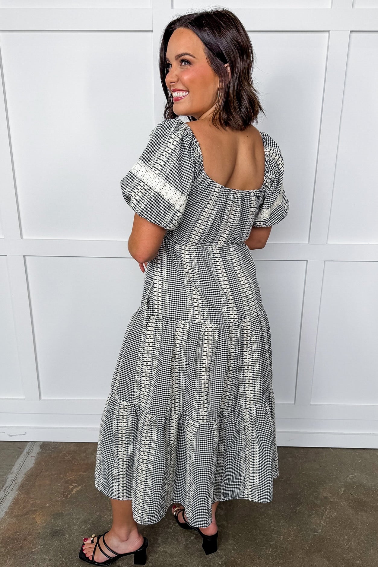 Embroidered Cream Striped Black Gingham Tiered Midi Dress