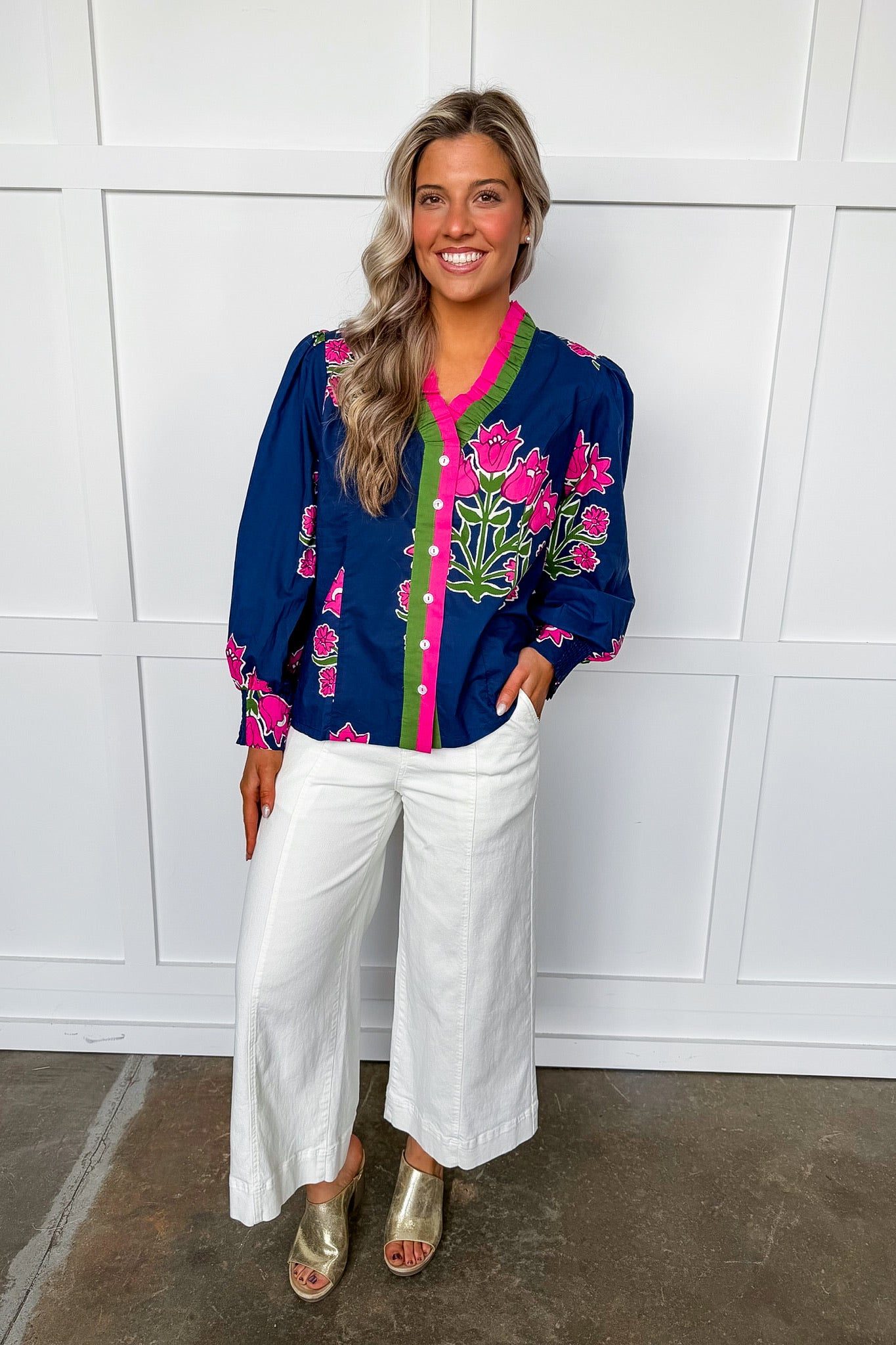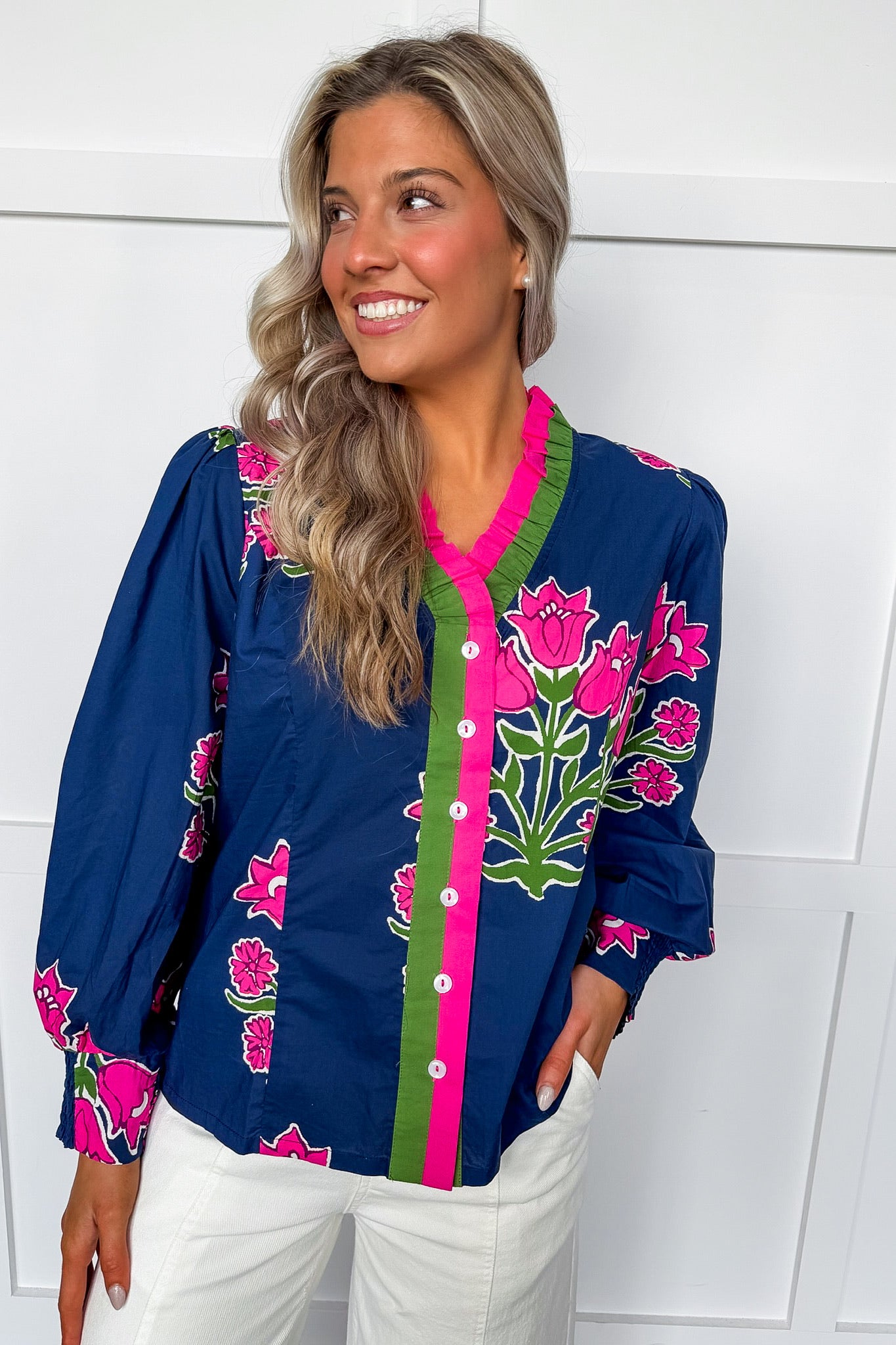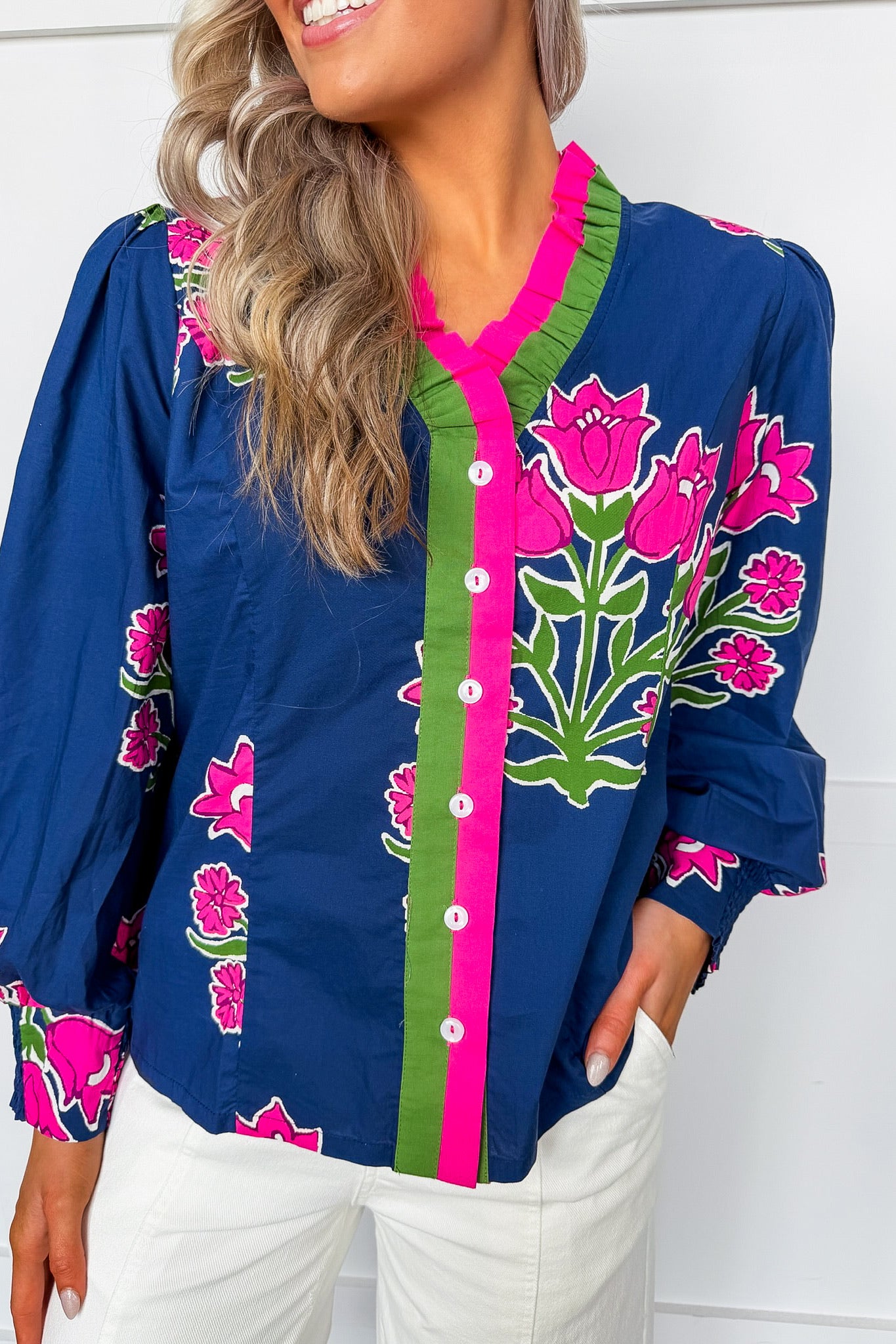 Romantic florals meet effortless charm in the Juliette Top . Designed in a deep blue tone with pink blooms, this Umgee favorite features a ruffled v-neckline, delicate button-front detail, and an easy relaxed fit. Perfect for pairing with denim or skirts for a feminine, fall-forward look.
