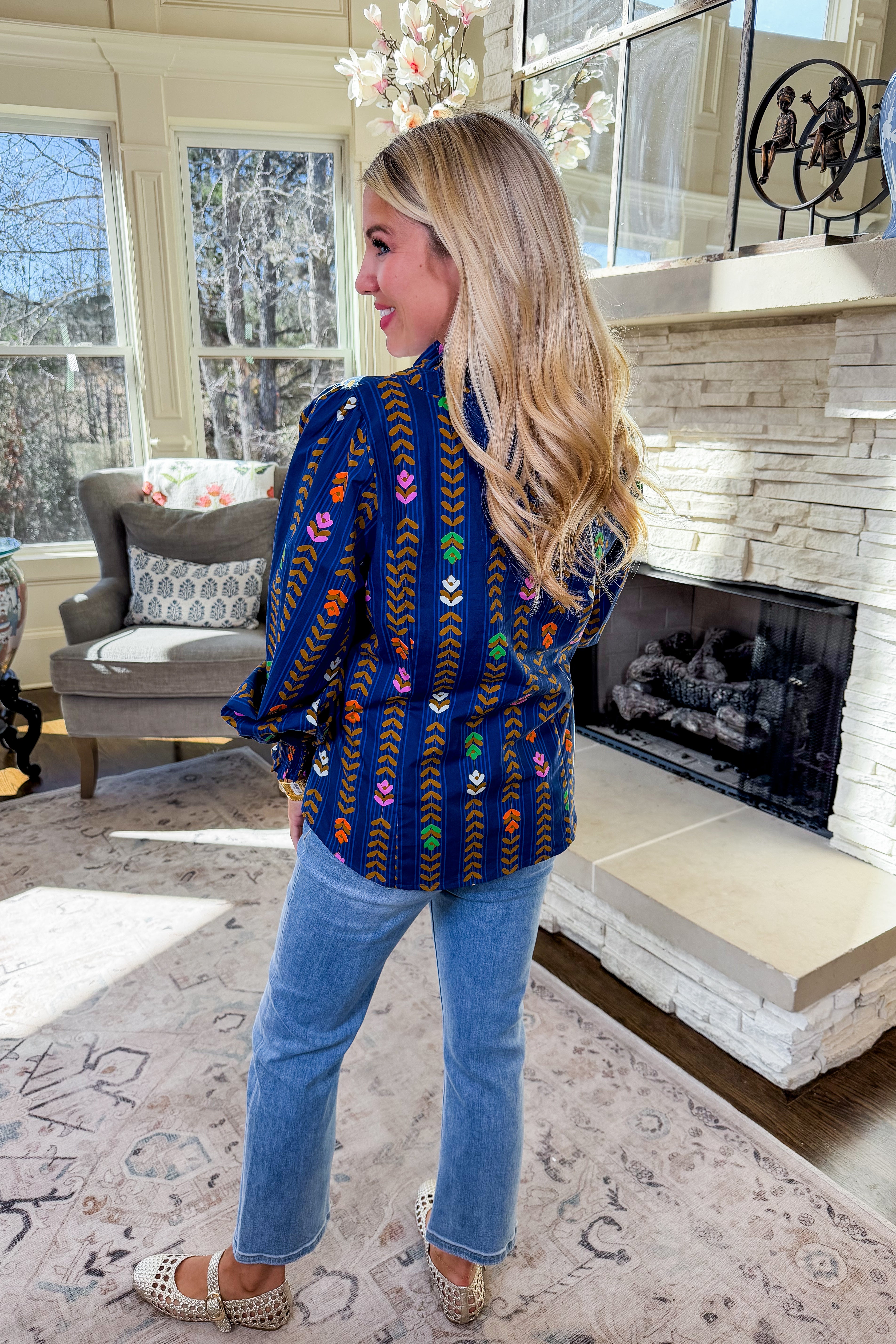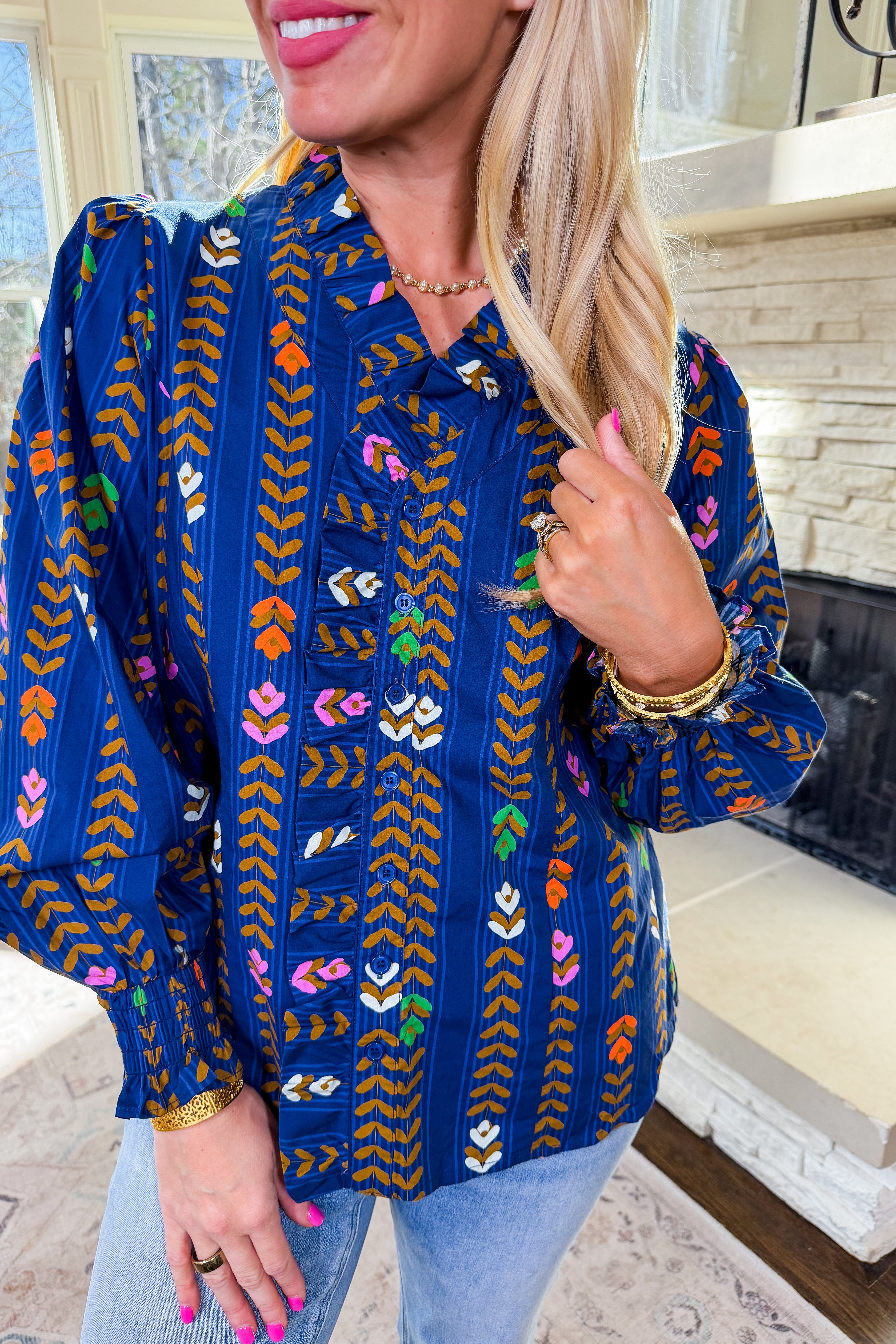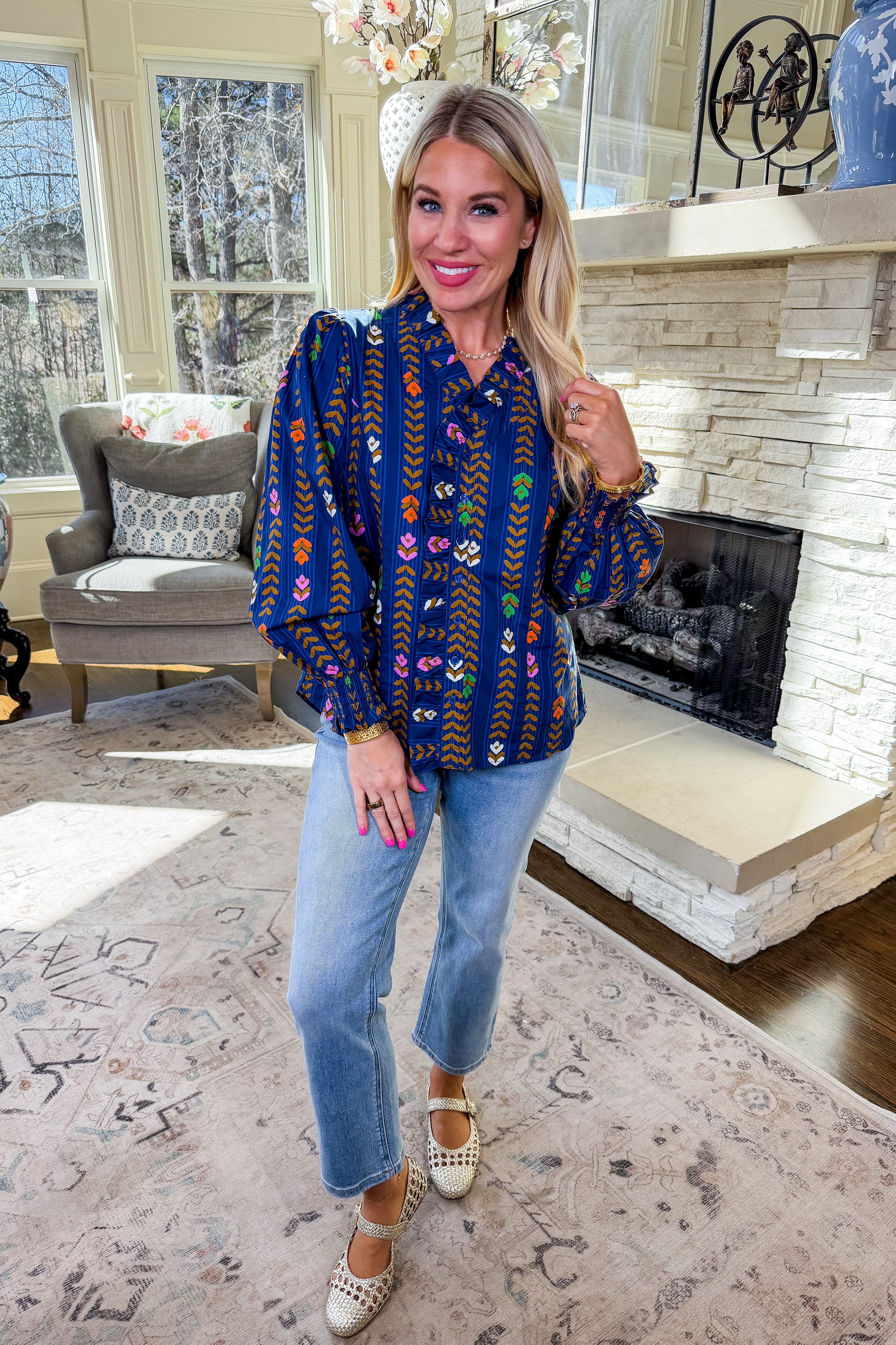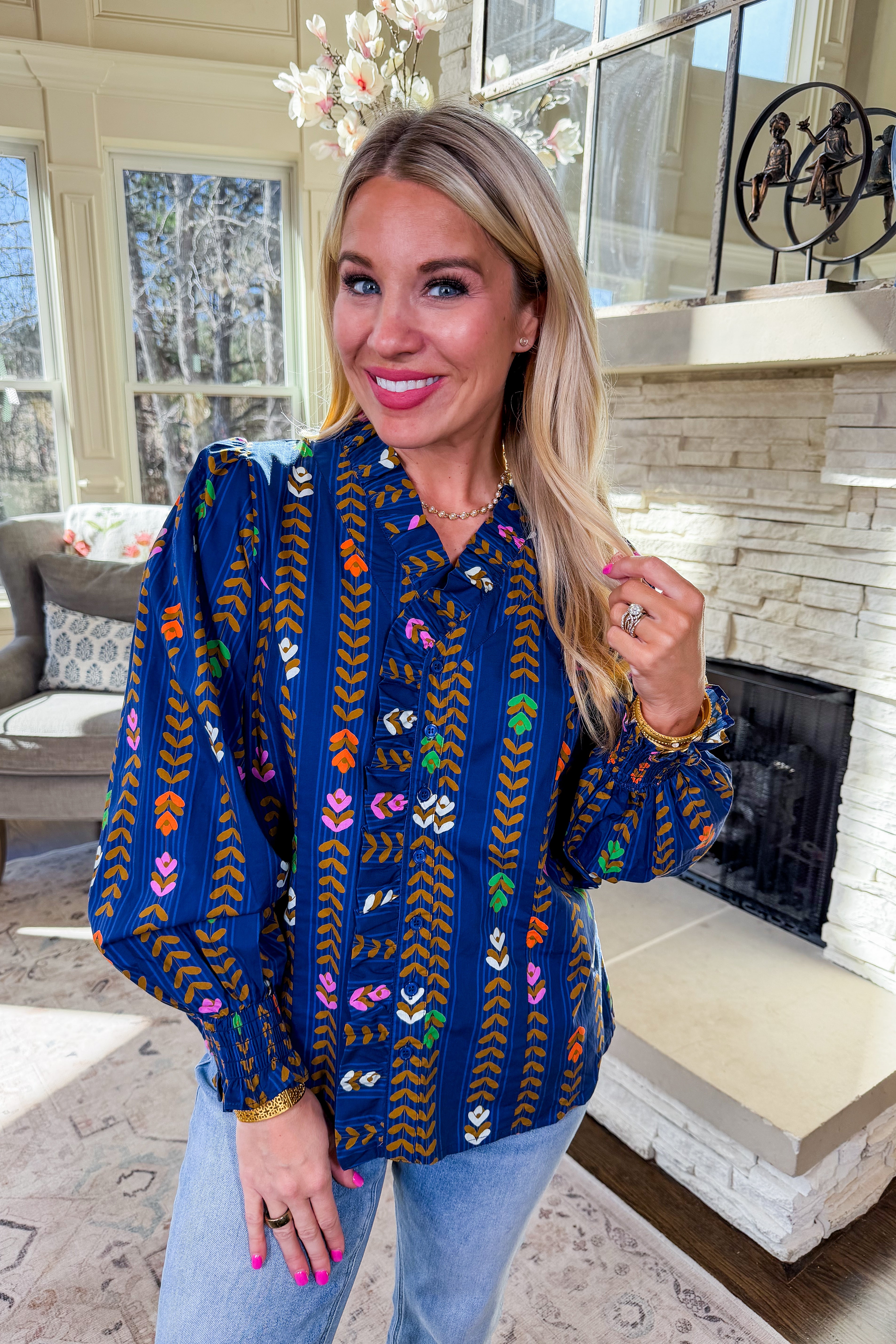 Romantic florals meet effortless charm in the Juliette Top . Designed in a midnight tone with cream and blush blooms, this Umgee favorite features a ruffled v-neckline, delicate button-front detail, and an easy relaxed fit. Perfect for pairing with denim or skirts for a feminine, fall-forward look.