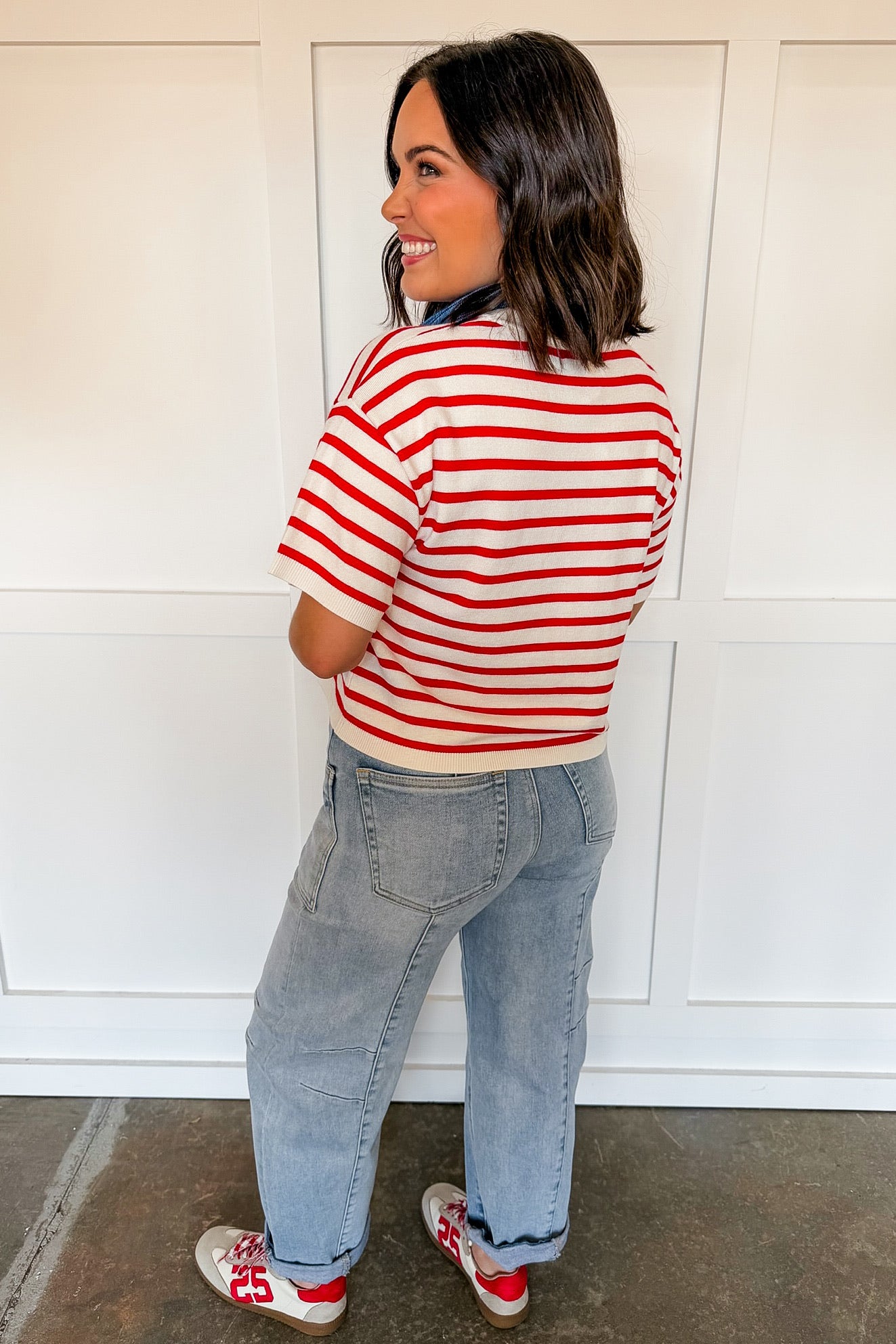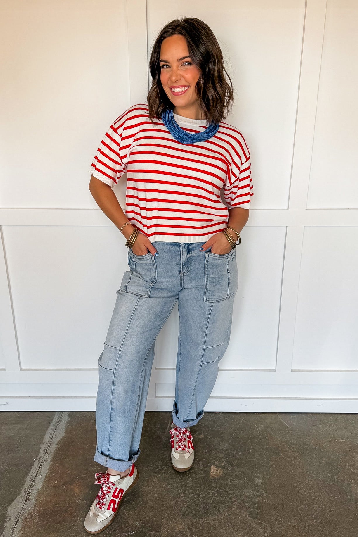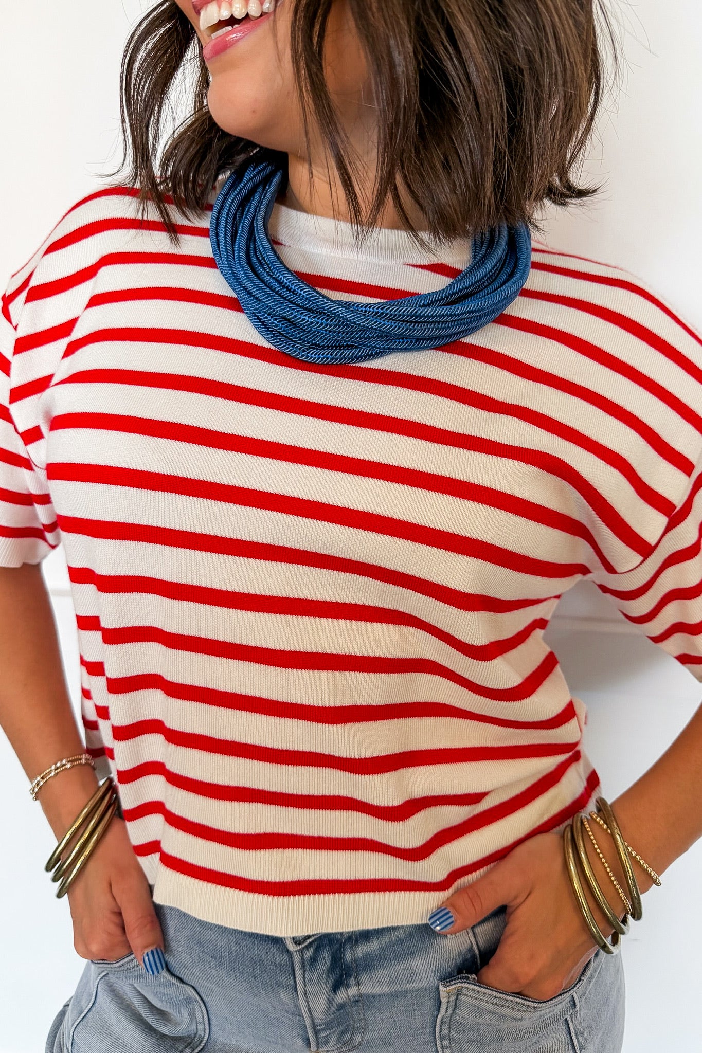 Easy, classic, and effortlessly cute — the Everyday Stripe Cropped Top is the kind of piece you'll reach for again and again. Featuring a timeless stripe pattern with a relaxed cropped fit, this top brings a fresh and casual feel to any outfit. The soft knit fabric keeps it comfortable while the slightly boxy silhouette makes it perfect for pairing with high-waisted denim, shorts, or casual pants. Whether you're running errands, meeting friends for lunch, or heading out for the weekend, this top is an easy go-to for simple, everyday style.