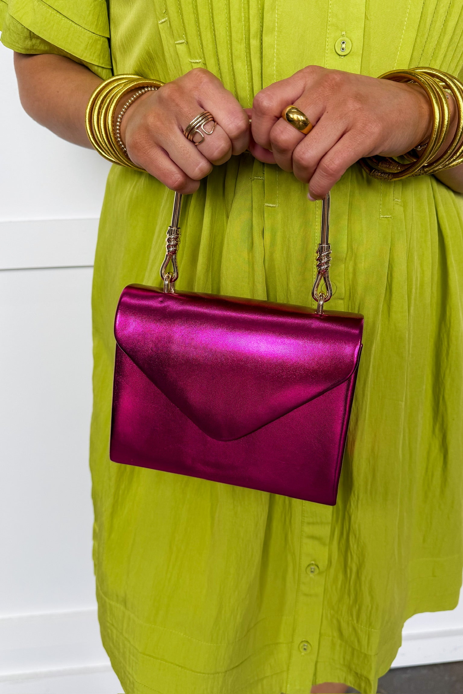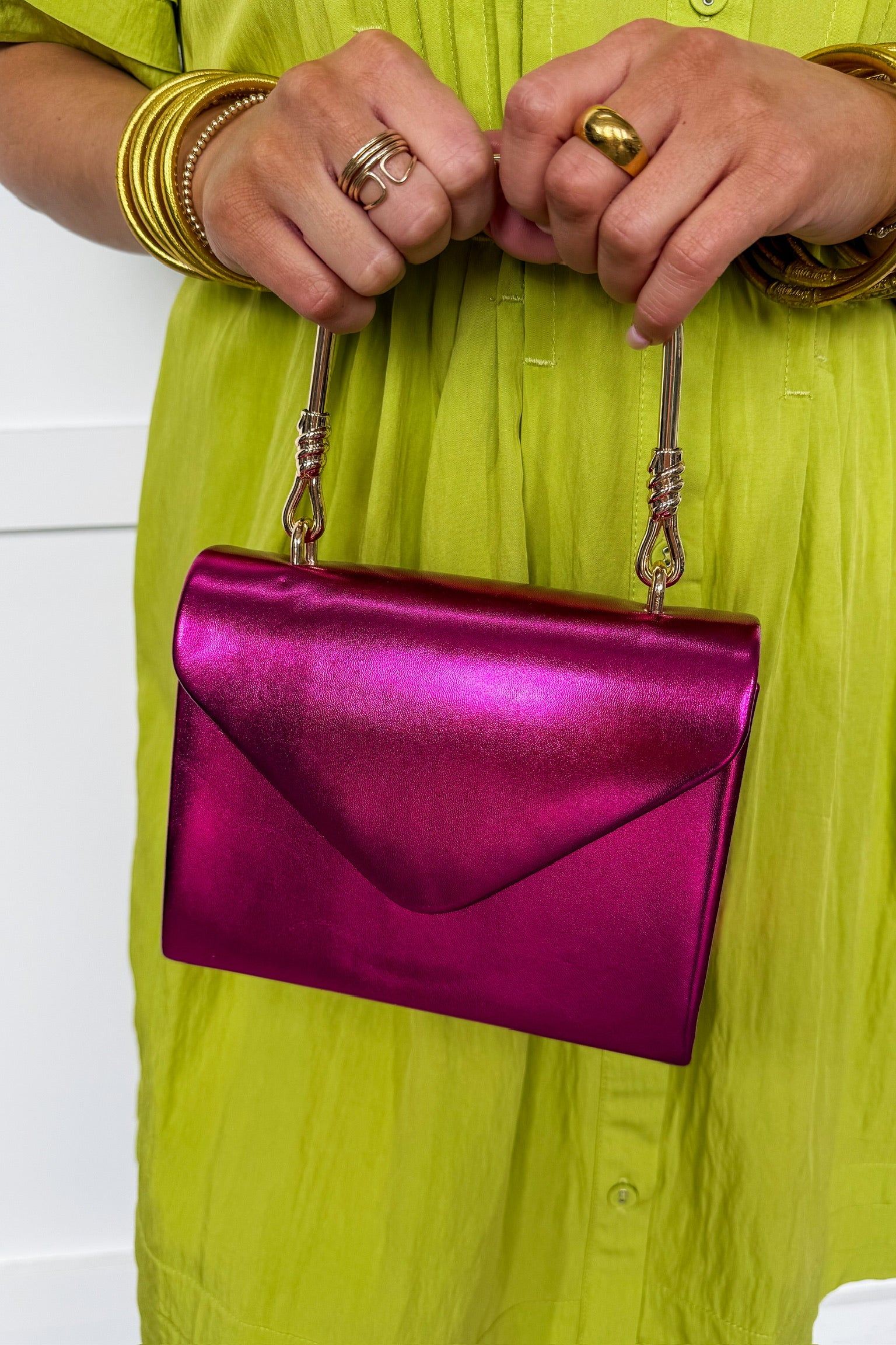 Meet your new go-to glam bag — bold, shiny, and guaranteed to turn heads. This metallic structured purse is the perfect statement accessory for nights out, date nights, concerts, girls trips, or anytime you want a pop of personality in your outfit. With a luxe gold top handle + optional chain strap, it easily transitions from classy hand-carry to crossbody convenience. Small but mighty — it fits all the essentials (phone, cards, lip gloss) without the bulk.